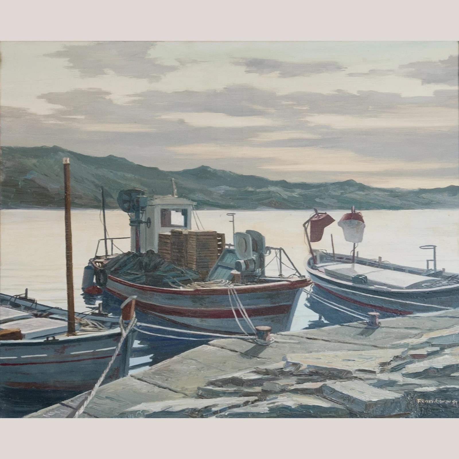 This finely rendered maritime scene, signed and dated 1994, depicts a tranquil grouping of fishing boats moored along a stone jetty with a calm expanse of water stretching toward distant hills. The painter employs a cool, harmonious palette of layered blues, soft greys, and gentle earth tones to evoke the stillness of early morning or late afternoon light. Confident, structured brushwork defines the vessels, nets, crates, and harbour equipment, while broader, more atmospheric strokes shape the sky and reflective water. The balanced composition and subtle tonal gradation place the work within the tradition of late-20th-century Mediterranean realism, emphasising clarity, calm, and an authentic sense of place. Its understated elegance and serene coastal mood make it a strong focal point for refined spaces.