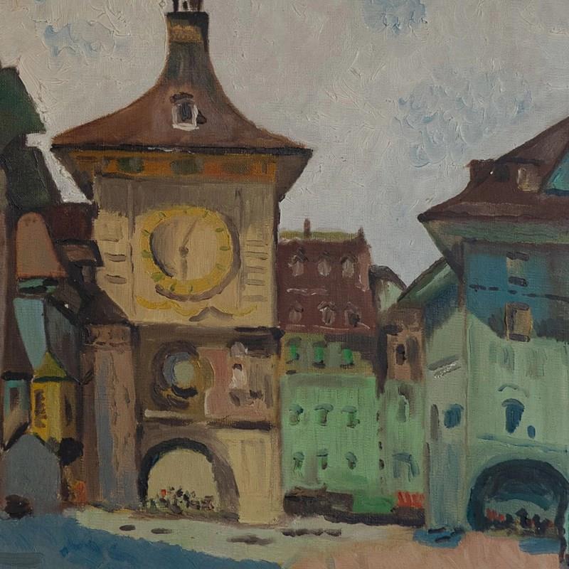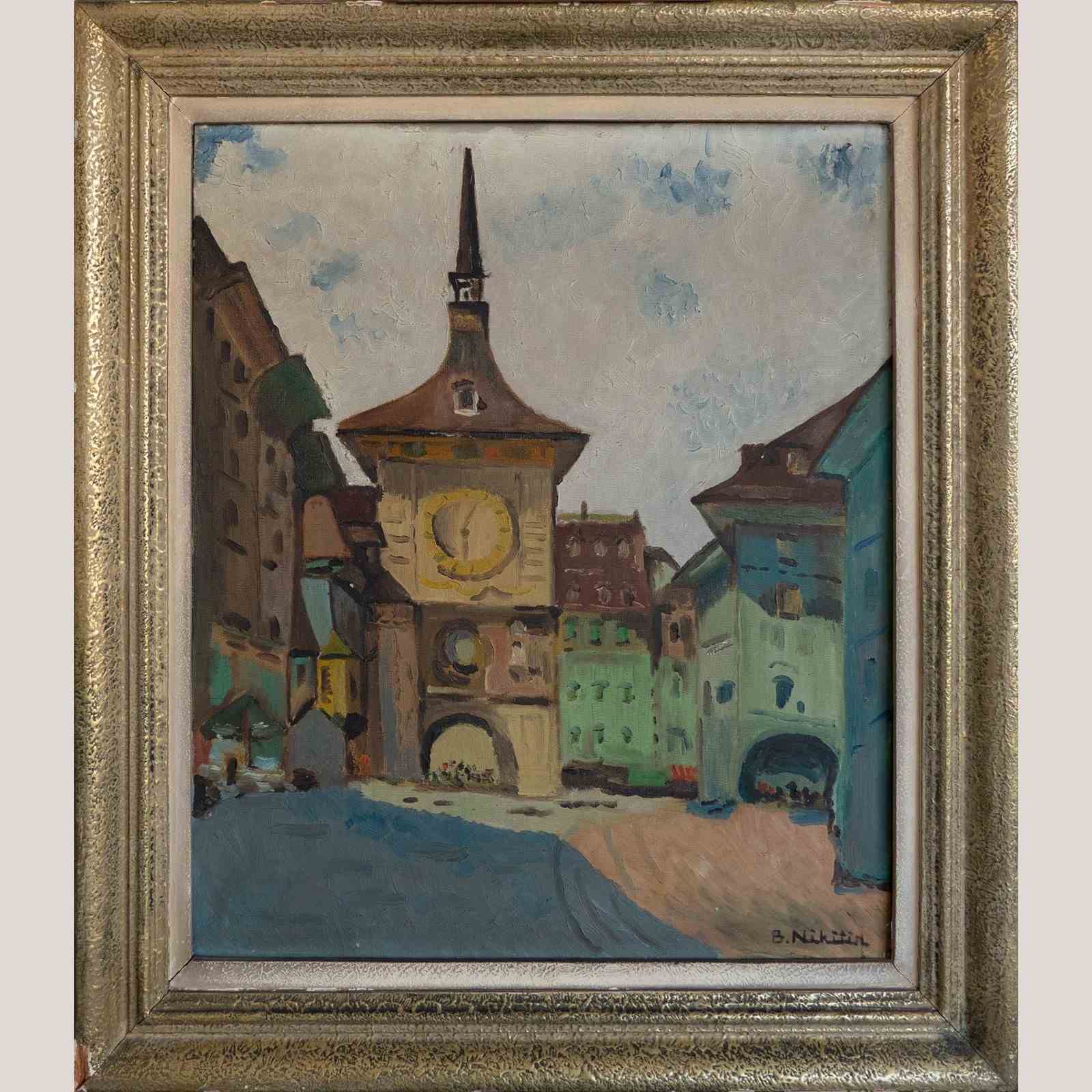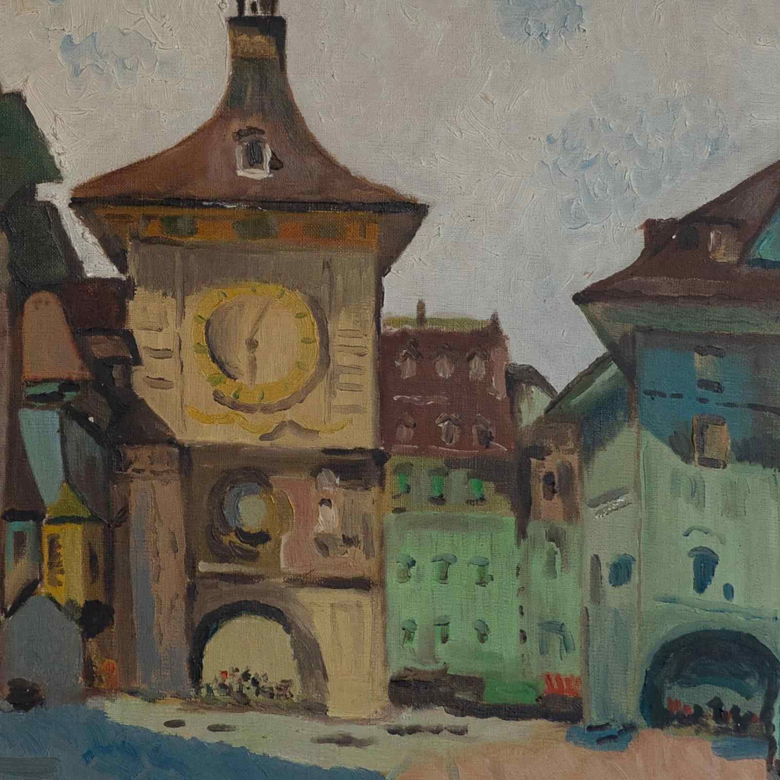Mid-Century Berne Clock Tower Cityscape – Original Oil Painting