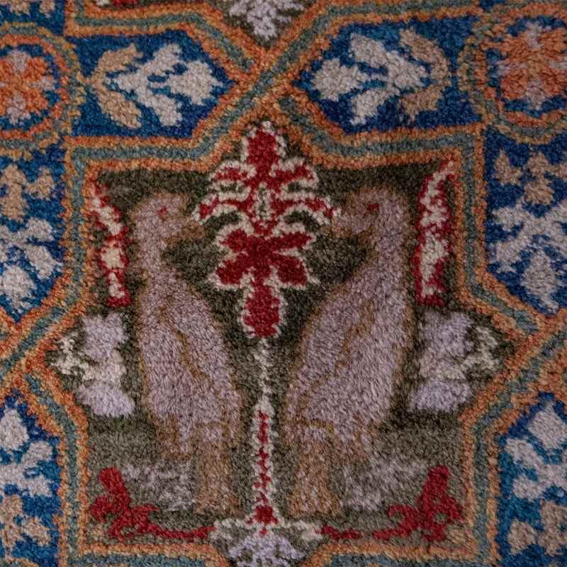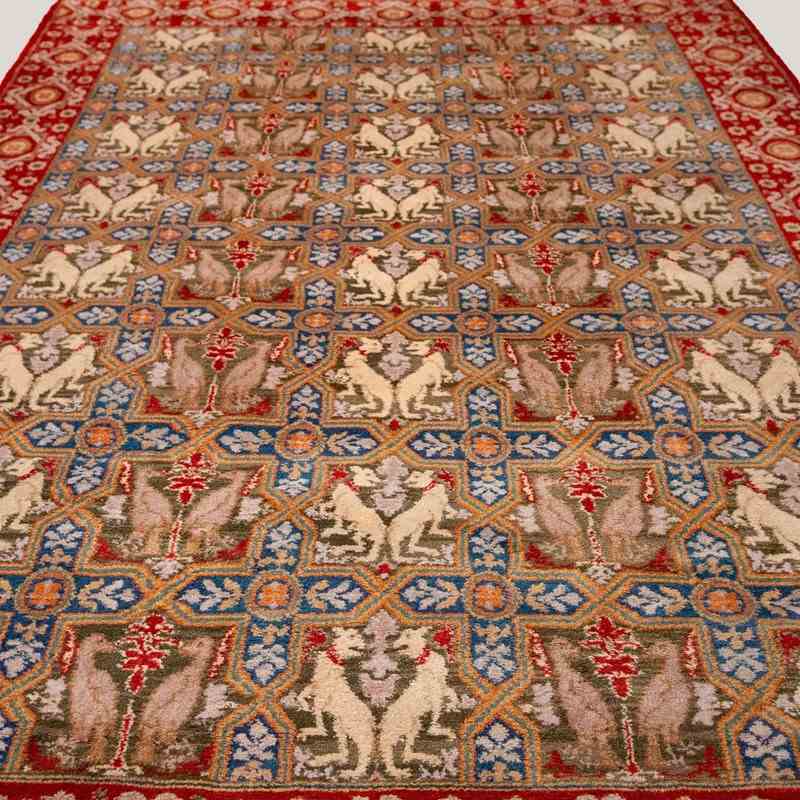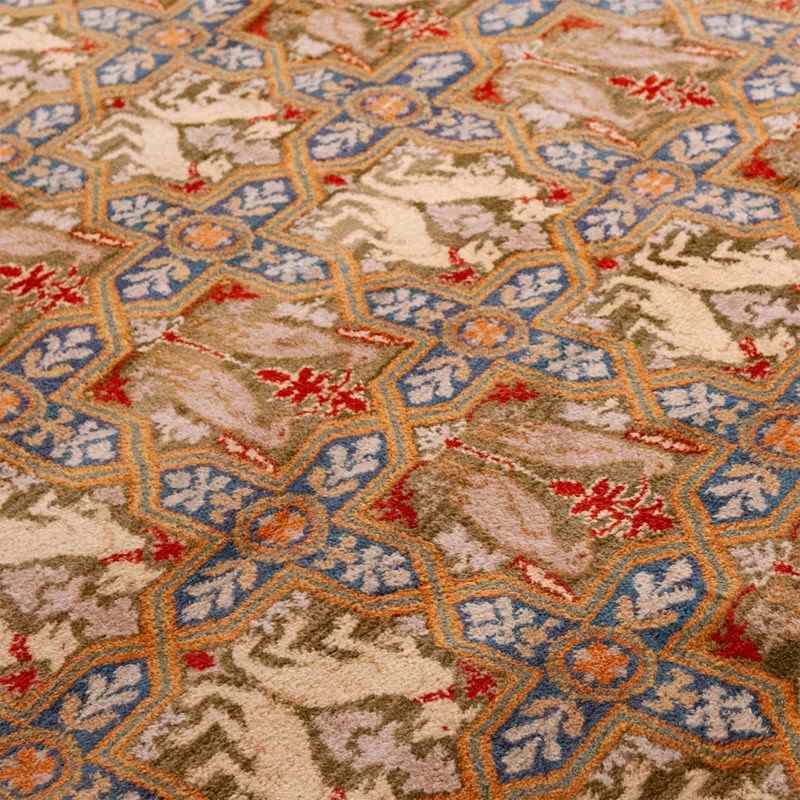 This very large hand-knotted Spanish wool rug presents a striking allover field of repeating heraldic animal motifs arranged within an interlocking geometric lattice, executed with exceptional clarity and balance. The palette combines soft mineral blues, warm terracotta reds, muted olive greens, and natural ivory tones, creating a surface that feels both richly decorative and harmoniously restrained. The dense pile and precise knotting give the motifs a sculptural presence, while subtle abrash variations lend depth and age to the composition. The design draws on historic Iberian textile traditions, where symbolic animals and geometric frameworks were used to convey strength, order, and continuity. A bold red border anchors the composition, framing the patterned field with rhythm and visual weight. The overall effect is architectural and timeless, suited to large spaces where scale and pattern can be fully appreciated, offering both visual impact and material substance.