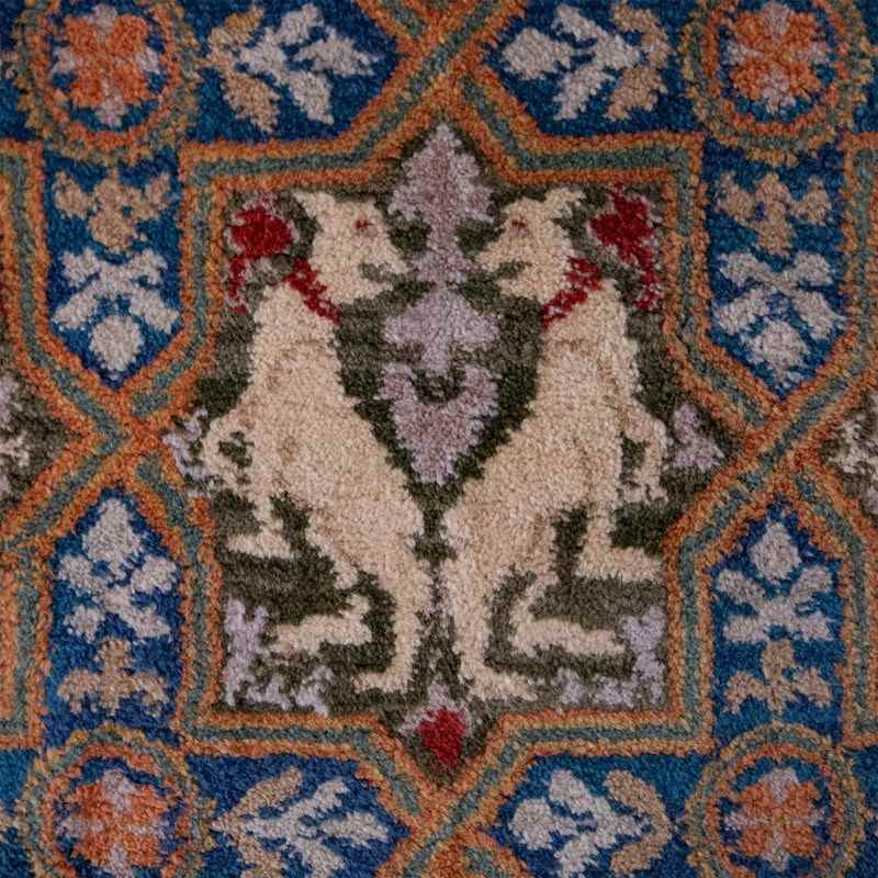 Likely produced in a regional Spanish weaving center, reflecting traditional hand-knotting techniques and historic motif vocabulary. The rug shows strong ties to folkloric and medieval-inspired animal symbolism common in Iberian decorative arts.
