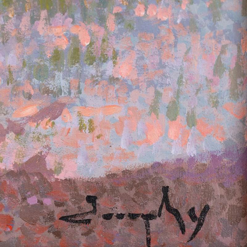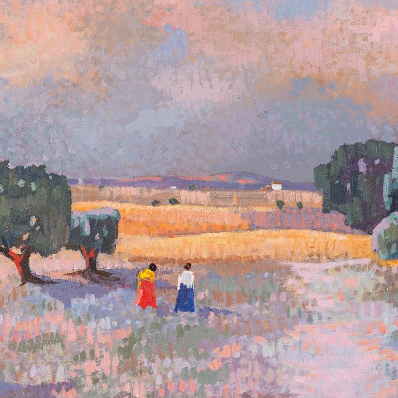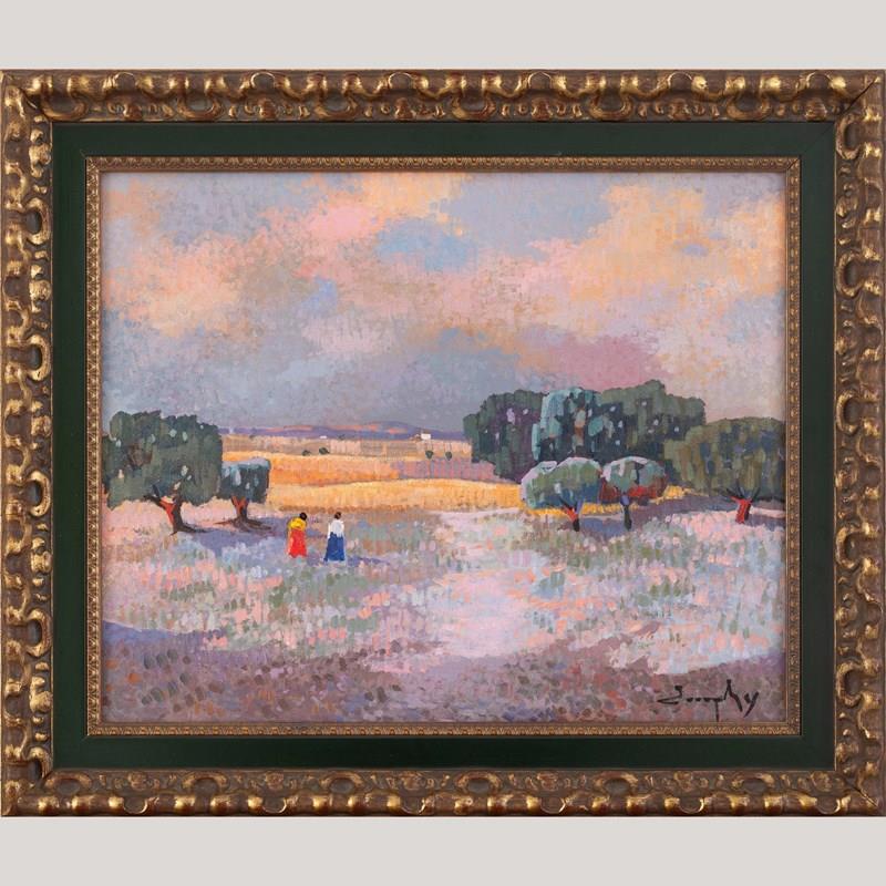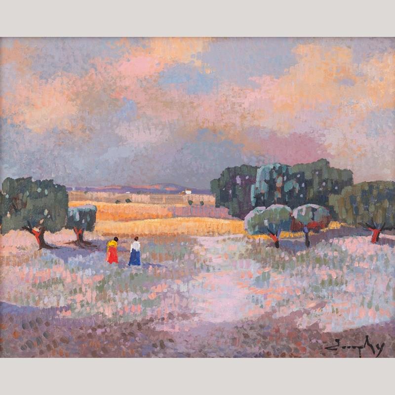 Oil on canvas depicting a sunlit rural scene, likely Mediterranean, featuring two women walking through a field surrounded by olive trees under a dynamic sky. The artist uses a vibrant palette dominated by lilacs, pinks, ochres and cool greens to evoke the warmth of the landscape and the softness of natural light. The composition suggests an artist attentive to color relationships, light atmosphere, and the formal balance between human presence and the land.
