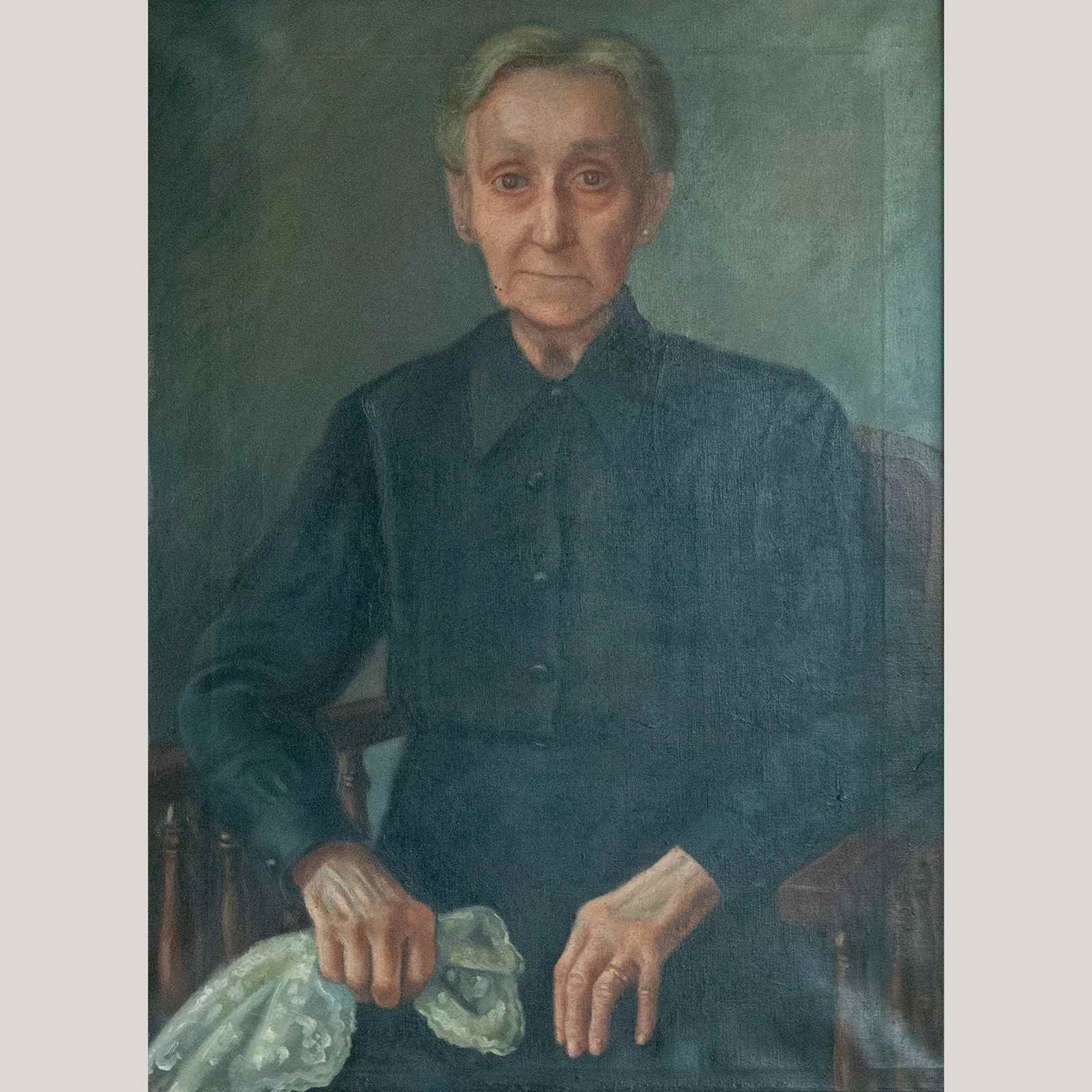 A formal seated portrait of an elderly woman dressed in black, set against a muted green background. She holds a lace handkerchief in her lap and gazes directly forward with a calm, introspective expression. The artist’s technique demonstrates refined modeling of facial features and hands, with a subdued tonal range typical of early 20th-century academic realism.