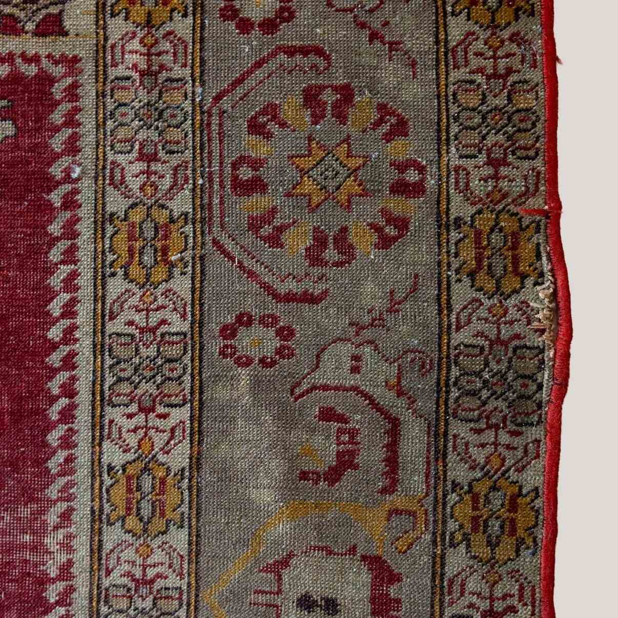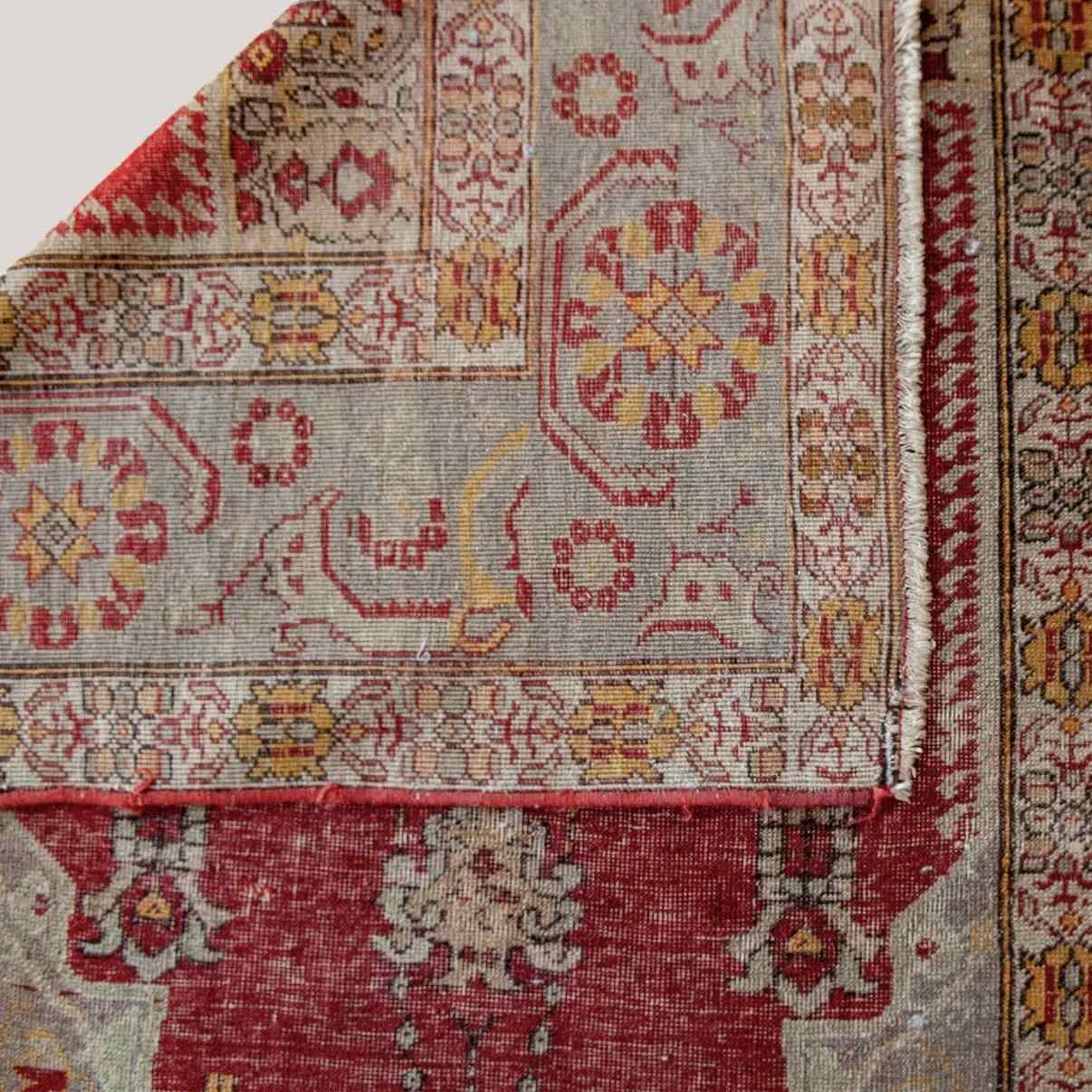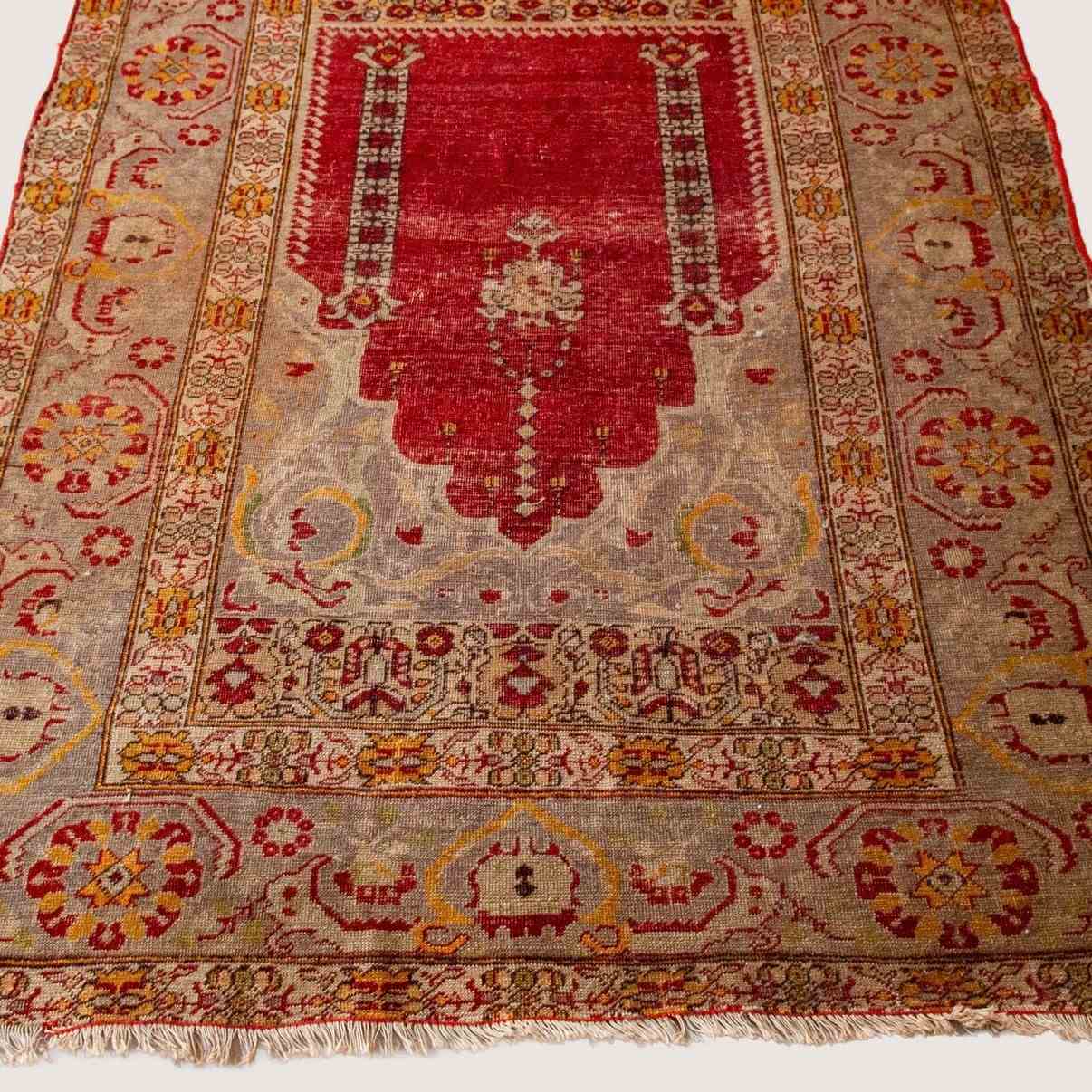 This vintage Turkish hand-knotted prayer rug features a classical composition organized around a pointed mihrab arch, symbolizing a sacred space for devotional practice. The central red field is framed by layered borders filled with geometric medallions, floral rosettes, and stylized vegetal forms, all rendered in a restrained palette of madder red, soft greys, muted golds, and earthy ochres. The drawing is precise yet subtly irregular, reflecting hand craftsmanship and regional workshop traditions. Woven in wool, likely on a cotton or wool foundation, the surface shows gentle wear and tonal variation consistent with age and use. The balance between architectural structure and decorative detail aligns with Turkish prayer rug traditions associated with weaving centers such as Kayseri, Gördes, or Sivas, where symbolism, proportion, and tactile richness were integral to both spiritual and domestic settings.
