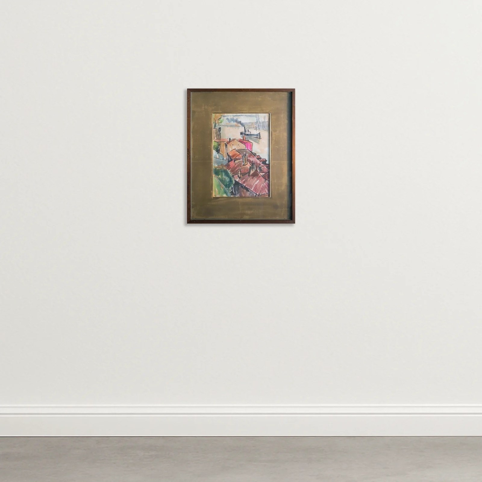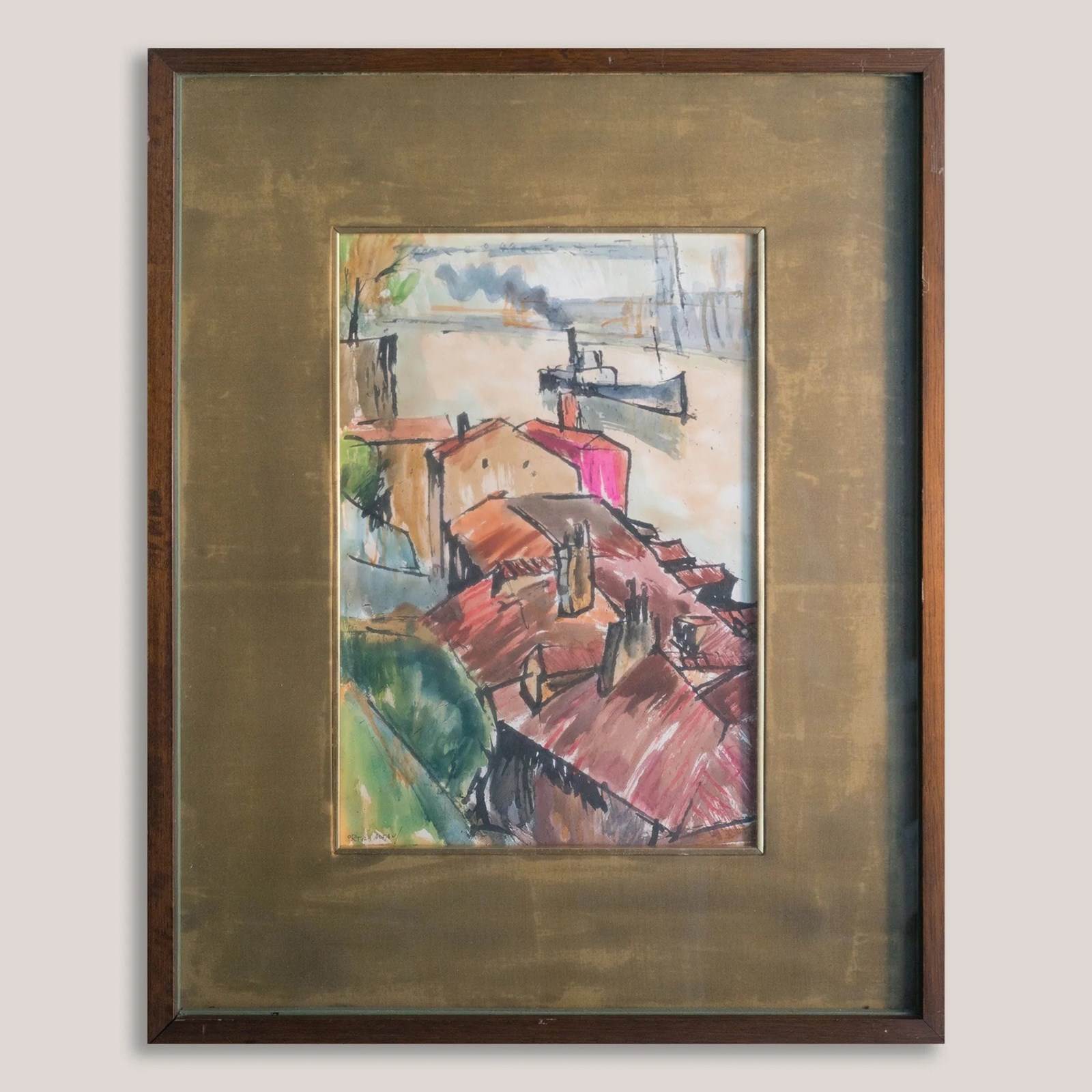 Rafael Ortiz Alfau presents a dynamic harbour view in this original watercolour, depicting clustered red-roofed buildings overlooking a calm waterfront where a small steam vessel moves across the bay. The composition emphasizes framing and perspective, highlighting the relationship between the built environment and the open coastal setting. Executed with bold ink outlines and fluid washes, the rooftops and harbour elements are simplified into expressive forms influenced by Cubist and Impressionist traditions. Alfau was often described as a virtuoso of colour, using single, confident strokes to define complex architectural structures and atmospheric coastal space.