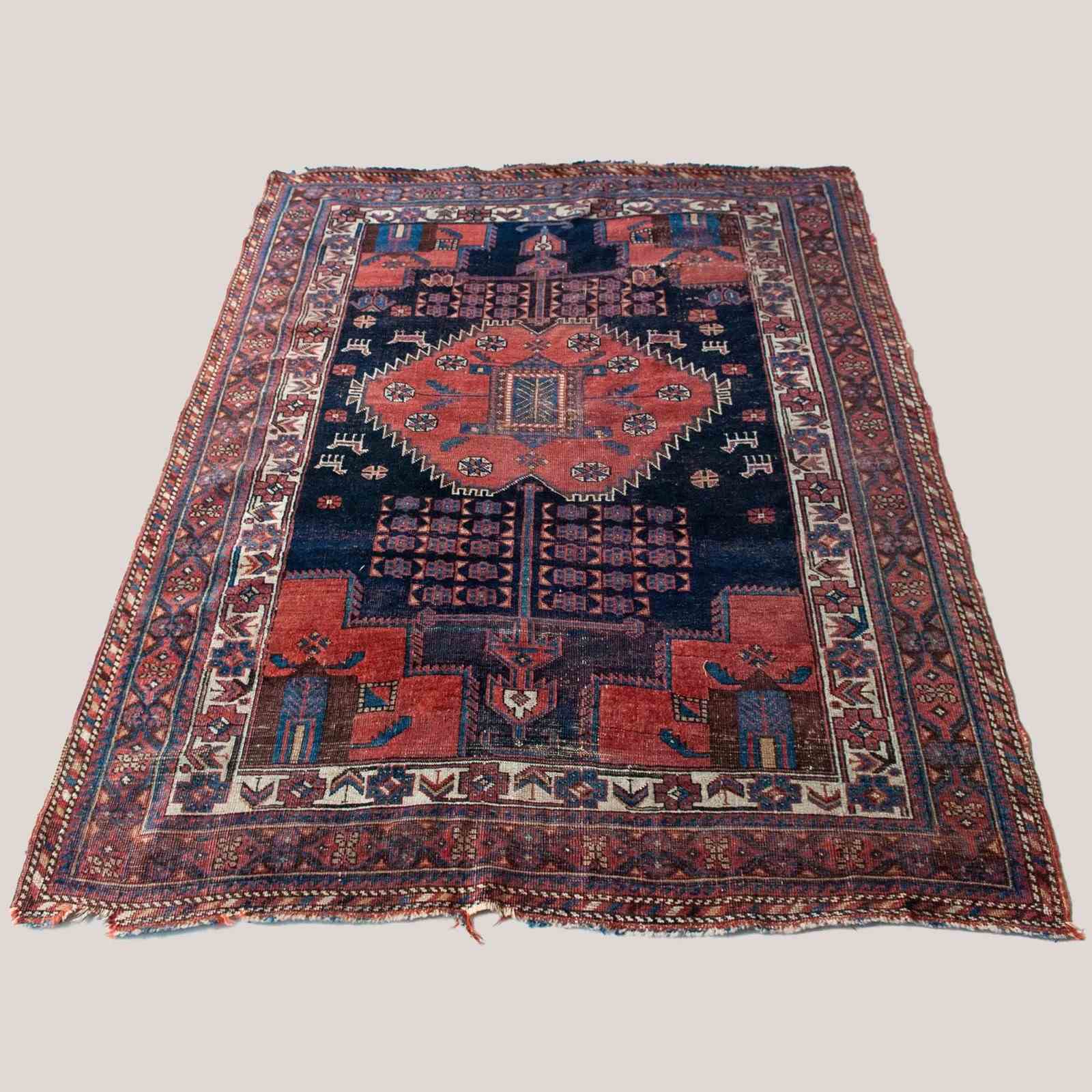 This hand-knotted wool rug, produced by Afshar weavers of South Persia, presents a rare tribal composition centred on a stepped medallion filled with stylised rosettes, angular leaf forms, and a finely drawn inner panel. Surrounding the medallion are scattered animal figures and geometric rosettes set against a deep indigo field, creating a lively, asymmetric rhythm typical of older Afshar nomadic work. The palette is built on saturated madder red, soft mineral blues, and ivory highlights, all mellowed through age into a rich, cohesive surface. Repeating rosettes, serrated outlines, and compact knotting reveal a disciplined yet expressive design vocabulary rooted in late 19th to early 20th-century South Persian weaving. Wear, perimeter fraying, and visible foundation at points reflect long domestic use, adding authenticity to its character. This piece offers a distinctive historic presence, blending bold geometry with a warm, time-softened aesthetic that suits settings seeking texture, history, and genuine tribal craftsmanship.
