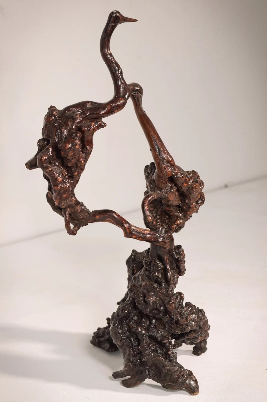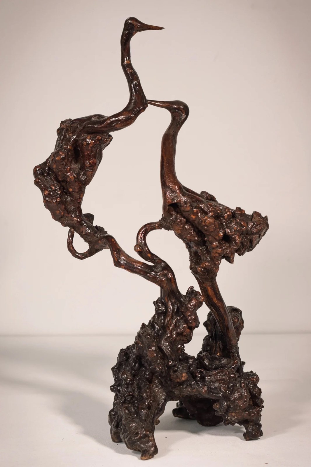 This rare Japanese root sculpture features two graceful birds—interpreted as herons or cranes—emerging naturally from the twisted contours of aged wood. The sculptor has followed the organic grain of the material, allowing its natural forms to guide the creation of the birds’ slender necks and poised silhouettes. A dark lacquered finish accentuates the smooth surfaces and textured knots, highlighting the contrast between polished and raw elements. Symbolizing longevity, peace, and harmony, the paired figures embody traditional Japanese reverence for nature and spiritual balance. Both sculptural and meditative, this work bridges craftsmanship and organic abstraction, reflecting the Zen ideal of revealing beauty within the natural world. It stands as a timeless example of the elegance and restraint characteristic of Japanese root carving.