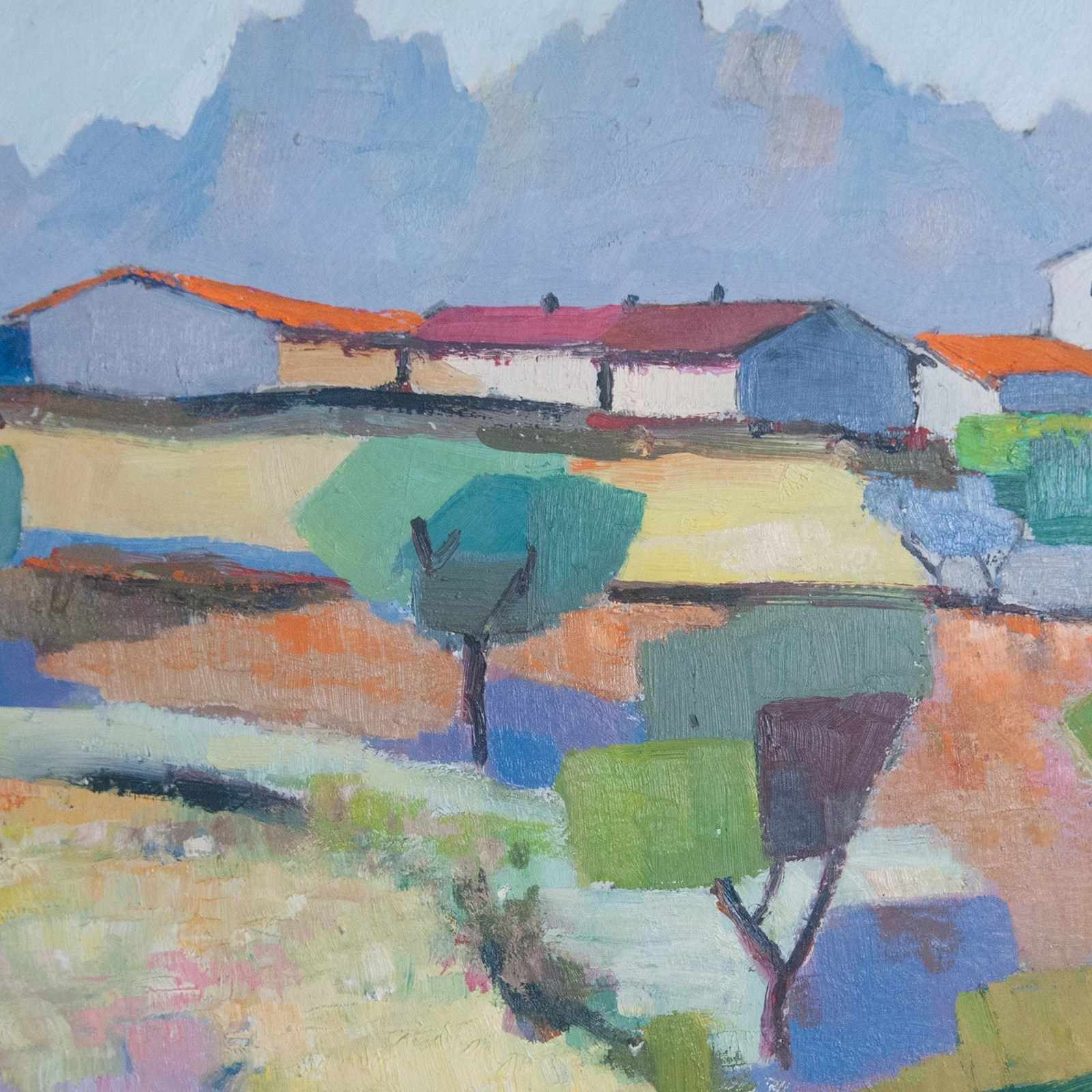 Antoni March’s Sant Salvador de Guardiola (1973) captures a luminous Catalan countryside beneath the distinctive silhouette of the Montserrat mountains. Executed with a vibrant, mosaic-like brushwork that merges Post-Impressionist structure with Fauvist color, the scene radiates both harmony and rhythm. Patches of soft yellows, greens, lilacs, and blues create a gently undulating field that leads the eye toward a cluster of rural houses, their terracotta roofs glowing under the Mediterranean light. The artist’s handling of paint—short, broken strokes and a thick impasto—reveals a confident control of tone and texture, balancing geometric precision with lyrical spontaneity. The overall mood is serene yet dynamic, suggesting both the order of cultivated land and the freedom of open air. This work perfectly embodies the Catalan modernist tradition of landscape painting, where light and color become the true subjects of the composition.