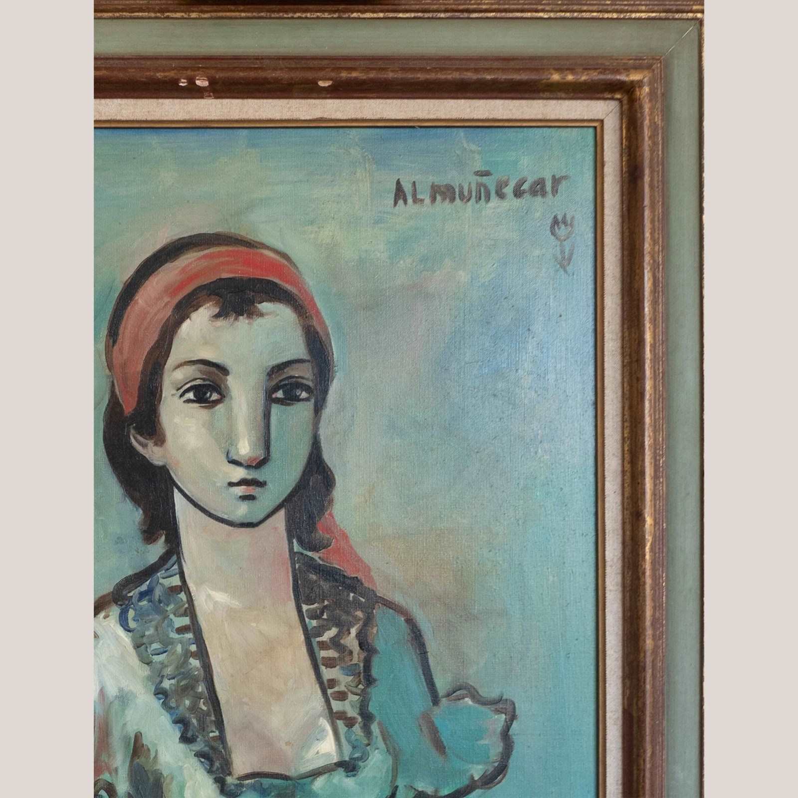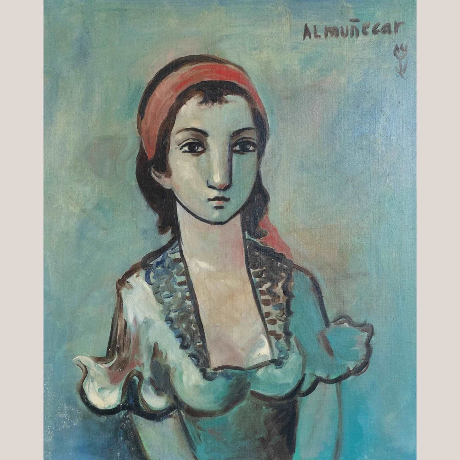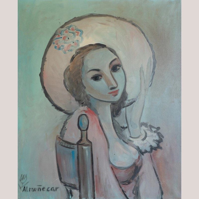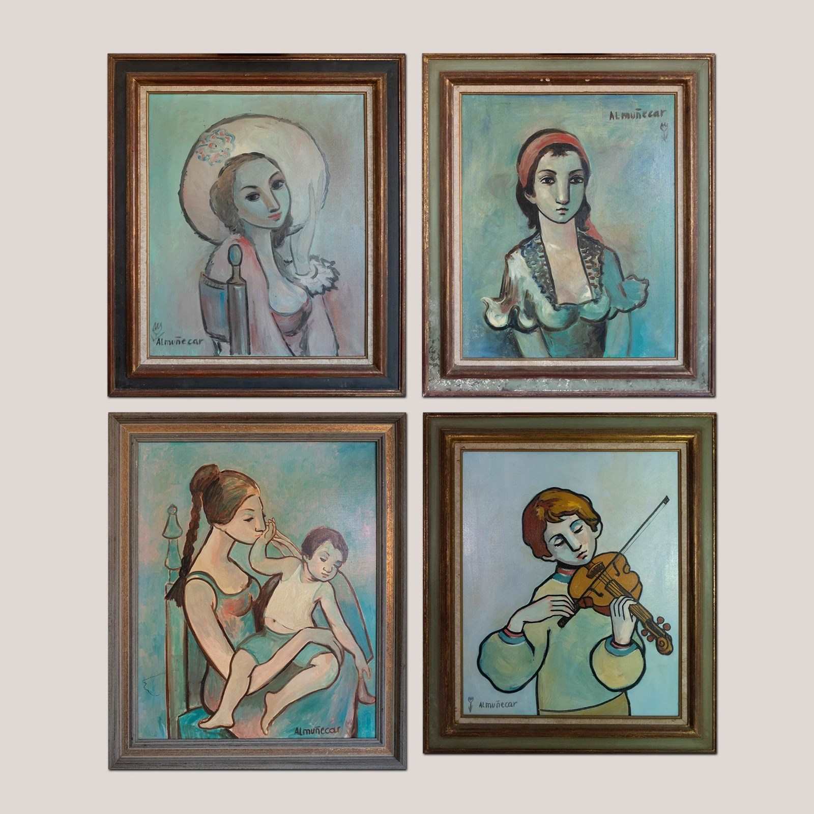 A rare and harmonious set of four large-scale mid-century oil paintings, each signed “Almuñecar,” presenting tender, stylized portraits with distinct poetic charm. United by a consistent palette of soft turquoise, sienna, and blush tones, this collection evokes the introspective beauty of modernist portraiture, reminiscent of Modigliani and Picasso’s quieter works.