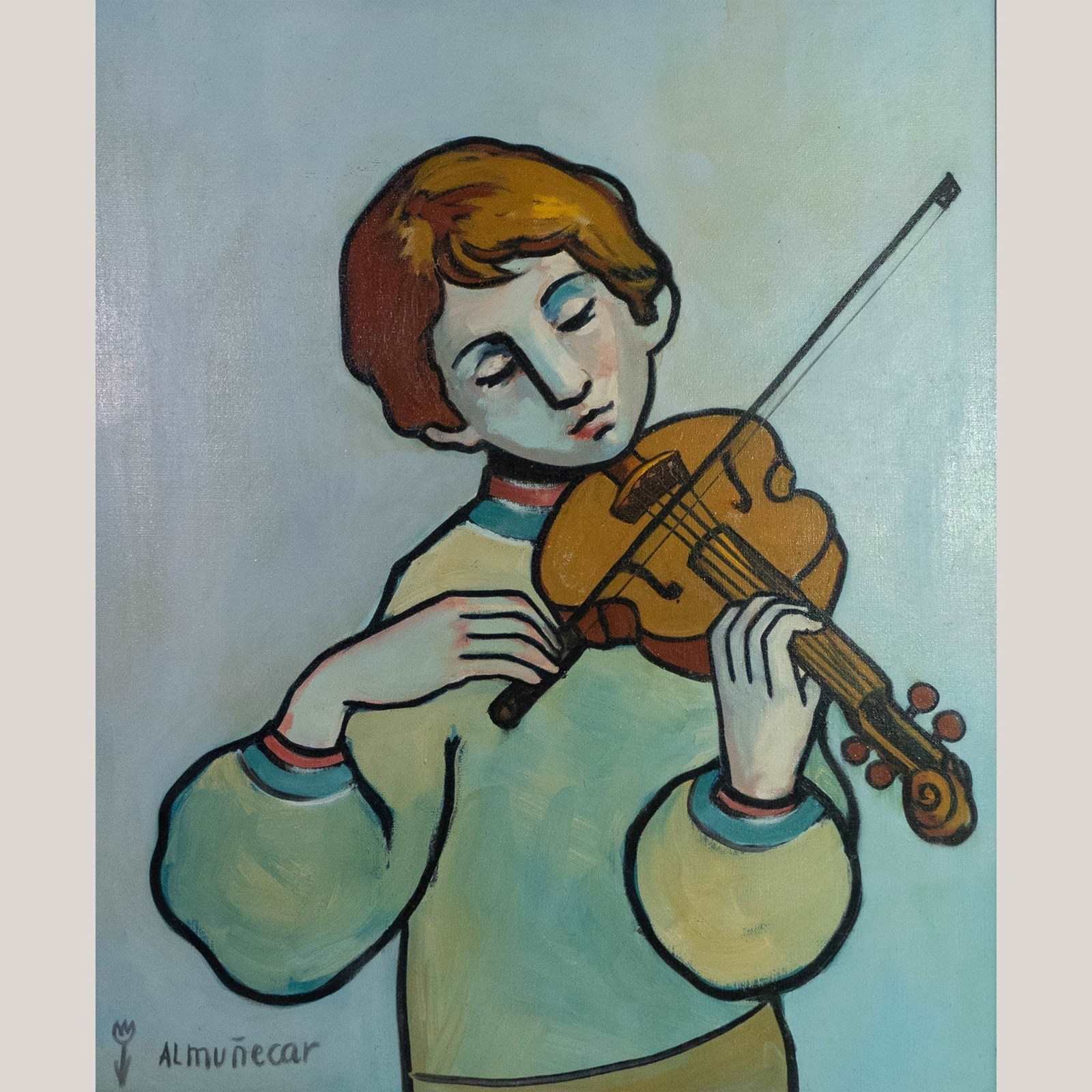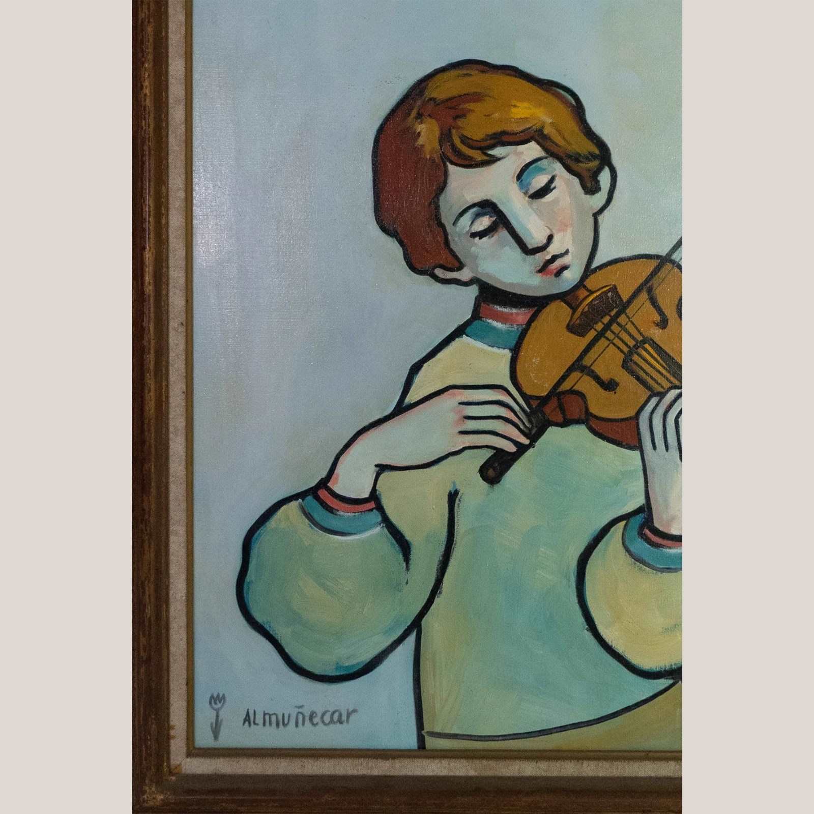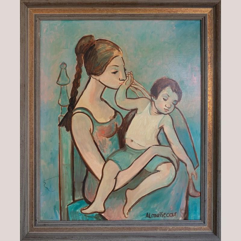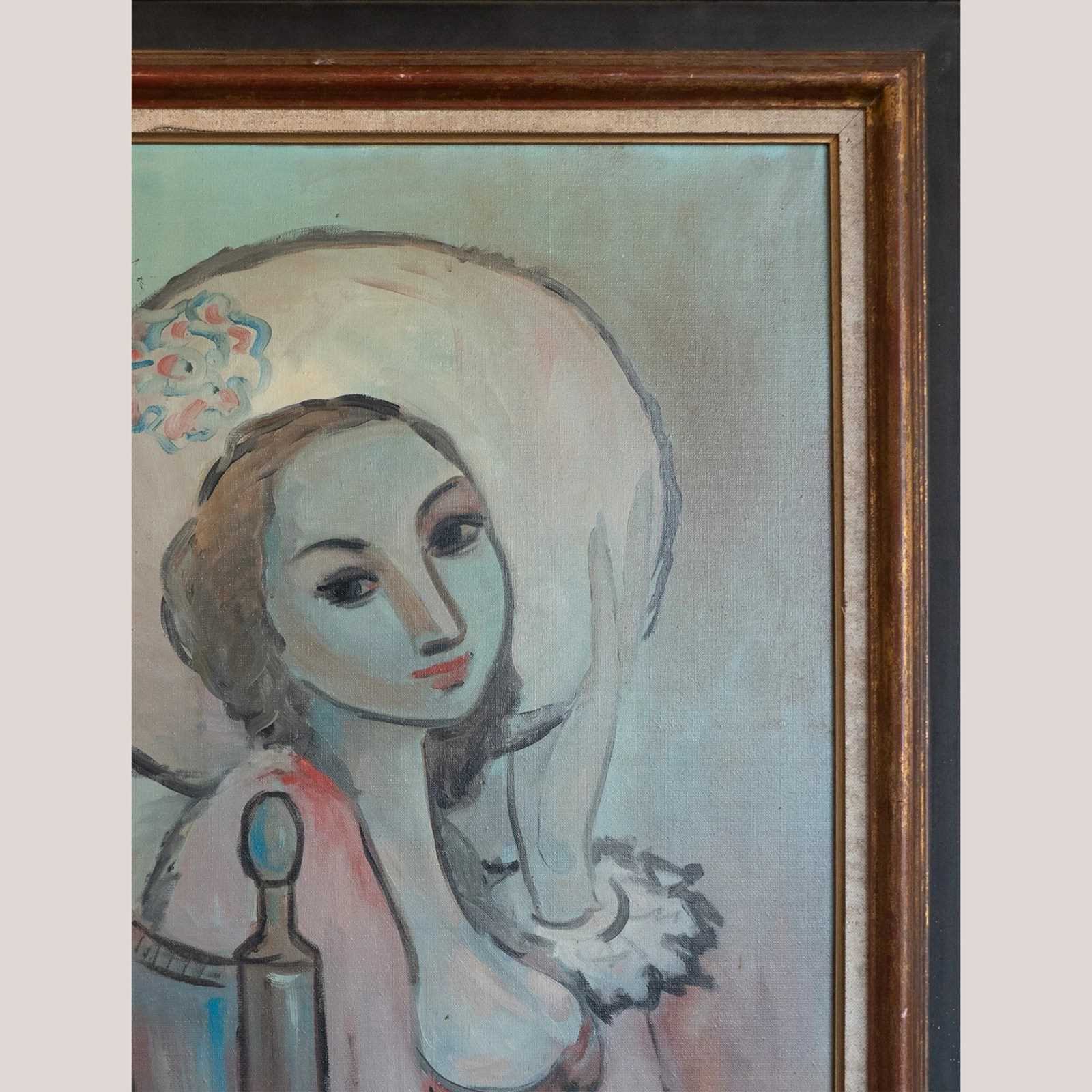 A rare and harmonious set of four large-scale mid-century oil paintings, each signed “Almuñecar,” presenting tender, stylized portraits with distinct poetic charm. United by a consistent palette of soft turquoise, sienna, and blush tones, this collection evokes the introspective beauty of modernist portraiture, reminiscent of Modigliani and Picasso’s quieter works.