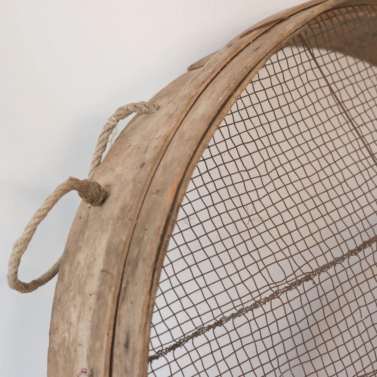 This vintage set of three wooden grain sieves showcases hand-crafted bentwood frames and finely woven wire mesh, reflecting traditional rural utility design. Each circular form displays a softly weathered surface with warm honeyed tones and subtle variations in patina, complemented by naturally oxidized metal grids. The visible rope handles and reinforcing wires emphasize their authentic working origins, while the repetition of form creates a visually balanced and sculptural grouping. Originally used for sifting flour and grain, these early 20th-century agricultural tools now function as striking decorative objects, defined by honest materials and restrained geometry. Their organic textures and neutral palette align seamlessly with rustic, wabi-sabi, and minimalist interiors, offering depth, history, and tactile character to curated residential or commercial spaces.