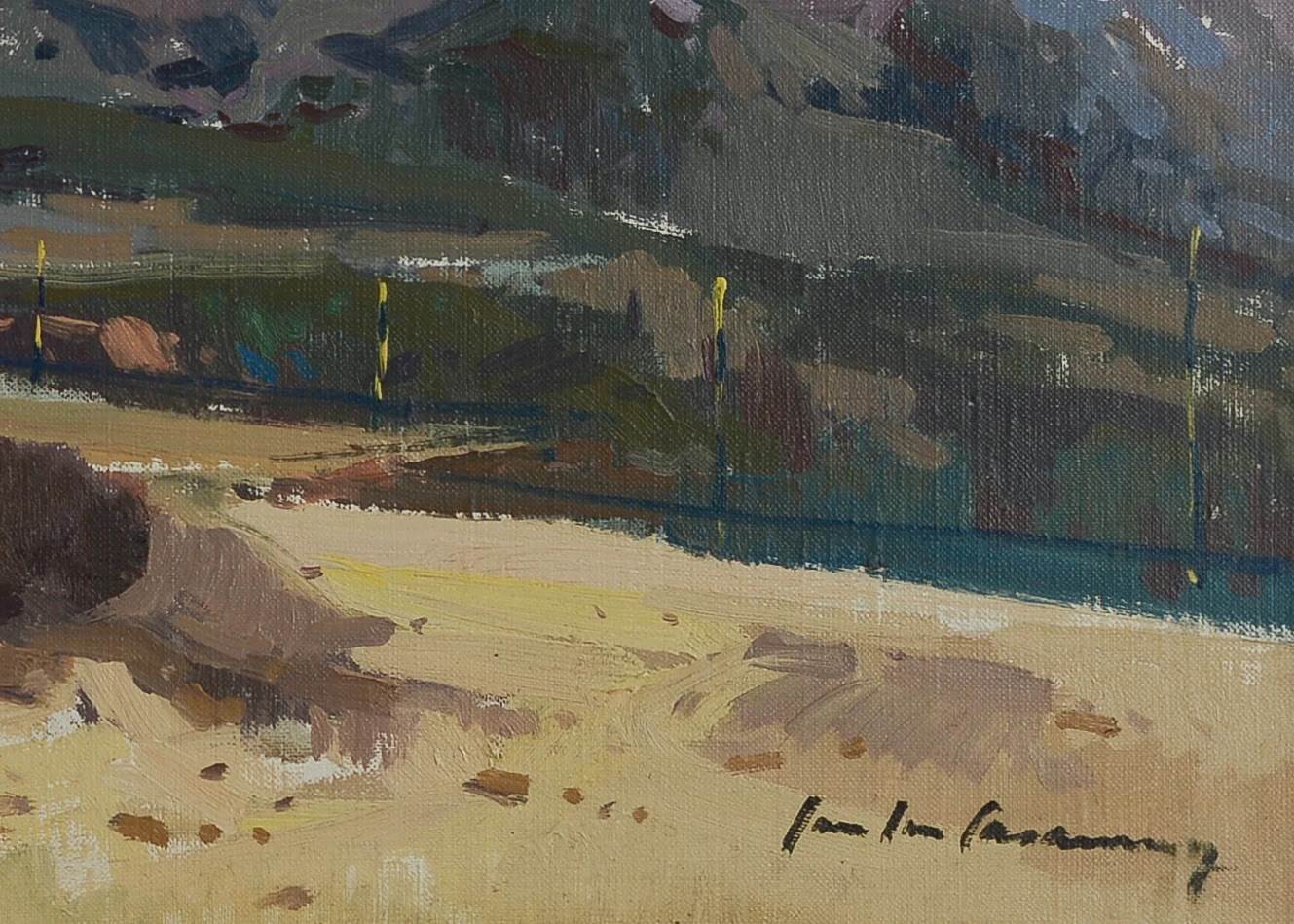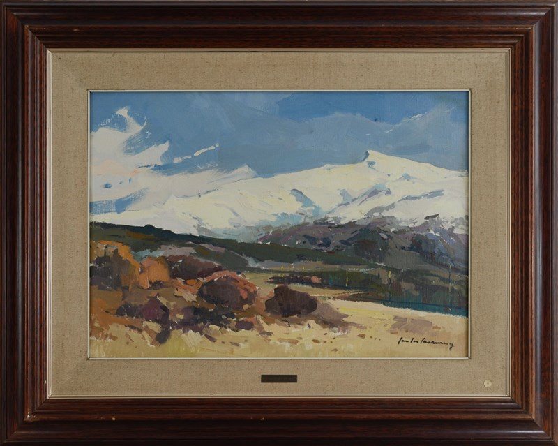 This captivating oil painting by Spanish artist José Luis Casañé Puig presents a breathtaking view of the Sierra Nevada mountain range. The composition masterfully balances warm earthy tones in the foreground with the crisp whites and cool blues of the snow-capped peaks, emphasizing the grandeur of the mountains beneath an expansive sky. Casañé Puig’s expressive brushwork and keen sense of light and shadow bring depth and vibrancy to the scene, capturing the natural beauty and atmosphere of one of Spain’s most iconic landscapes. Framed in an elegant dark wood frame with a linen mat, this piece is a testament to the artist’s skill in portraying the Spanish countryside with authenticity and emotion.