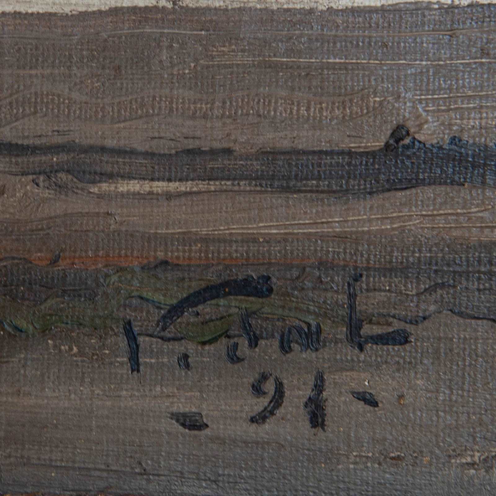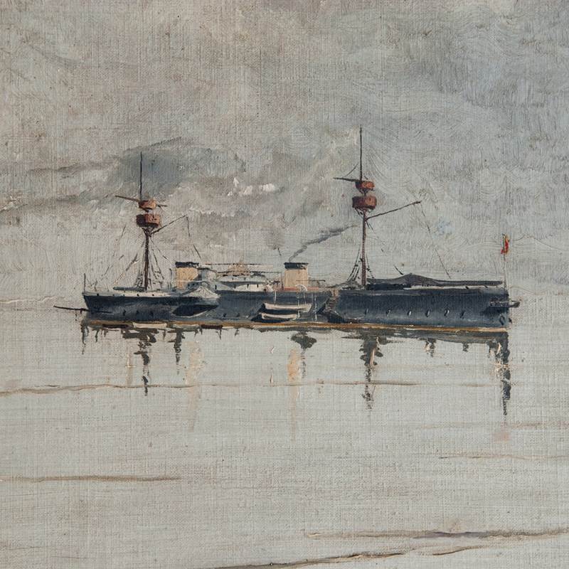 This painting by an unidentified artist portrays the Spanish steam warship Pelayo with measured maritime draftsmanship and a restrained palette of greys, blues, and muted ochres. The vessel’s distinctive pre-dreadnought configuration is clearly articulated, including its armoured hull, single funnel, and military masts, while gentle atmospheric gradations bring definition to the surrounding sea and sky. Light falls across the ship’s turreted artillery positions, echoing the formidable engineering of Pelayo, Spain’s most powerful battleship of the 1880s and a symbolic presence during the Spanish–American War era despite seeing no direct combat. The balanced geometry and steady brushwork place the painting firmly within early 20th-century maritime realism, giving it a composed historical presence suitable for refined nautical settings.