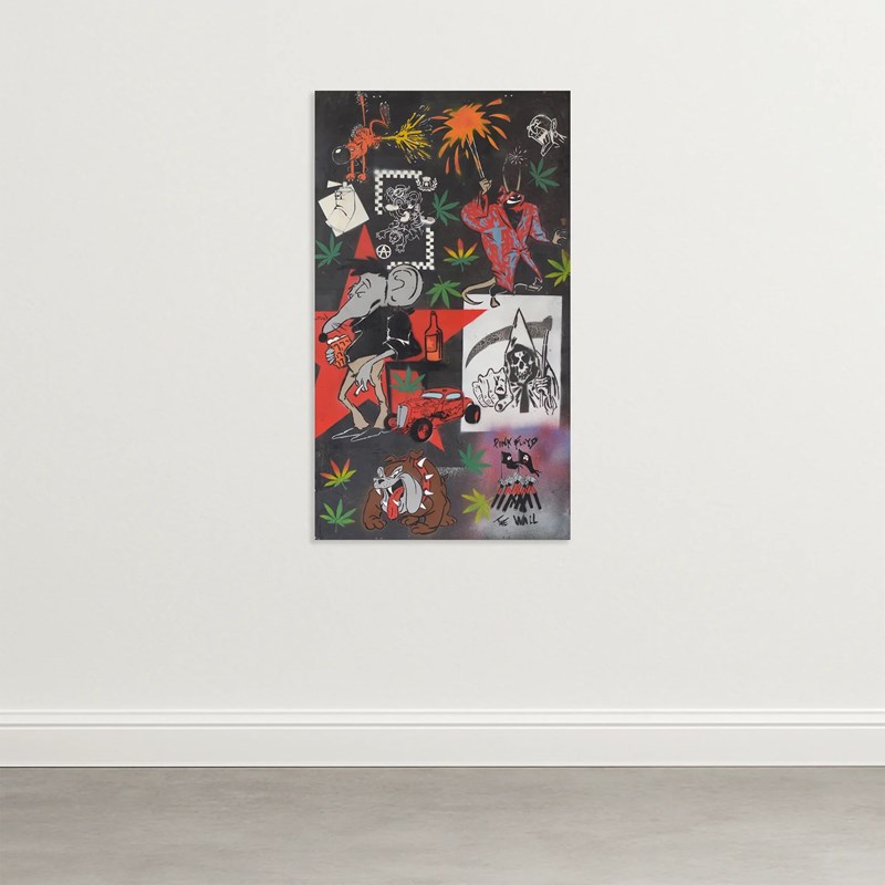 This riotous piece of Street Art incorporates an extraordinary range of Pop culture references and urban icons - from Pink Floyd to Butch the Bulldog. Size: Board: H 138.5 cm x W 79.5 cm Weight: 4.6 kg Medium: Graffiti on Metal Board