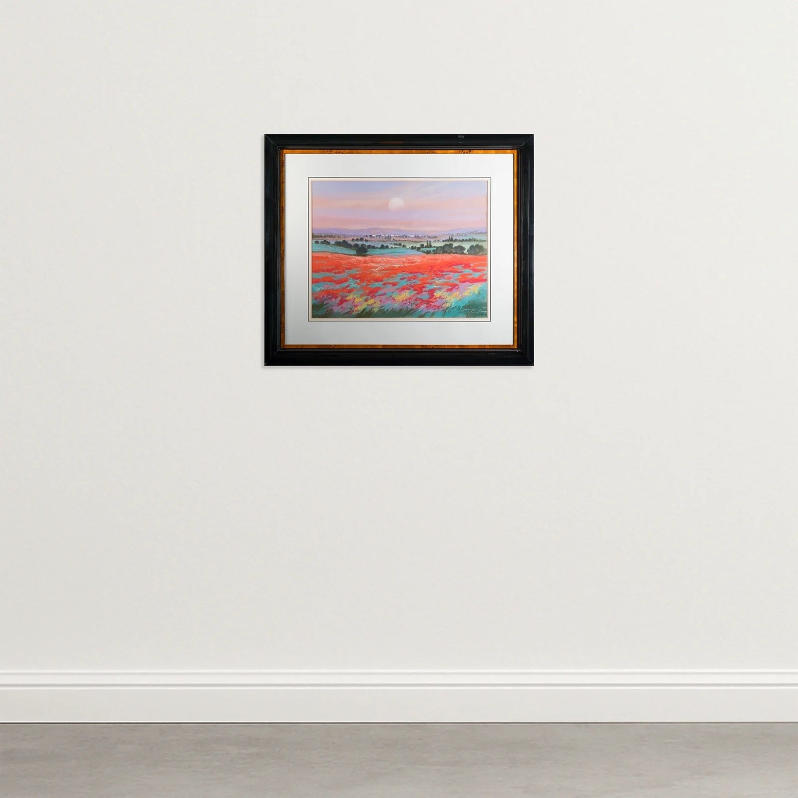 This original pastel landscape captures a panoramic view of rolling countryside bathed in the soft glow of a setting sun. Executed in richly layered pastel, the composition unfolds from a vivid foreground of crimson and coral poppy fields into tranquil bands of turquoise, lavender, and muted green, leading the eye toward a distant village beneath a luminous, mist-veiled sky. Expressive, directional strokes create movement across the flowering meadow, while the atmospheric gradation in the hills and sky conveys depth and calm.