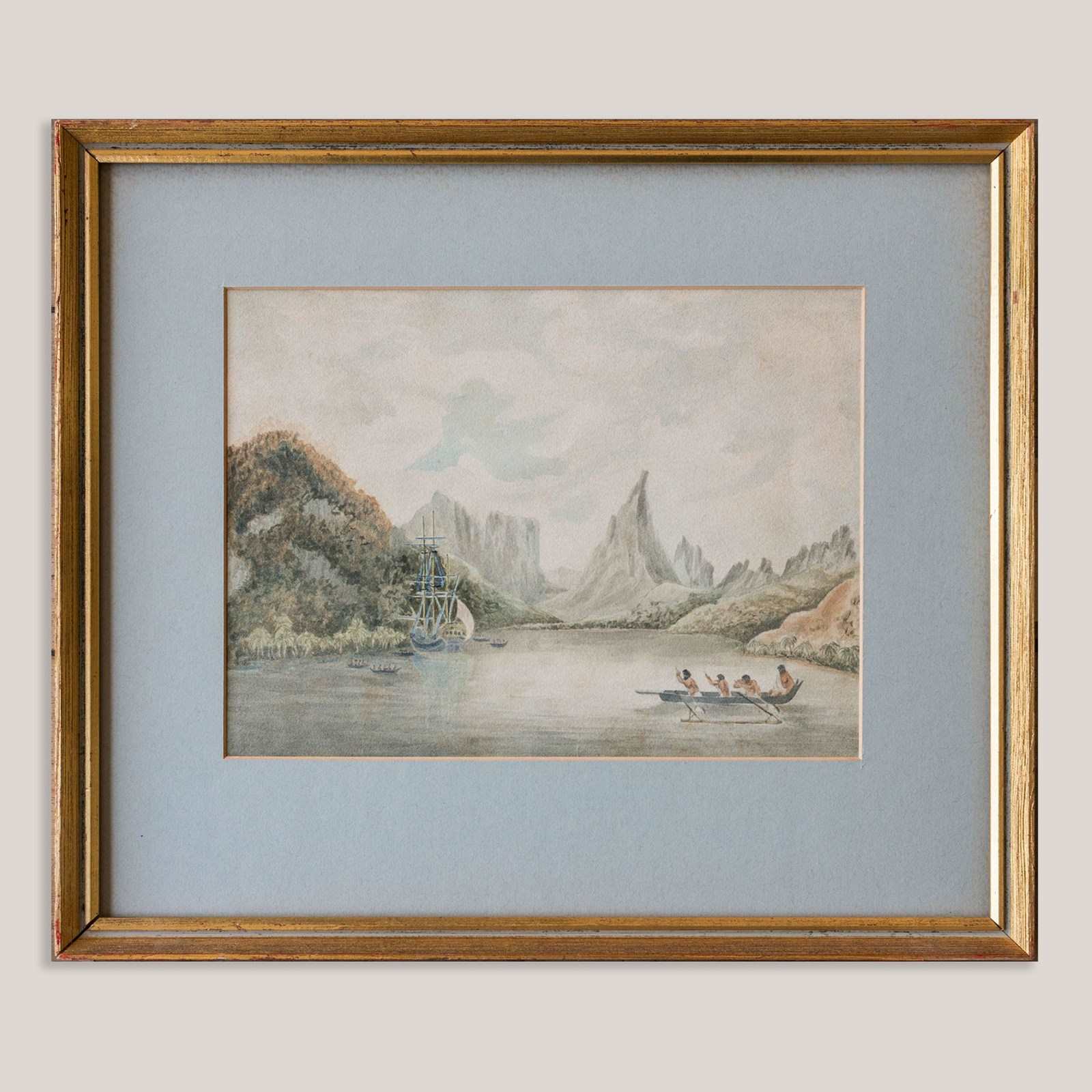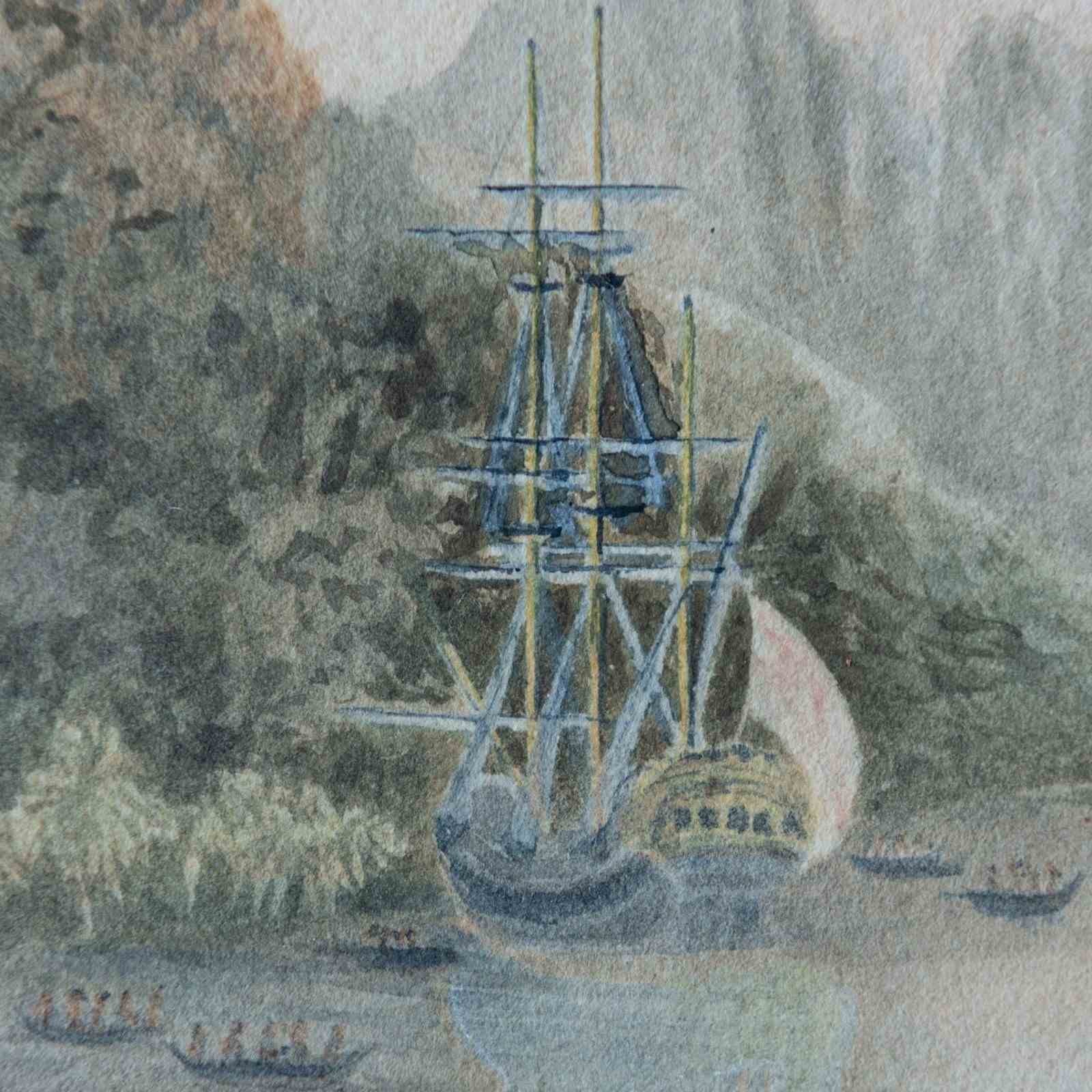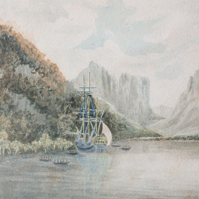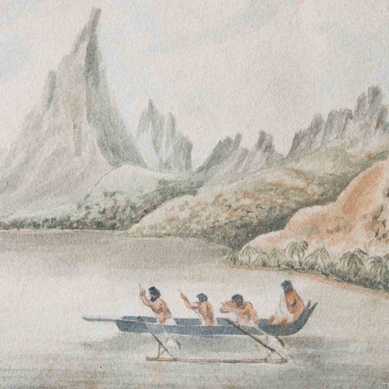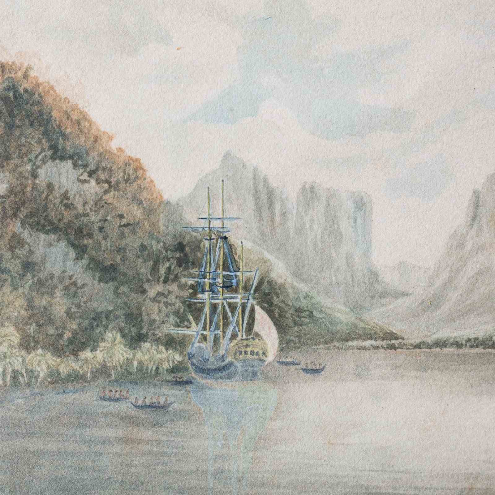 This watercolor depicts a sheltered harbor scene identified as Taloo Harbour in Tahiti, showing a European sailing vessel anchored offshore with indigenous canoes in the foreground. Steep mountainous forms and dense vegetation frame the calm waterway, rendered in soft washes of blue, green, and muted earth tones. The composition emphasizes clear spatial structure, subdued lighting, and observational detail typical of late 18th-century maritime and topographical imagery. The work is possibly copied circa 1799 after Tahiti Missionaries – Taloo Harbour in the Island of… by Michael Angelo Rooker, whose coastal views were widely disseminated and reproduced. The scene reflects the documentary visual language associated with missionary and exploratory activity in the South Pacific.