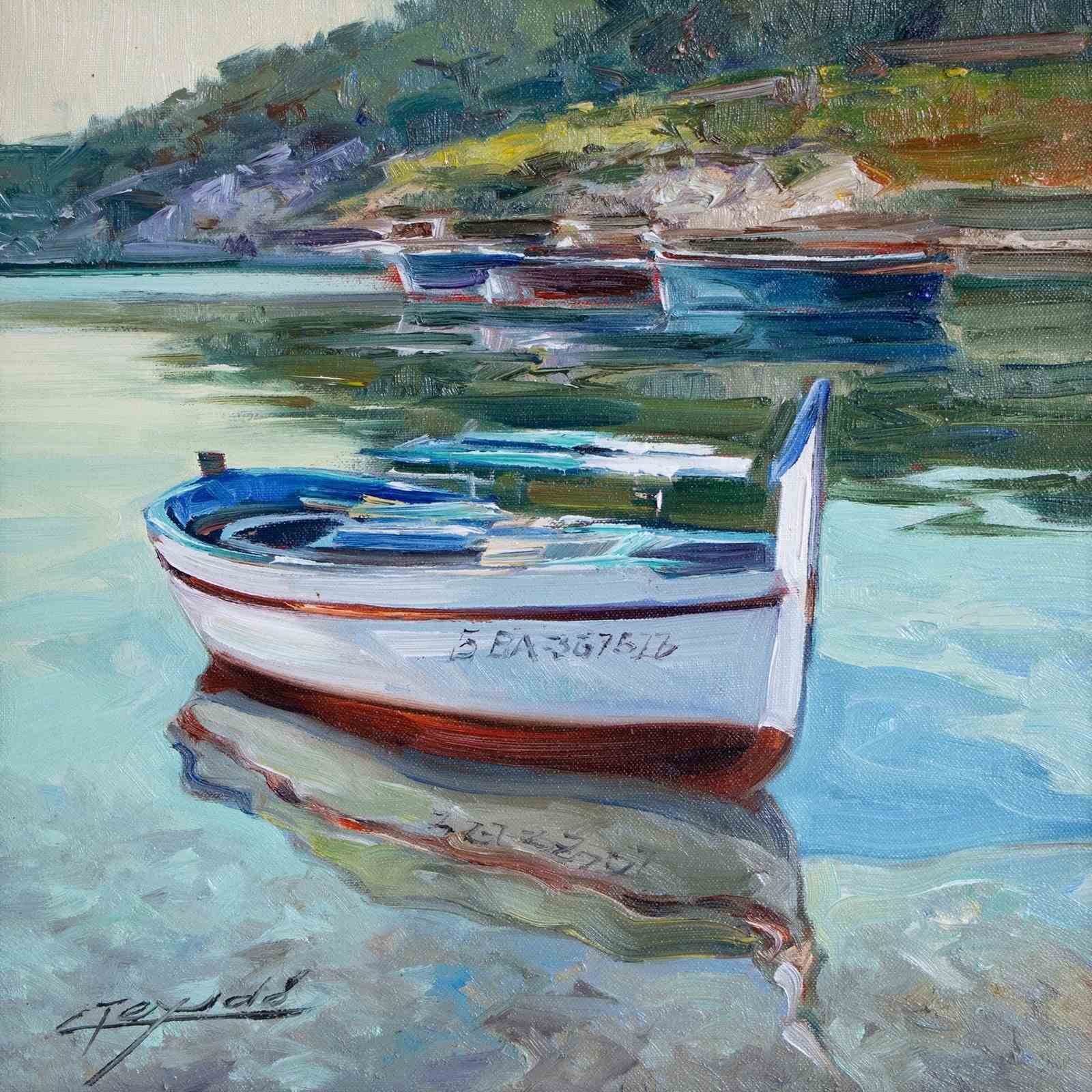 This signed oil on canvas, titled Transparencies, portrays a calm Mediterranean inlet where small fishing boats rest gently on clear, reflective waters. The artist employs loose, confident brushwork to convey the luminous stillness of the scene, allowing subtle tonal shifts of blue-green and ochre to express depth and atmosphere. The interplay of reflection and shadow on the water’s surface demonstrates refined control of light and composition. The painting’s balance of realism and painterly freedom reflects the influence of coastal impressionism, capturing the serenity and rhythm of everyday maritime life. Its tranquil palette and spatial clarity lend a timeless quality suited to both contemporary and classic settings.