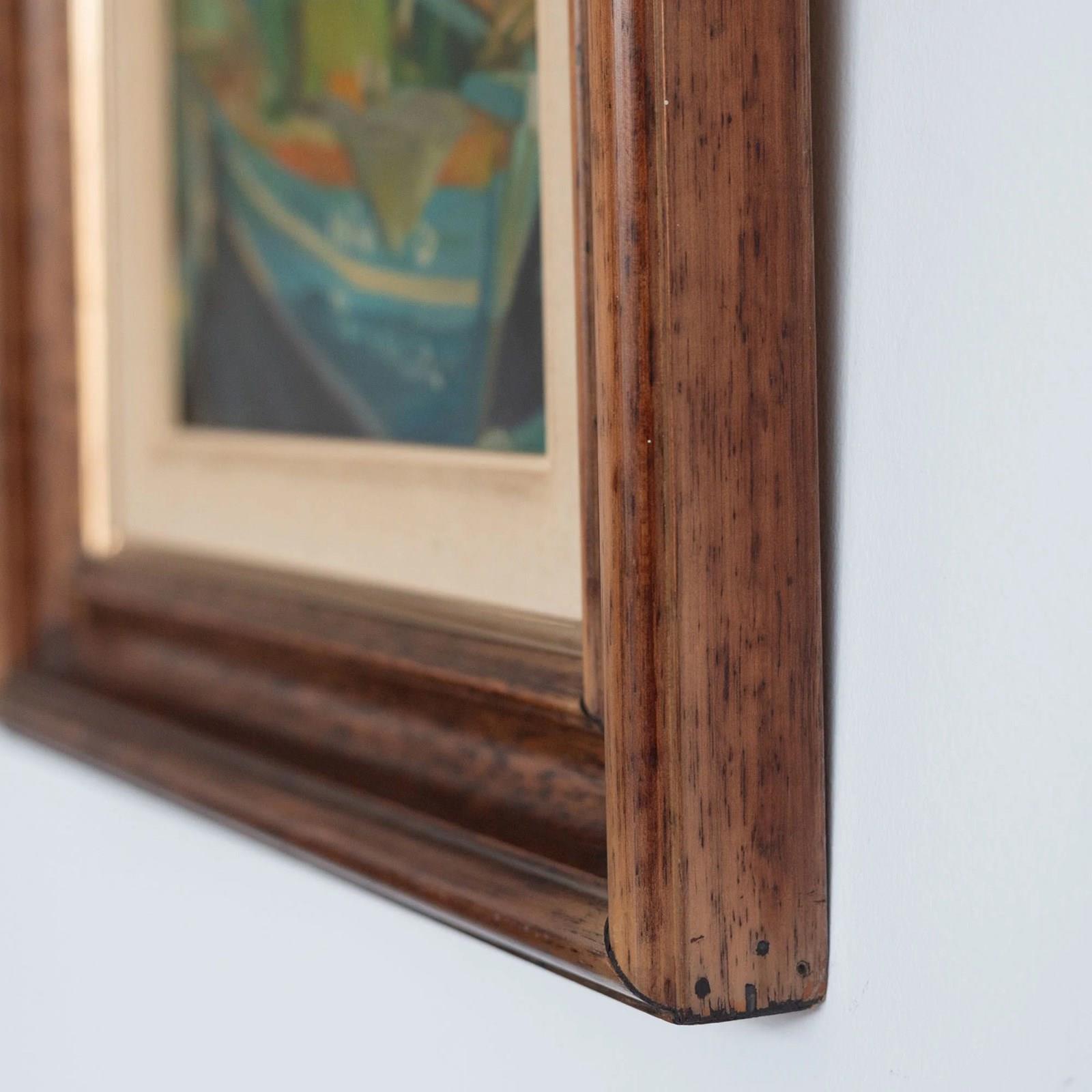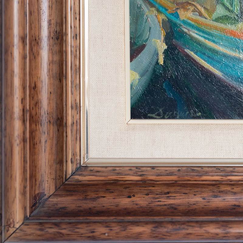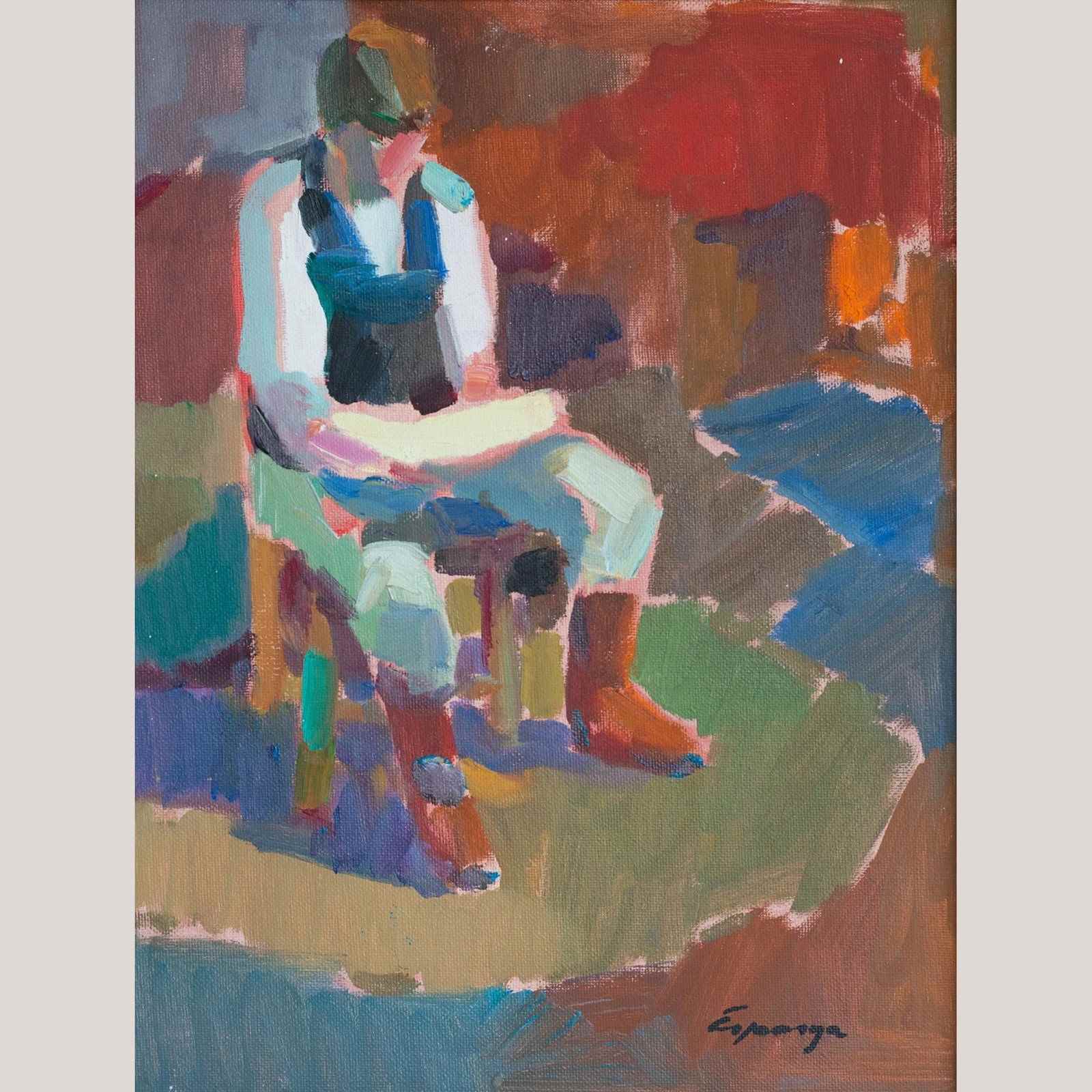 These two framed oil paintings, are presented as a cohesive pair and share a consistent painterly language marked by confident brushwork and strong color structure. One work depicts a moored fishing boat rendered in turquoise, green, and warm ochre tones, with expressive strokes suggesting movement and light within a harbor setting. The second painting presents a seated figure composed through broad planes of color, where reds, blues, greens, and neutrals are balanced to define form rather than detail. In both works, the artists favors simplified shapes, visible brush marks, and a modern, post-impressionist approach that emphasizes mood and composition over realism.