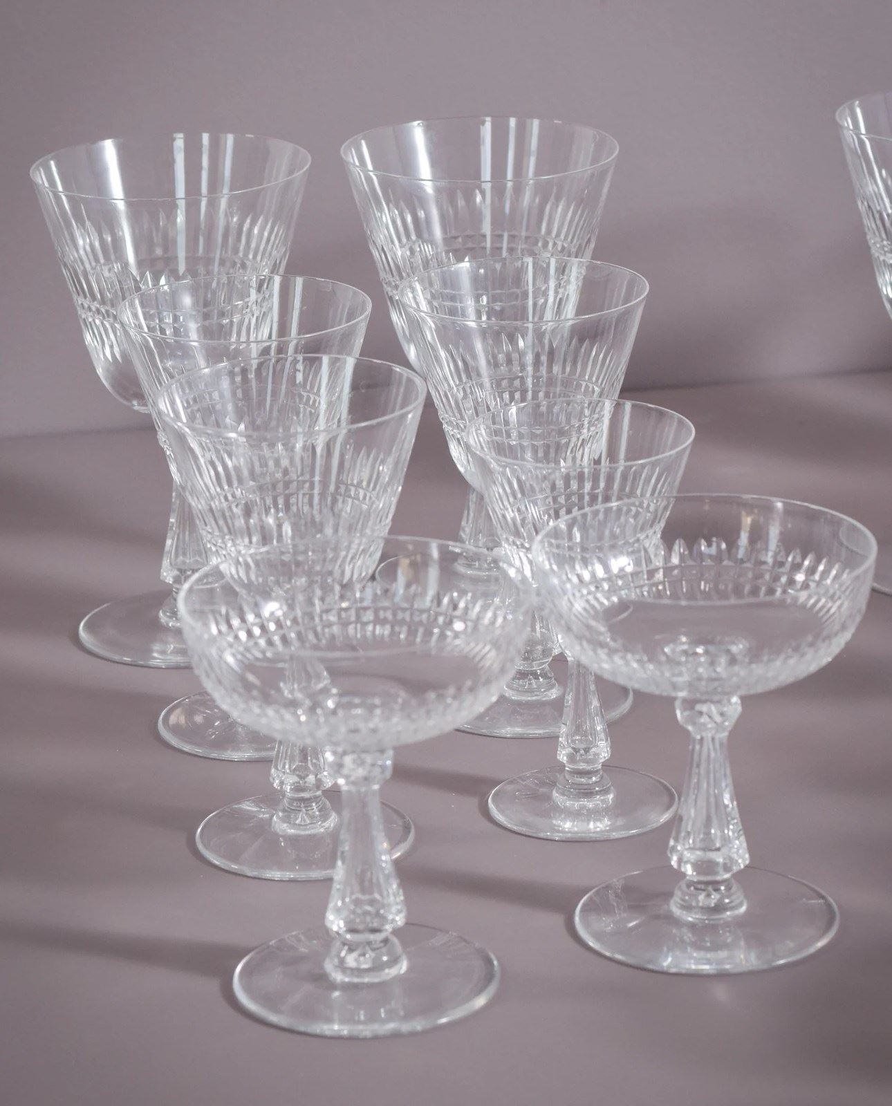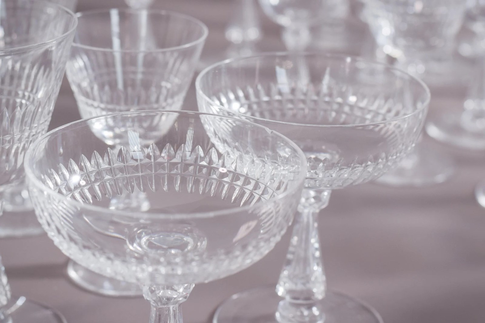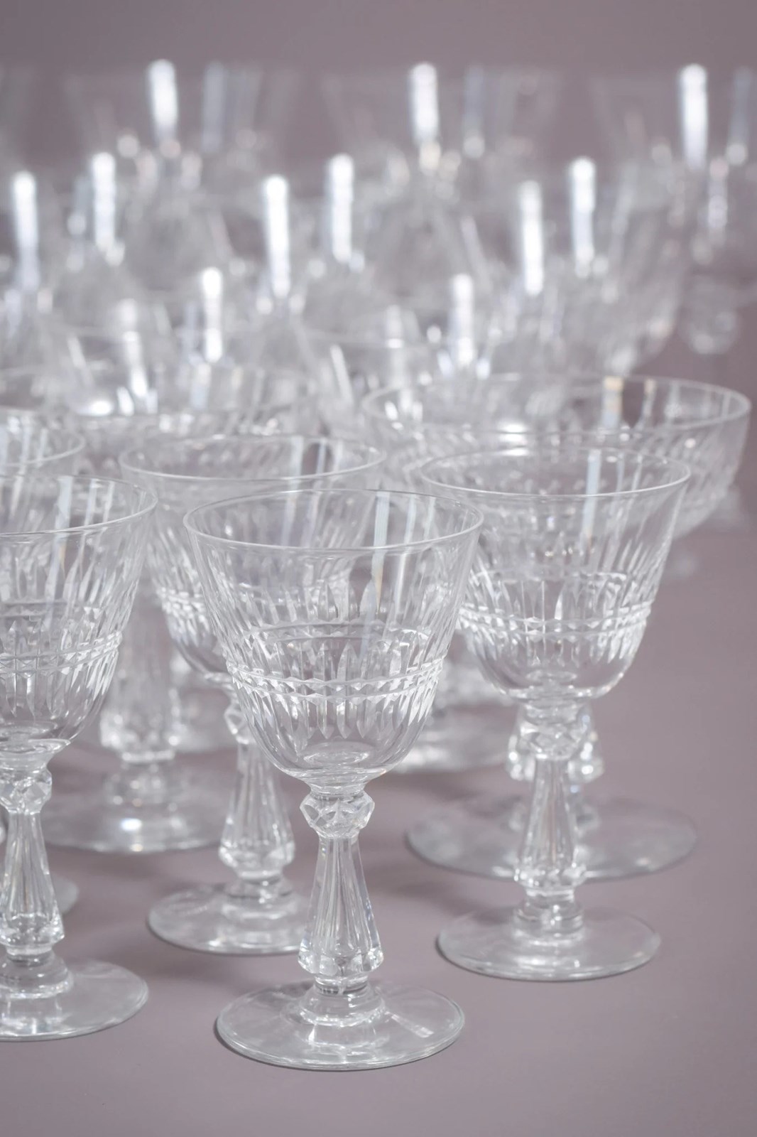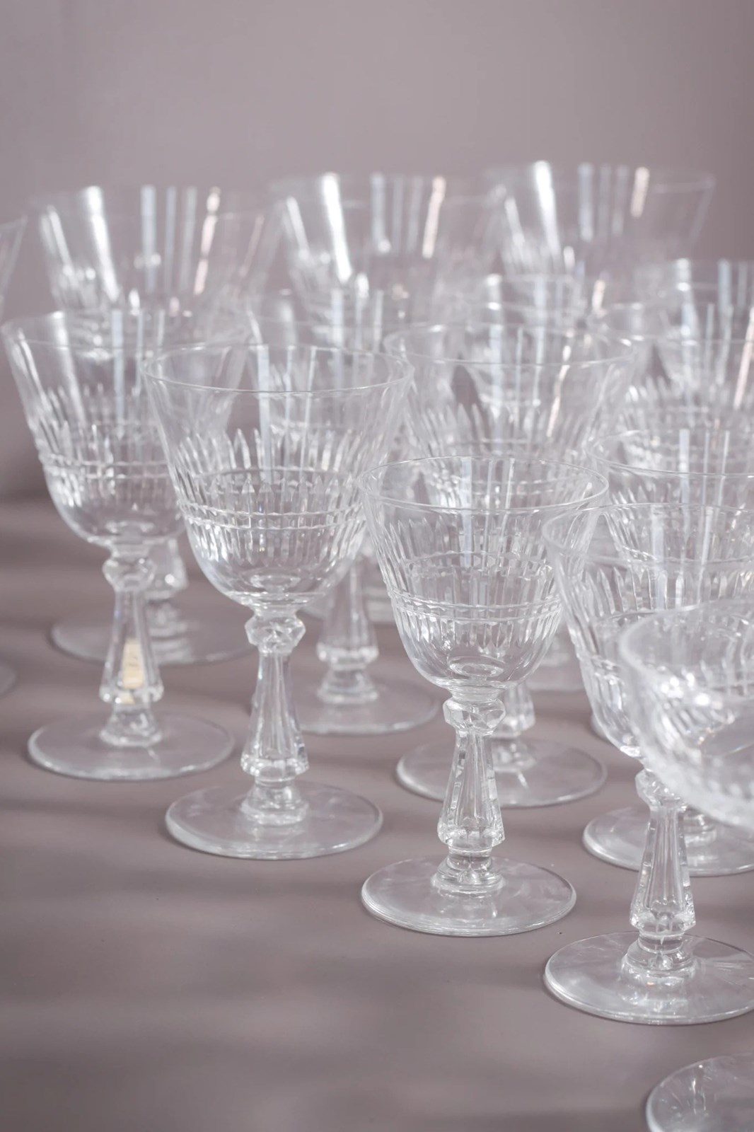 An exquisite set of vintage glasses, bursting with quality and elegance. This complete set has champagne glasses, larger wine glasses and a number of smaller glasses, perfect for an aperitif or dessert wine. The gorgeous, sophisticated designs are fit for decoration and sure to impress your guests.