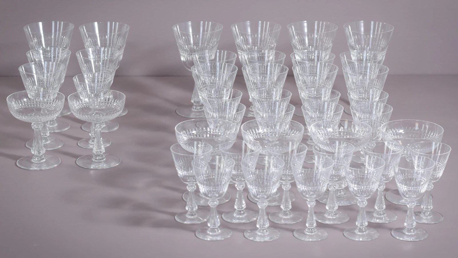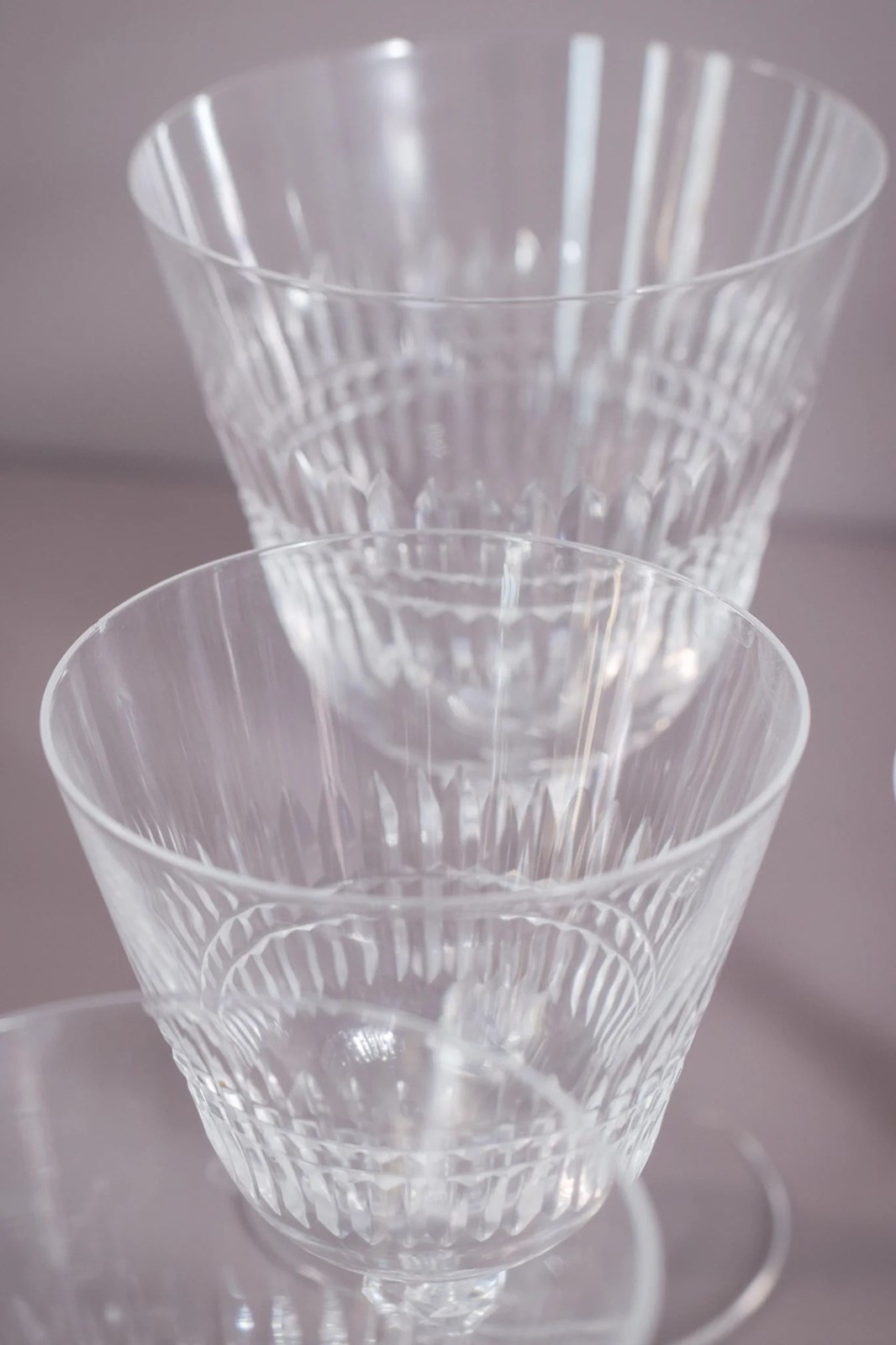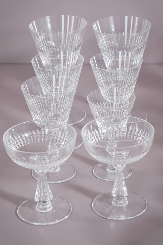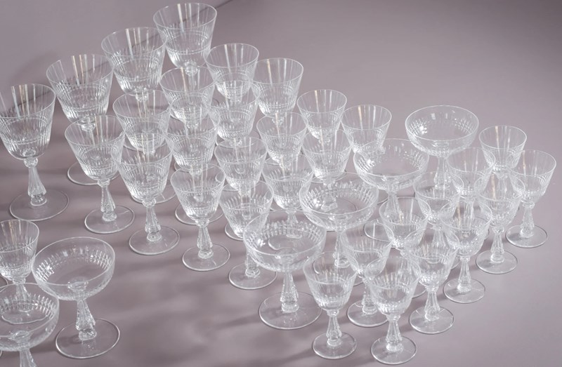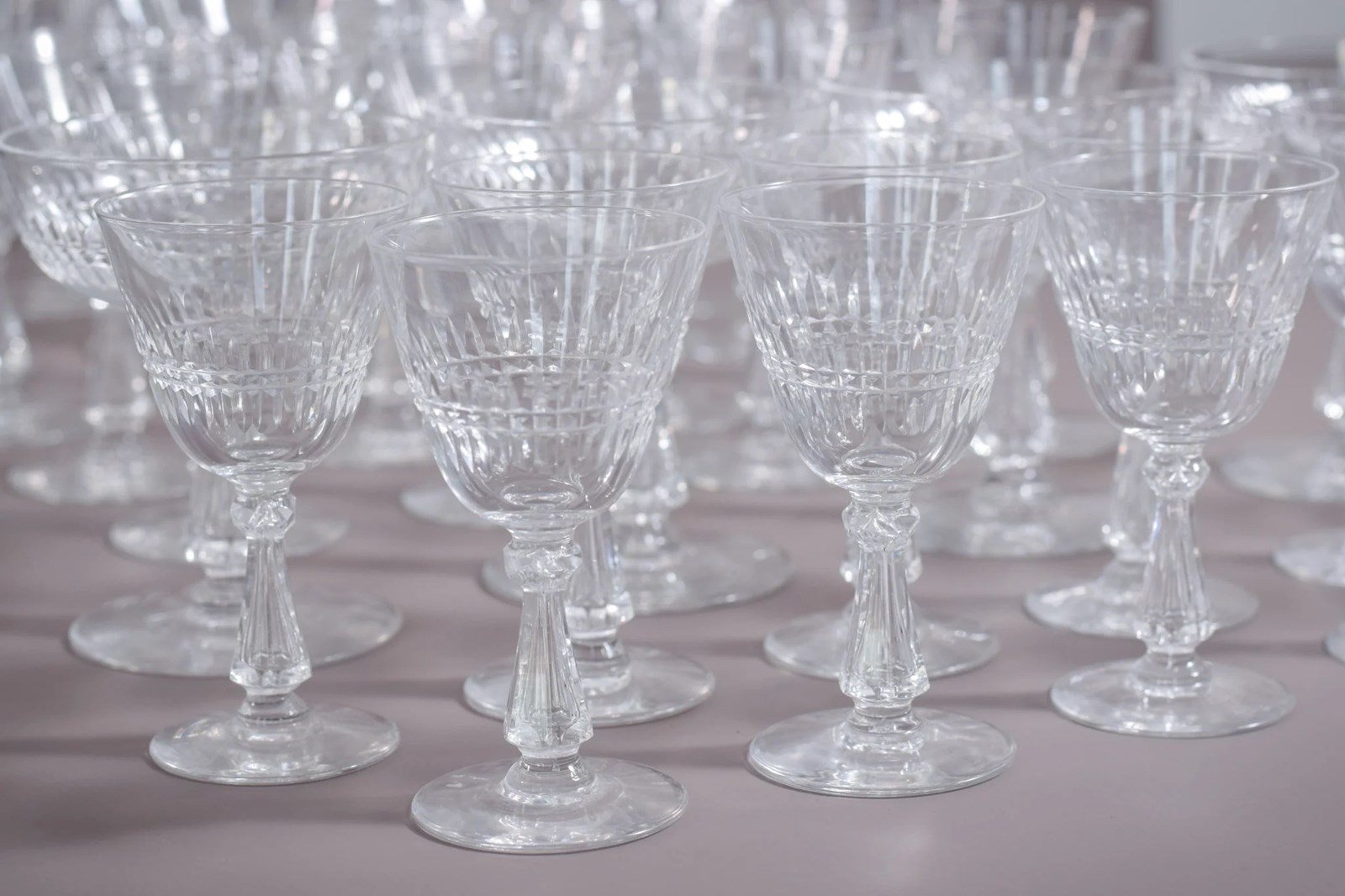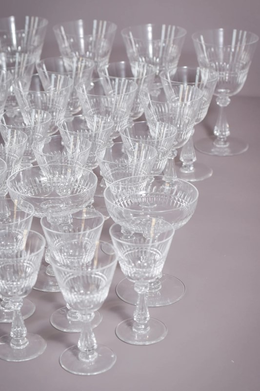 An exquisite set of vintage glasses, bursting with quality and elegance. This complete set has champagne glasses, larger wine glasses and a number of smaller glasses, perfect for an aperitif or dessert wine. The gorgeous, sophisticated designs are fit for decoration and sure to impress your guests.