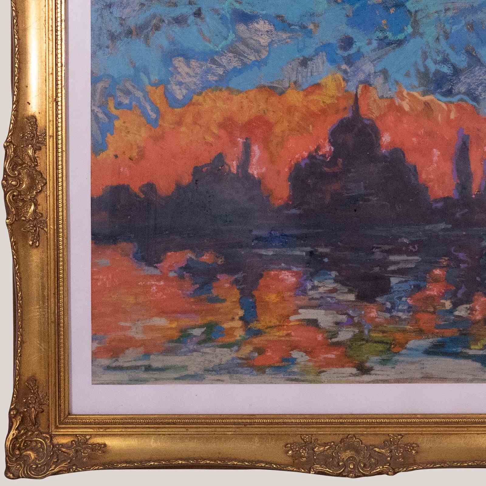 This oil on carton painting captures a glowing Venetian sunset rendered with expressive color and light in the tradition of Late Impressionism. Its style shows a clear affinity with Claude Monet, whose Venetian series explored the interplay of atmosphere and reflection. Like Monet and his contemporaries—heirs to Turner’s poetic luminosity—the artist transforms the scene into a synthesis of color, mood, and motion. Fiery tones of orange and red merge with cool blues and violets, creating striking contrasts that radiate across the water’s surface. Loose, fluid brushstrokes dissolve the domes and towers of Venice into vibrant silhouettes, their reflections shimmering in rhythmic harmony. The composition evokes views of the Grand Canal or the Basilica di Santa Maria della Salute at sunset, where architectural form yields to the brilliance of light. The result is an image of serene intensity—less a depiction of place than a lyrical impression of a fleeting moment.
