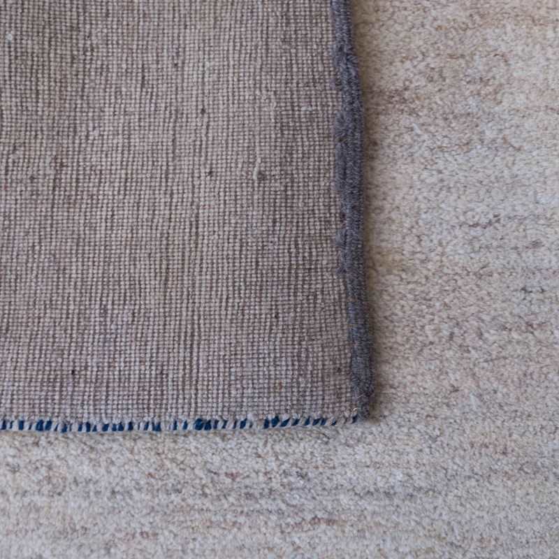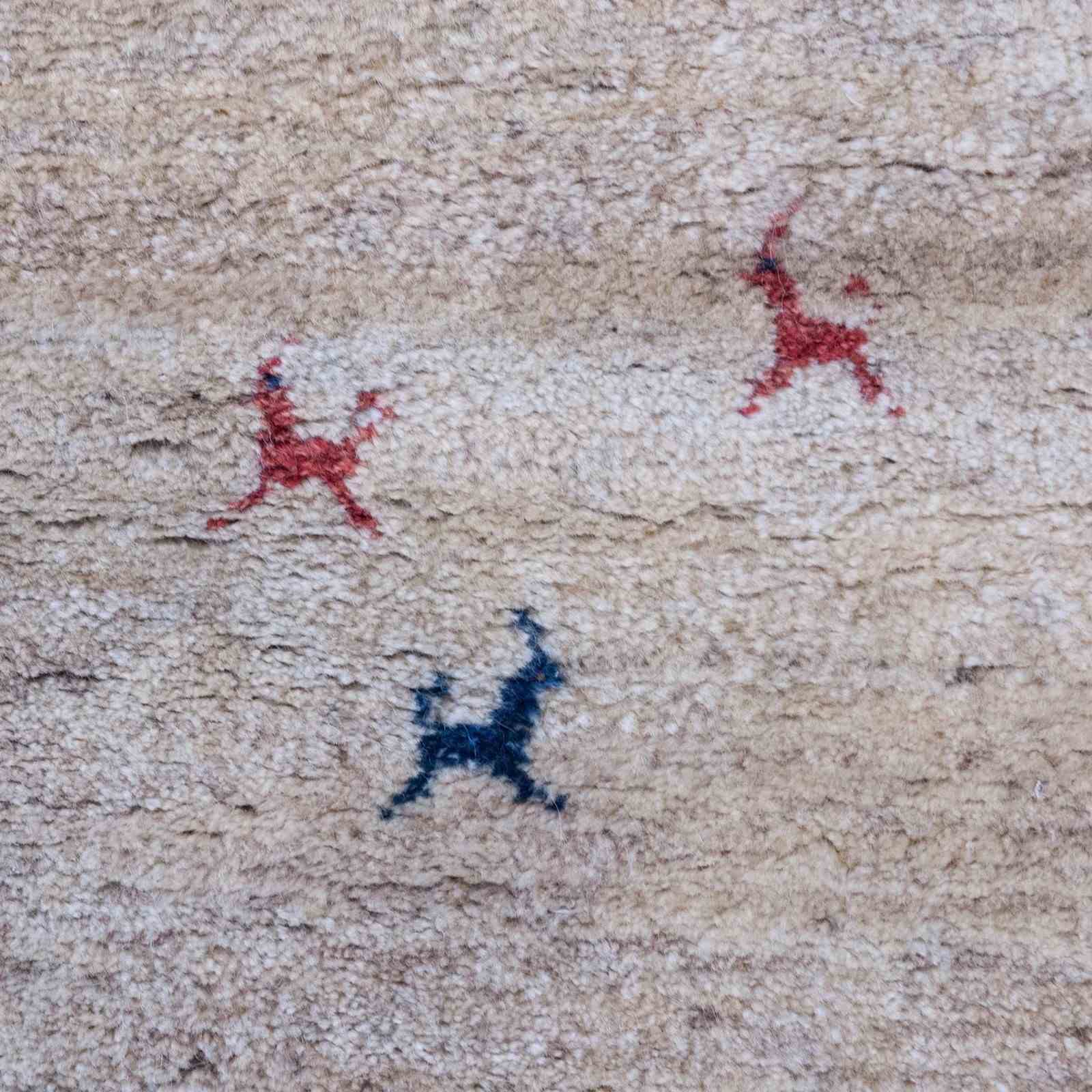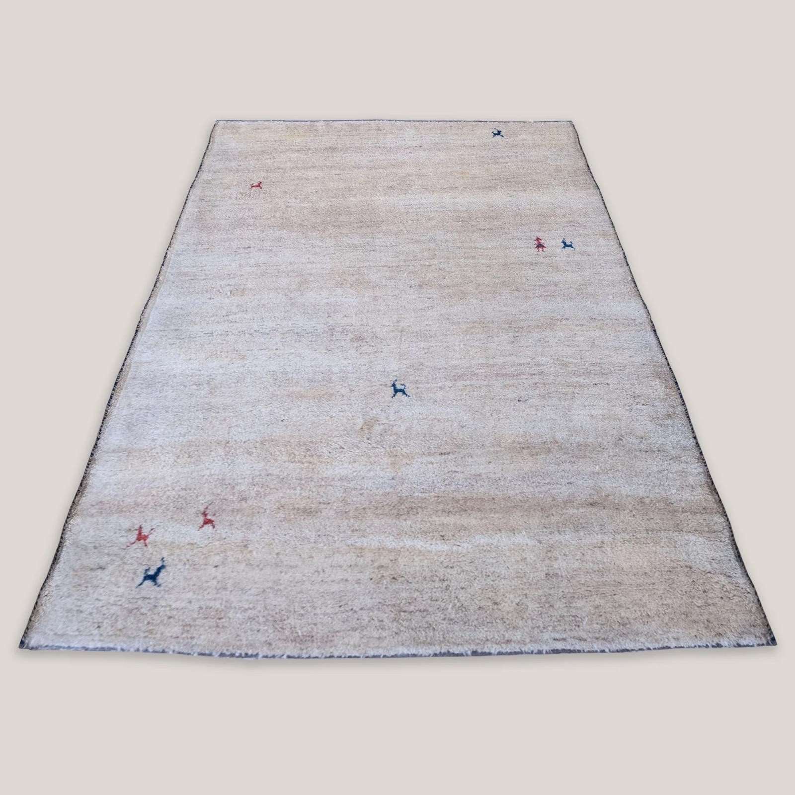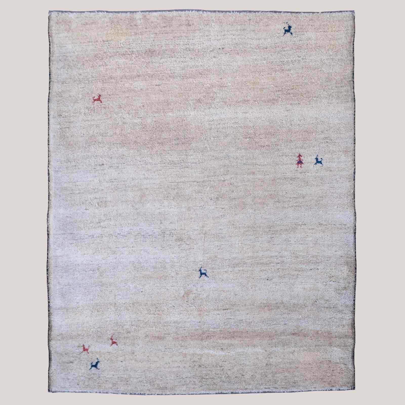 This vintage hand-knotted Gabbeh rug is crafted in hand-spun wool and dyed with natural plant and mineral pigments, reflecting the authentic traditions of the Ghashghai nomads of Persia’s Fars region. Its minimalist composition features a softly variegated, undyed field punctuated by small, stylised animal motifs rendered in deep red and indigo, creating a quiet yet distinctive visual rhythm. The design language is intentionally reduced, celebrating texture, balance, and the expressive irregularities of tribal weaving. With its characteristically thick, plush pile, Gabbeh rugs are valued for their warmth, softness, and durability. Subtle tonal variations across the ground highlight the organic wool and natural dyes, embodying the raw, elemental spirit from which the name “Gabbeh” derives. Both understated and culturally rich, this textile offers timeless character and refined rustic elegance within a thoughtfully composed space.