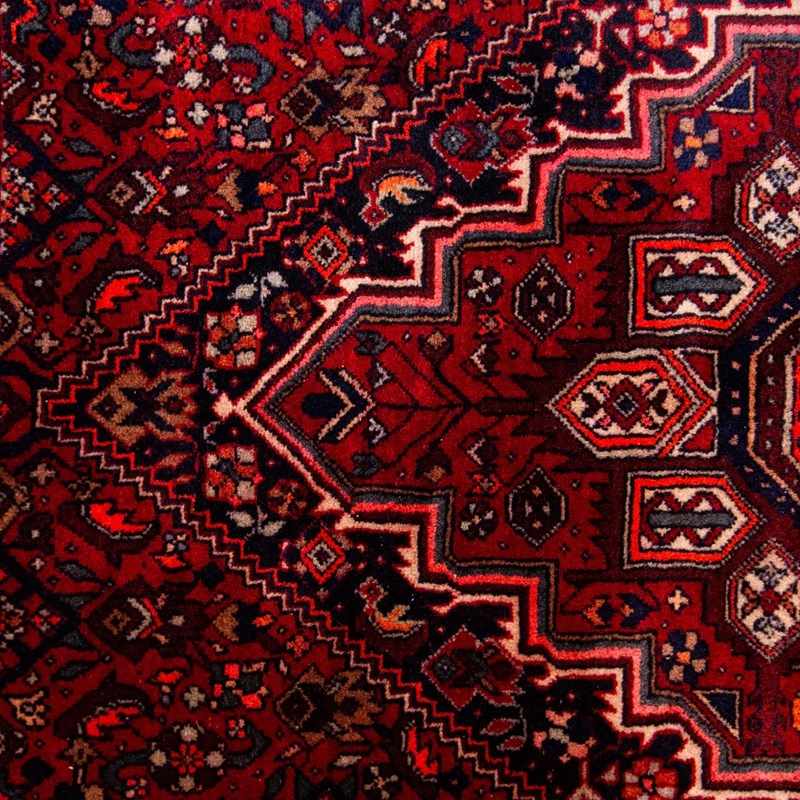 This vintage hand-knotted rug features the bold geometric medallion and deep crimson palette characteristic of traditional Hamadan weavings. The composition centres on a stepped central motif set against a densely patterned field filled with stylised floral elements, angular vine forms, and small tribal devices. Strong contrasts of cherry red, navy, ivory, and touches of burnt orange create a rich visual rhythm, while the crisp borders balance repeating rosettes and diamond motifs with precision. The wool pile shows the tight, resilient weave associated with village production, giving the piece both decorative strength and long-term durability. Its classic layout and saturated tones make it highly versatile for refined, character-driven interiors.