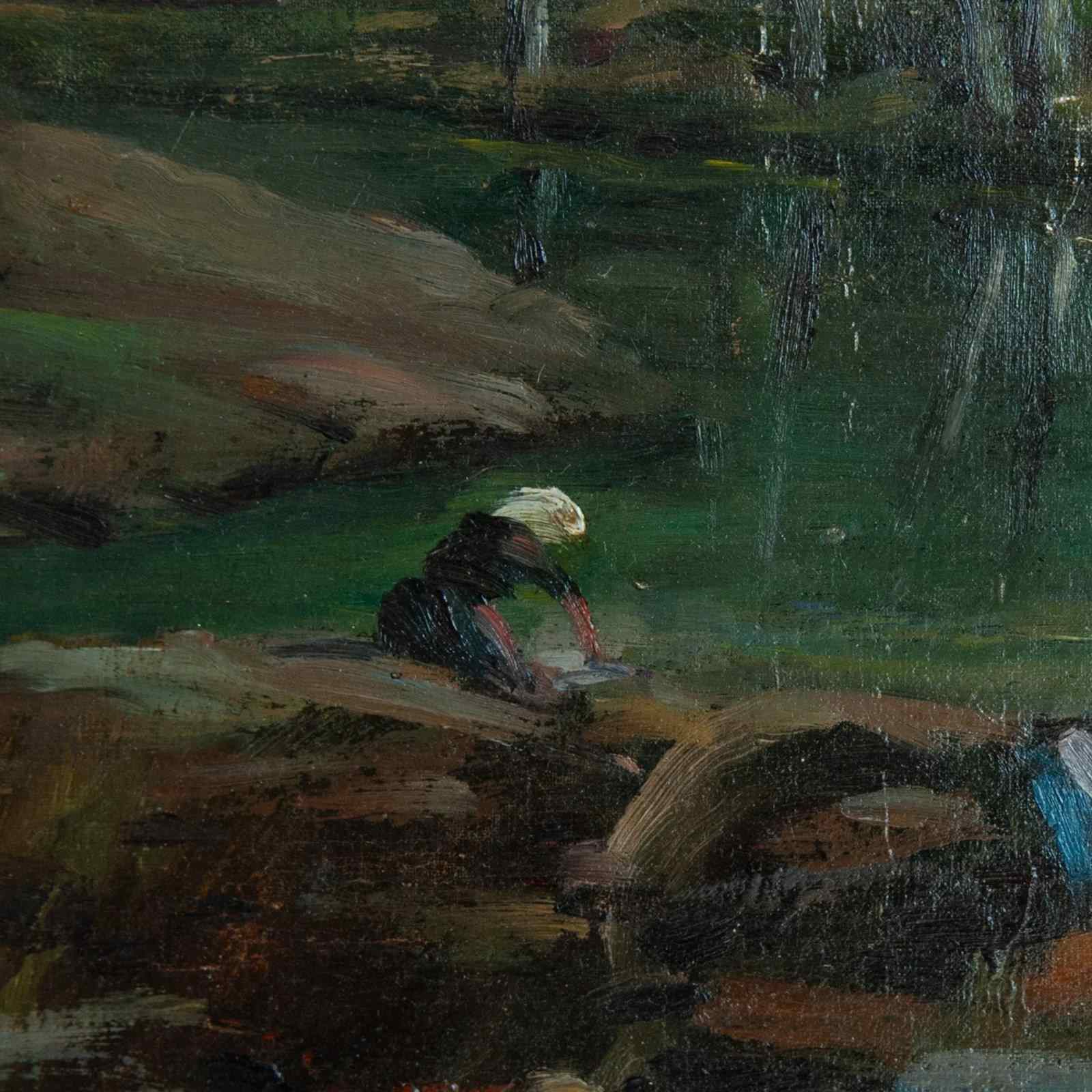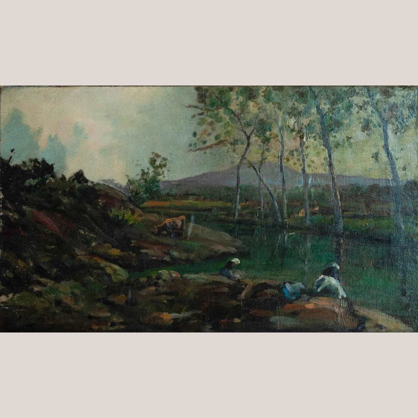 This original oil on canvas by Joaquim Vayreda y Vila (1843–1894) captures a serene pastoral scene along a calm riverbank, where women wash clothes beneath slender trees shimmering with late-afternoon light. The artist’s delicate interplay of light and shadow, combined with his characteristically harmonious palette of greens, browns, and soft sky tones, evokes the quiet dignity of rural life. Vayreda’s painterly yet precise brushwork reveals his deep sensitivity to atmosphere and nature, hallmarks of the Olot School that he co-founded. The composition’s depth and balance reflect his plein-air mastery and his pursuit of lyrical realism within the Catalan landscape tradition. This work exemplifies Vayreda’s enduring ability to fuse technical finesse with poetic observation, conveying both the intimacy of daily labour and the grandeur of nature’s stillness.