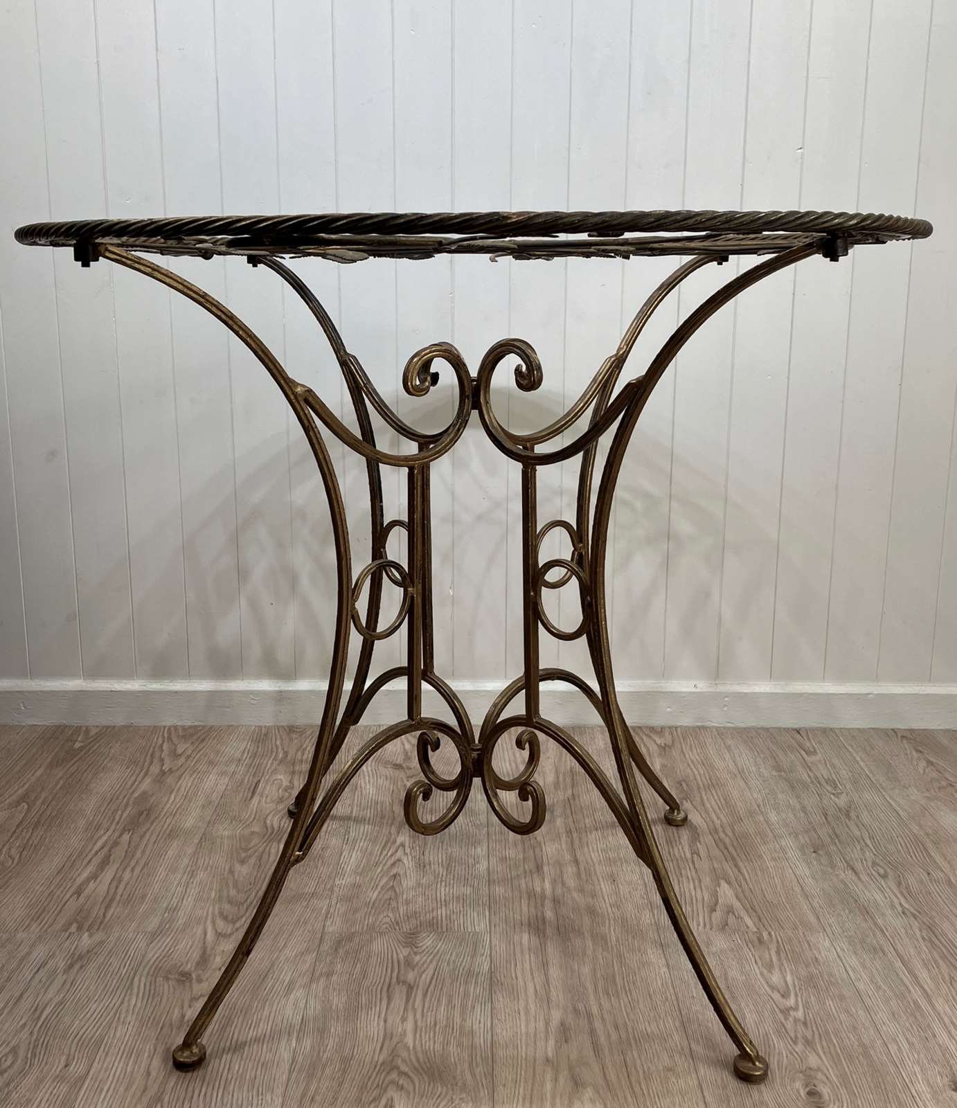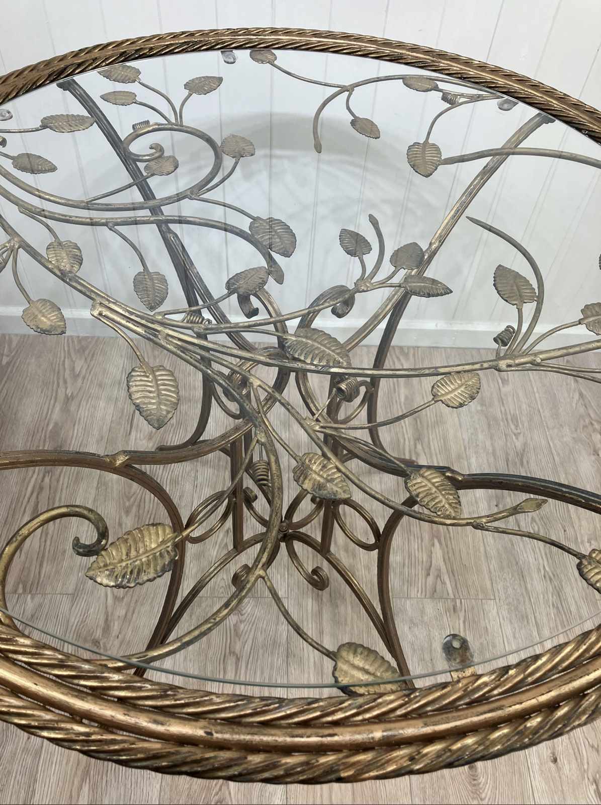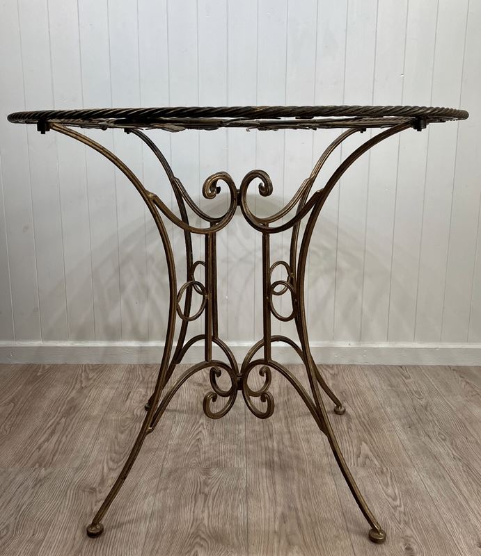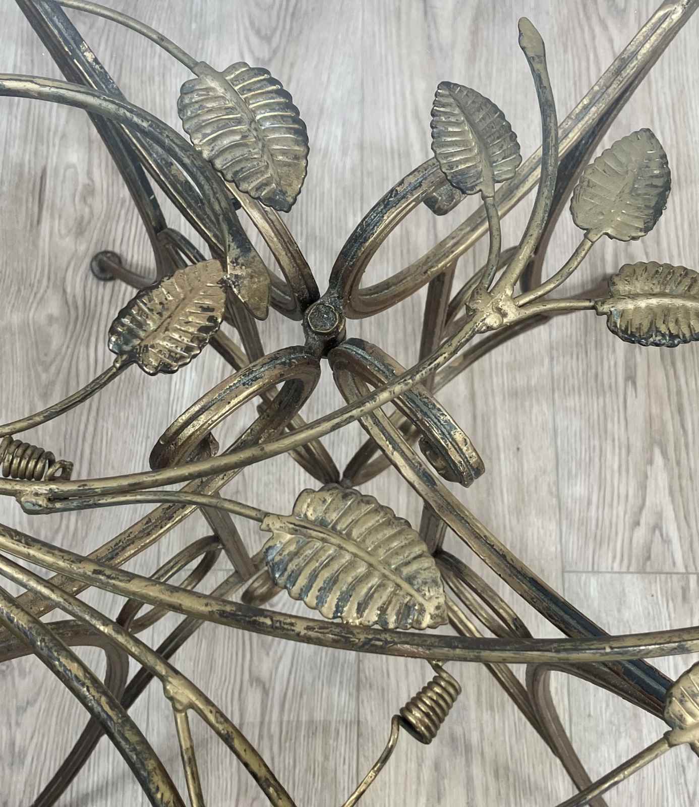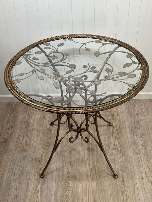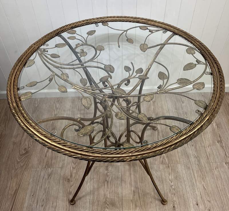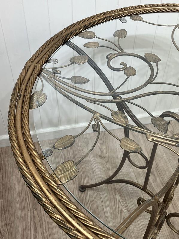 An eye-catching 1950s round side table with metal base in gilt finish and glass top. The base has four elegantly curved legs and scroll detailing, and the top has a very attractive foliage design below the glass, and double rope twist detail around the edge. The glass top sits on eight cushion pads and can just be lifted off, and the base folds flat. The toughened glass top is new, so it’s in perfect condition without any scratches. The gilt finish has worn slightly with age, which gives it a soft, muted appearance.