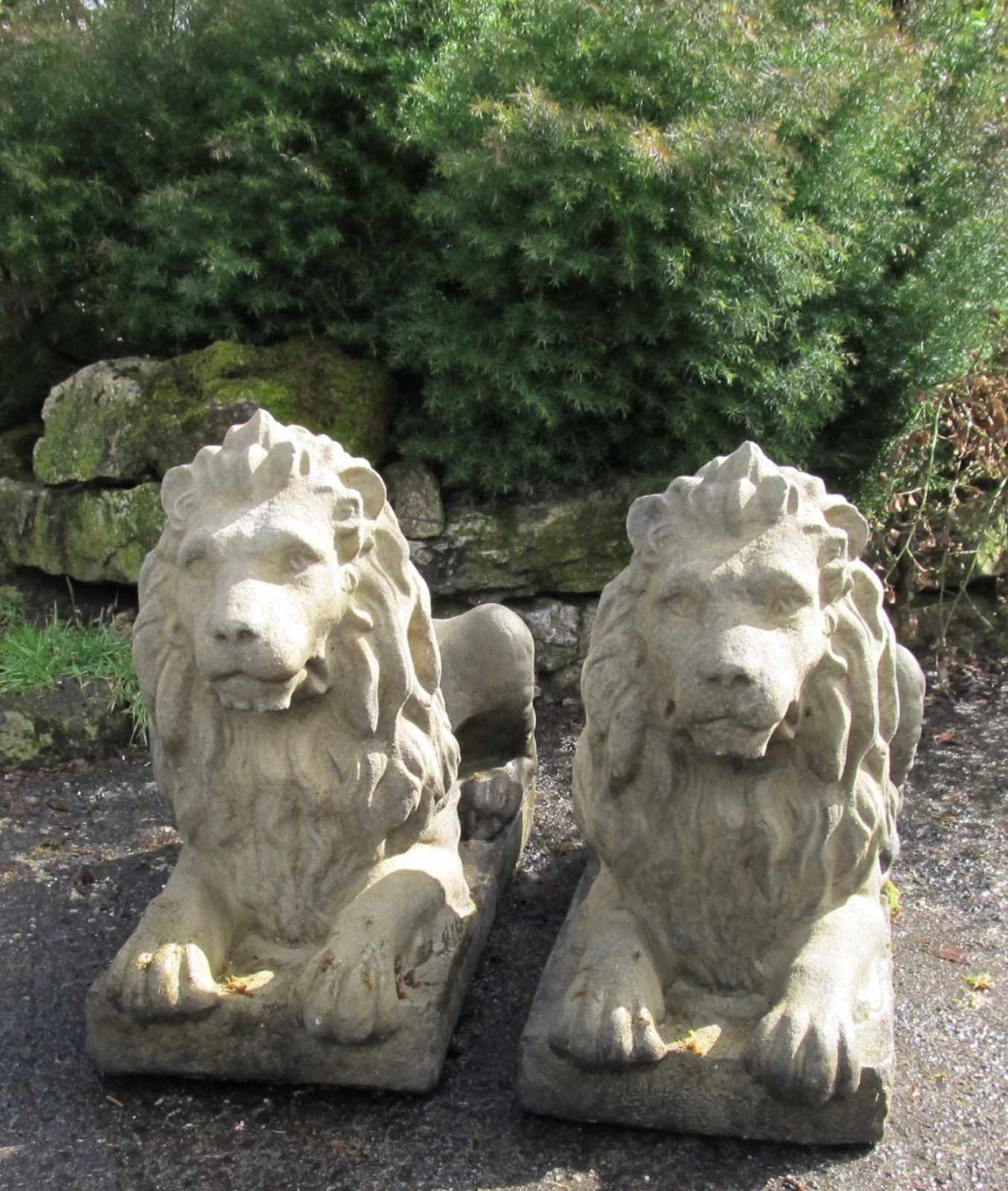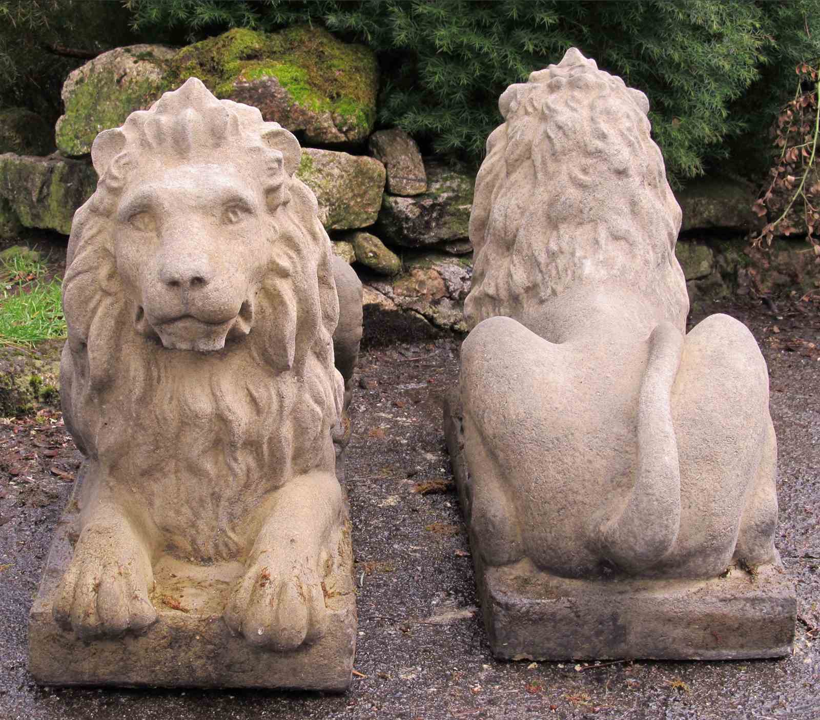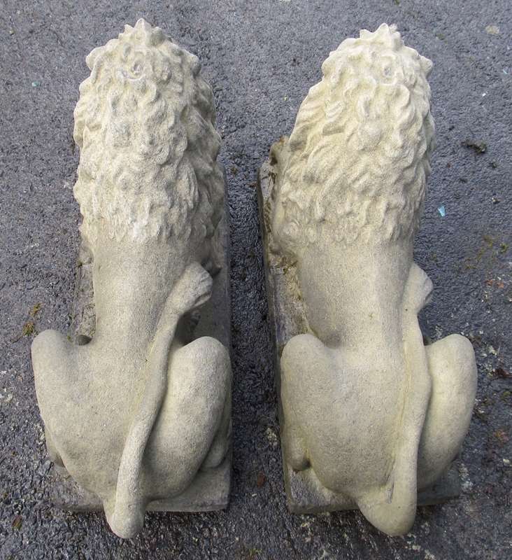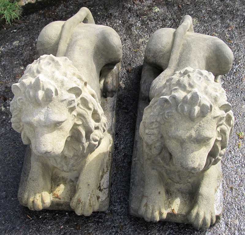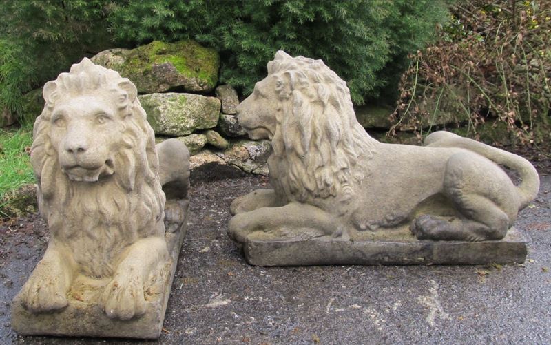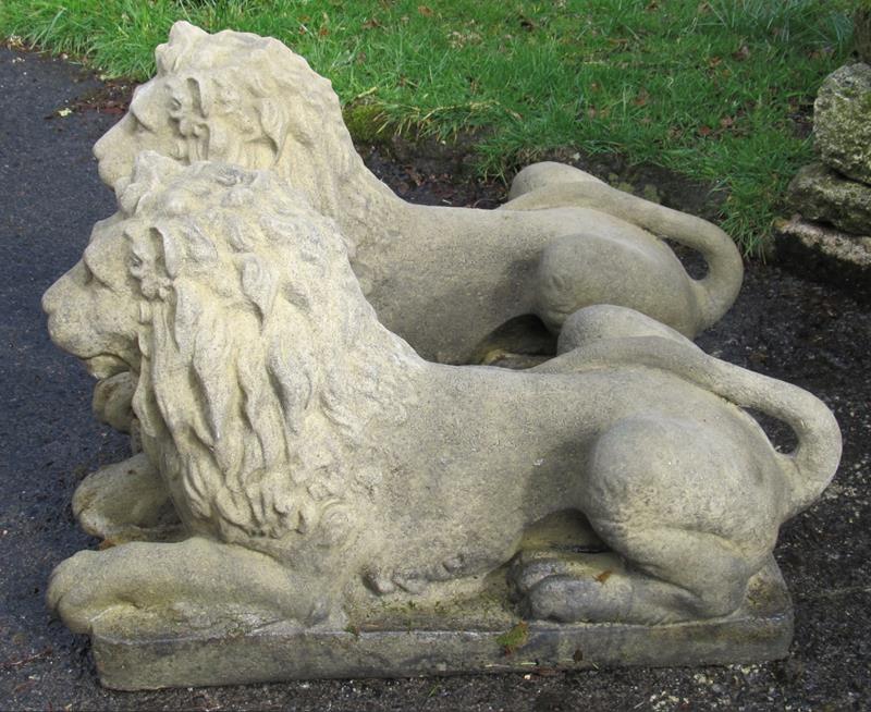 A pair of large, imposing recumbent lions in composite stone. These are very impressive, with good detailing, lying on substantial plinth bases. They’re in good condition with slight weathering.