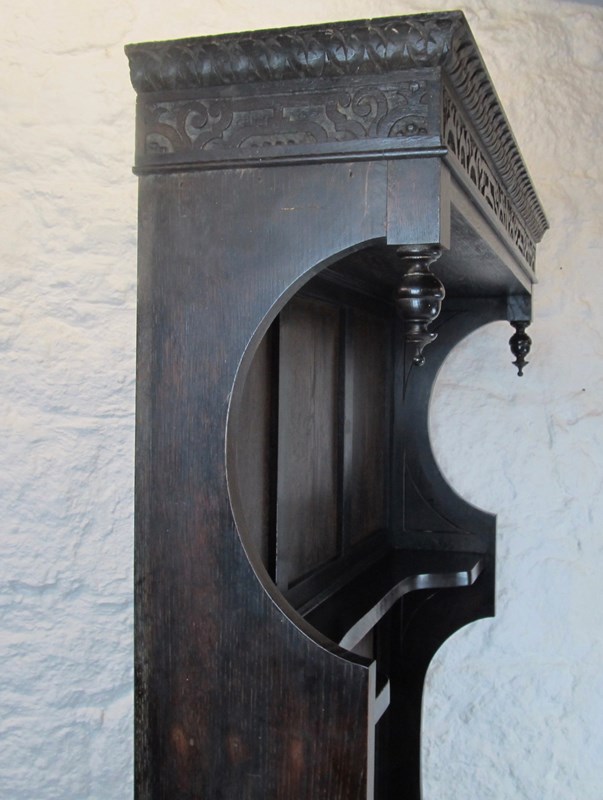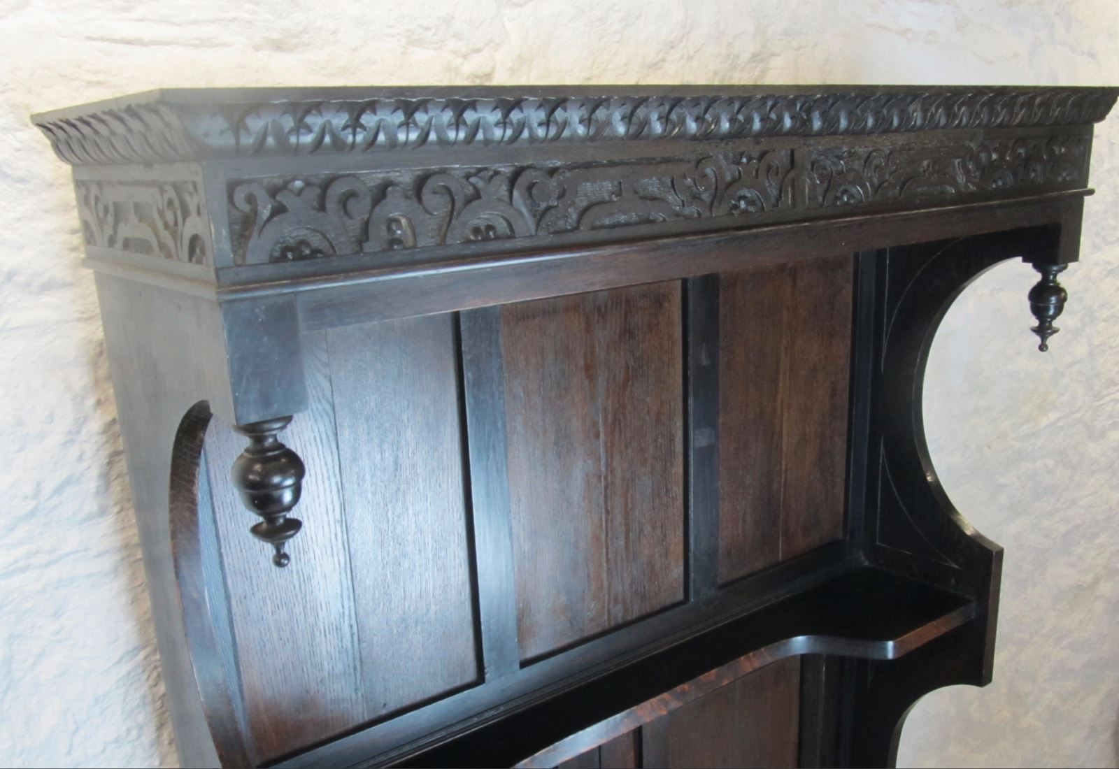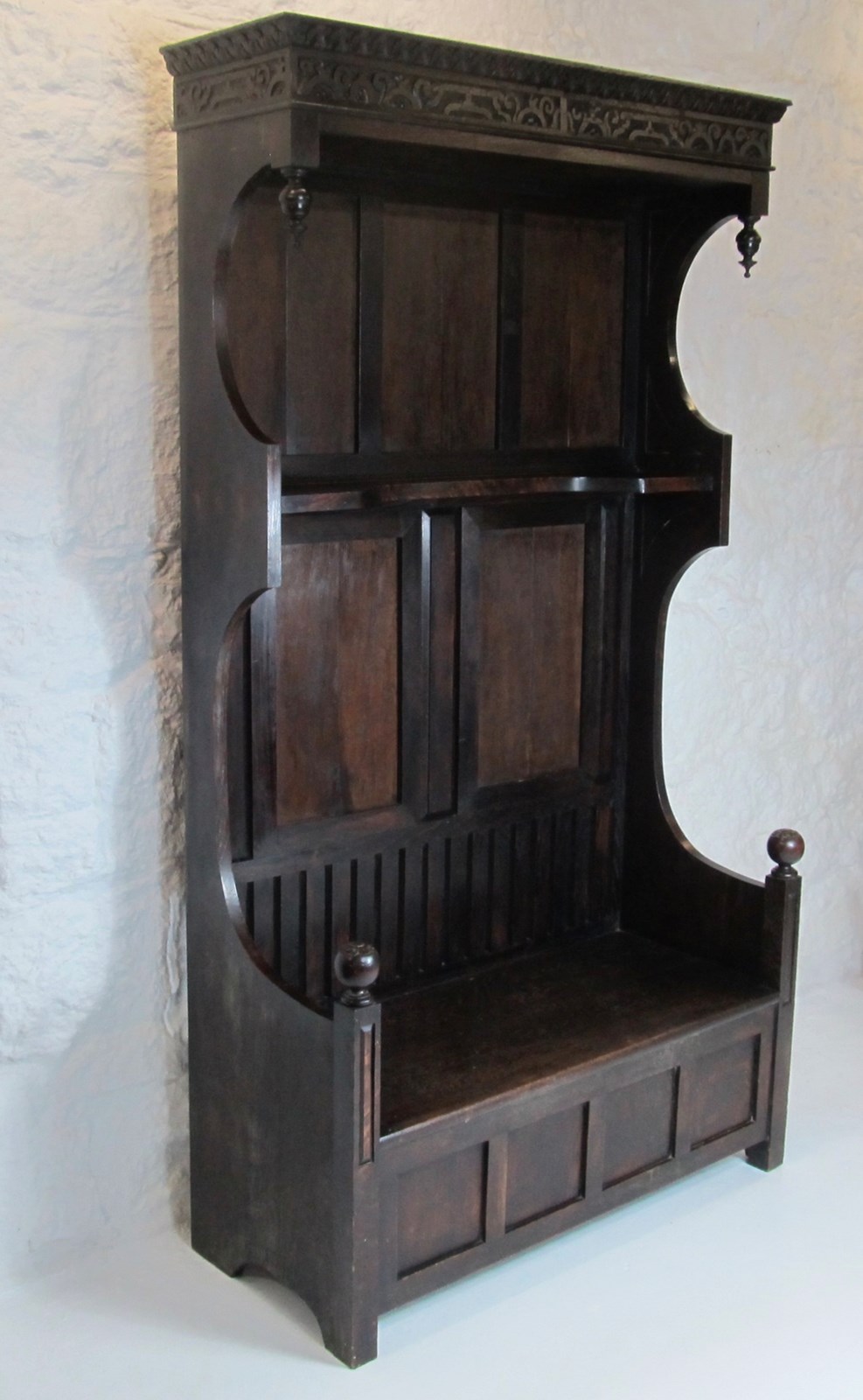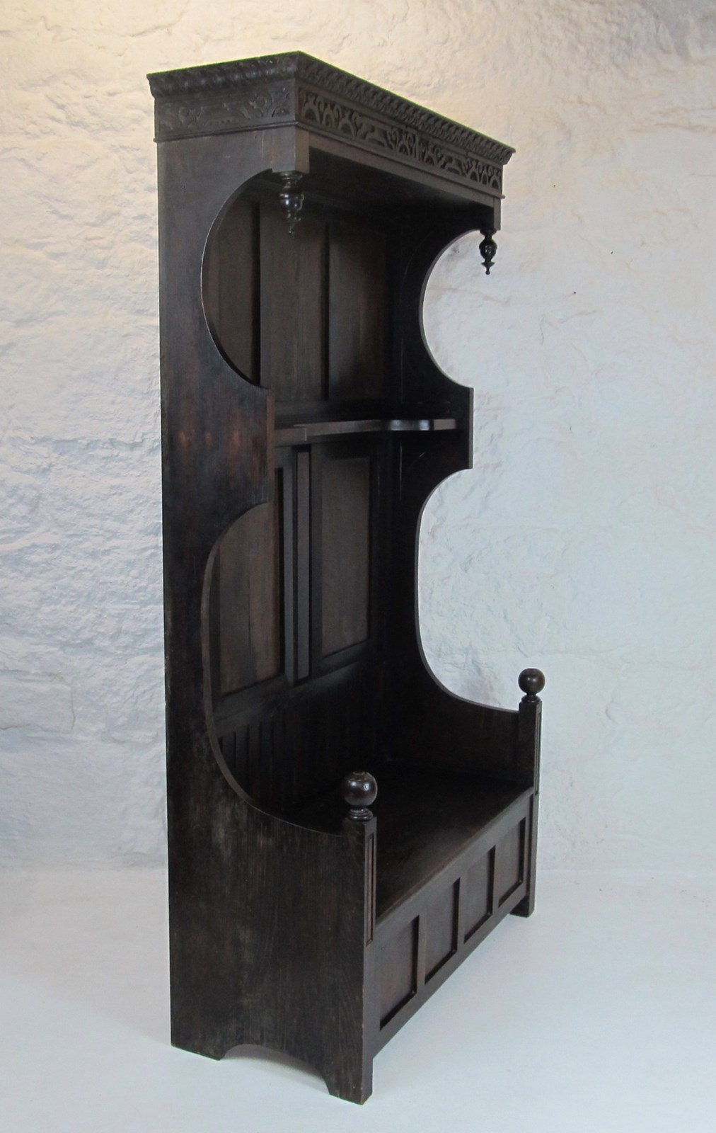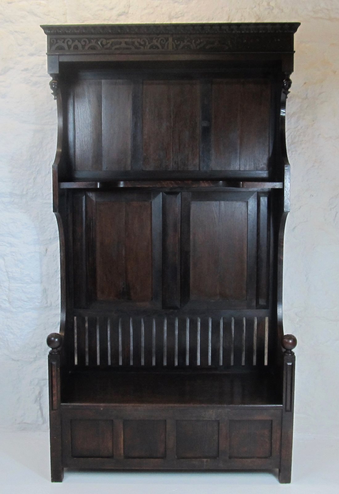 The unusual design includes an open slatted back to the seating bench, a shelf at half height, and hand-carved frieze and decorative finials at the top.