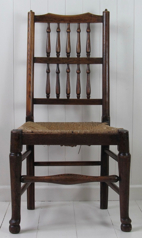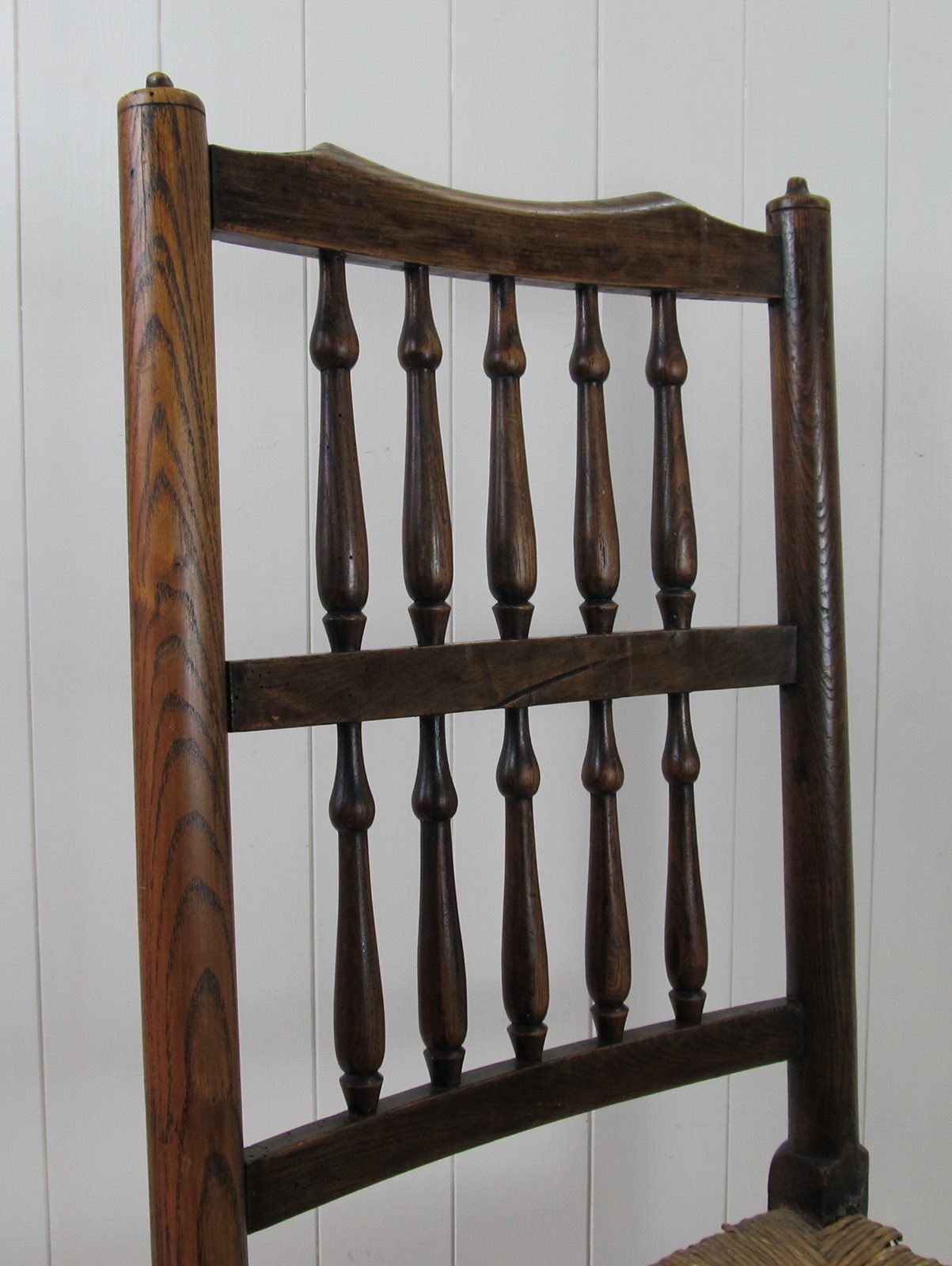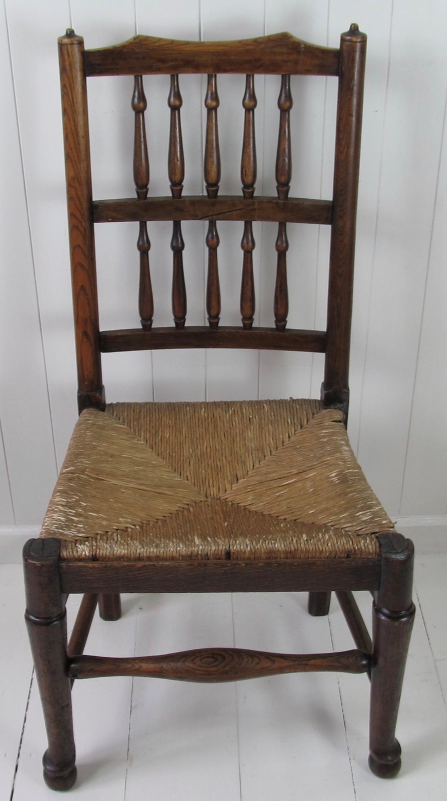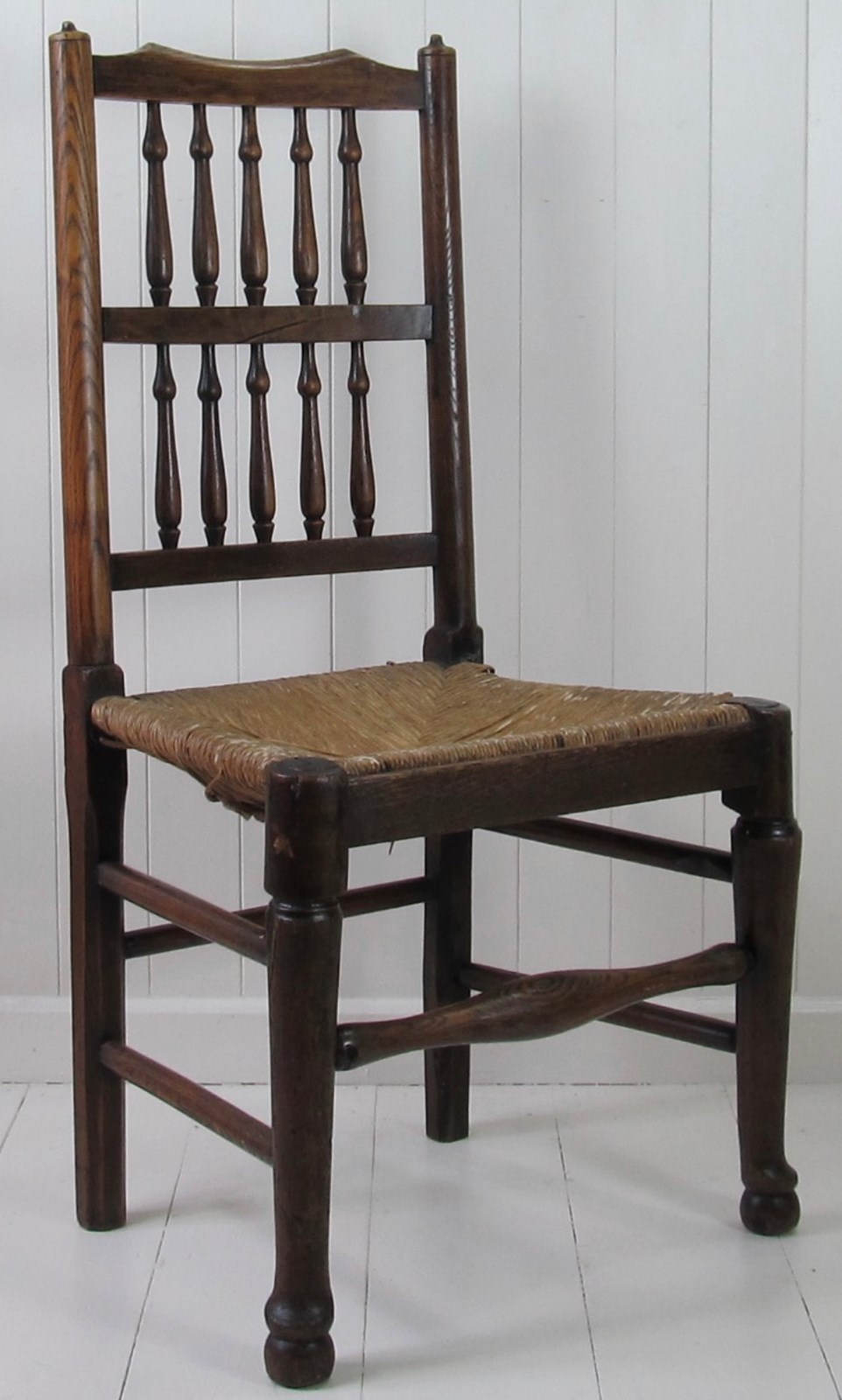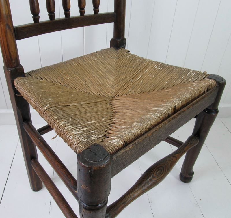 A perfect example of this classic 19th century chair with two rows of five turned spindles, rush seat and pad feet to the front legs. The turned front legs are joined with an elegant turned stretcher, and the back legs are straight. The rush seat is in good condition. There is some (not recent) filler visible behind one of the back legs. The chair has a really attractive aged feel with a rich, warm patina to the wood.