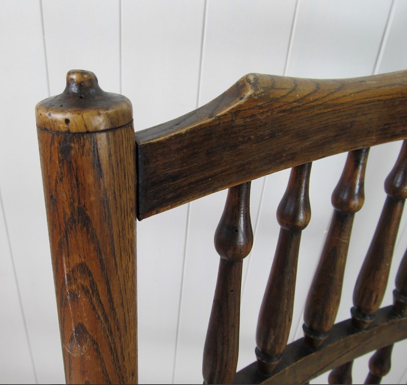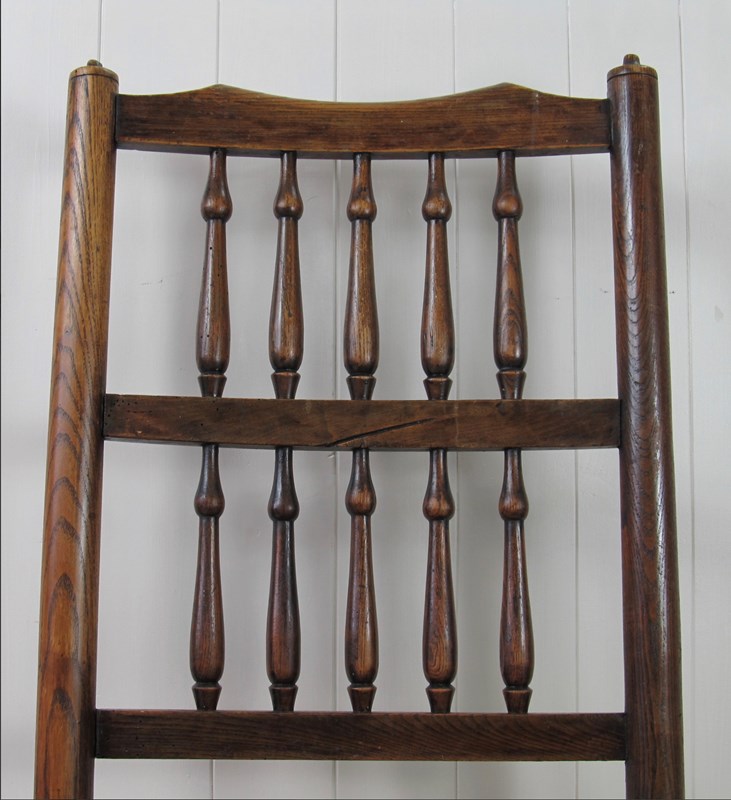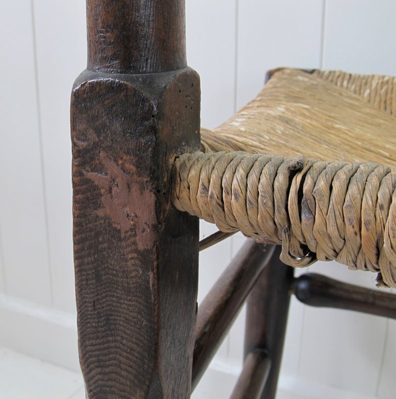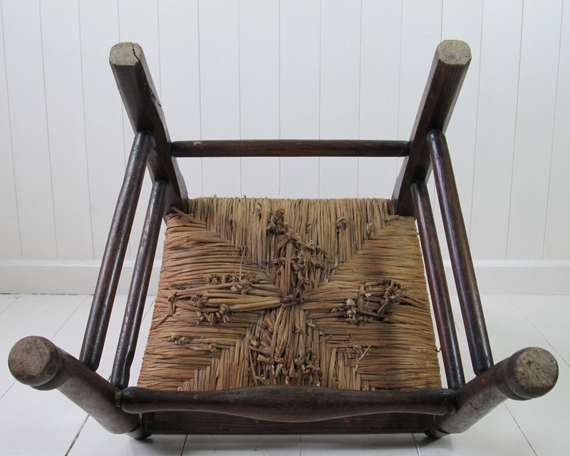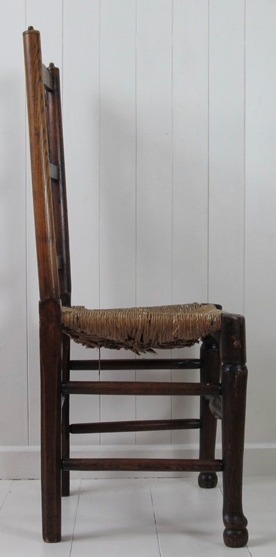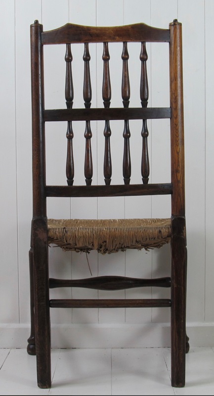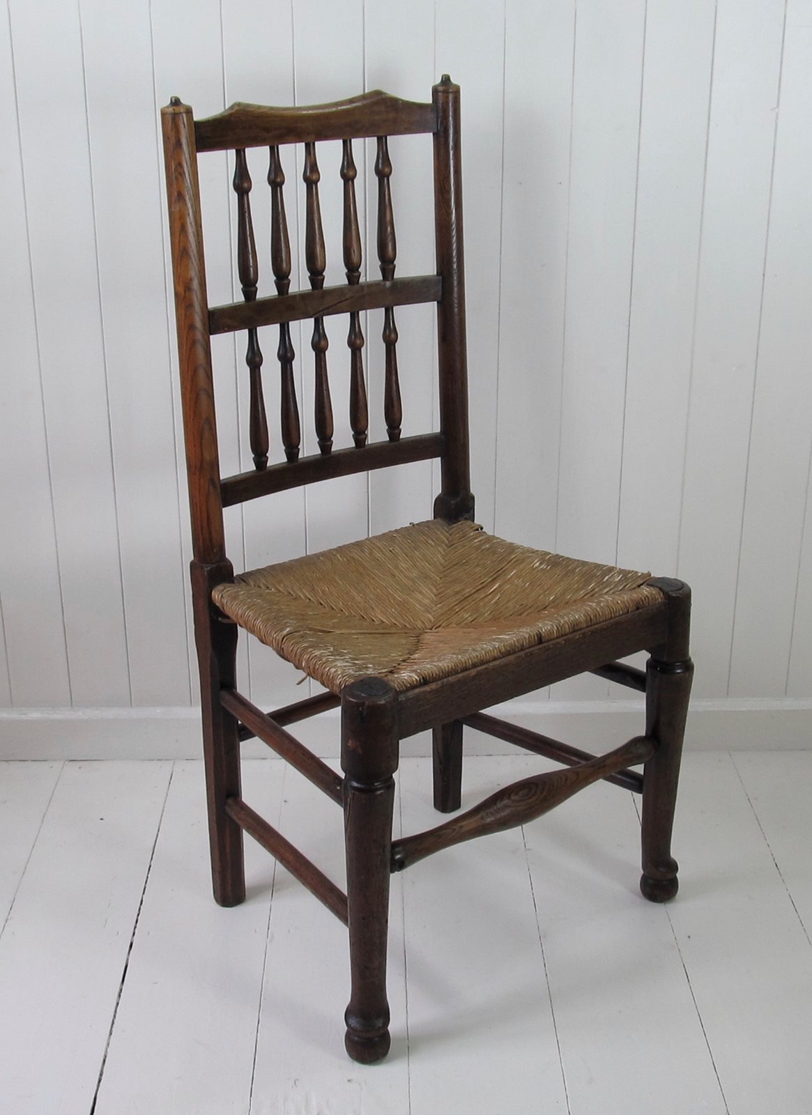 A perfect example of this classic 19th century chair with two rows of five turned spindles, rush seat and pad feet to the front legs. The turned front legs are joined with an elegant turned stretcher, and the back legs are straight. The rush seat is in good condition. There is some (not recent) filler visible behind one of the back legs. The chair has a really attractive aged feel with a rich, warm patina to the wood.