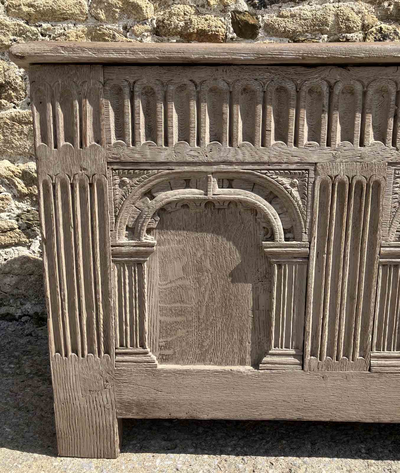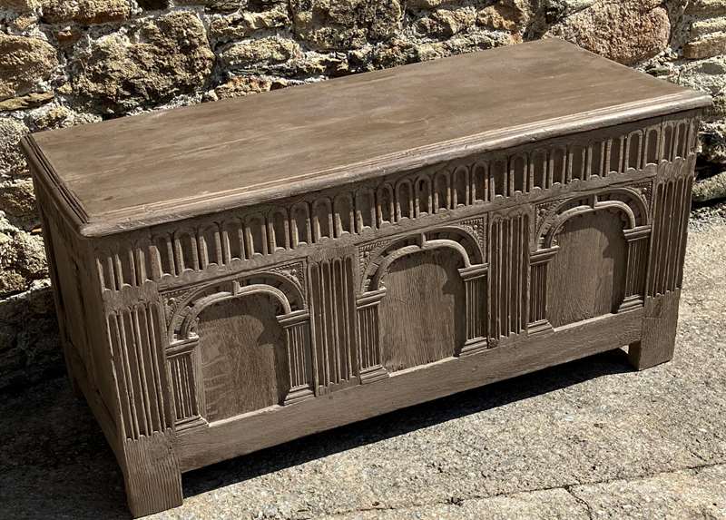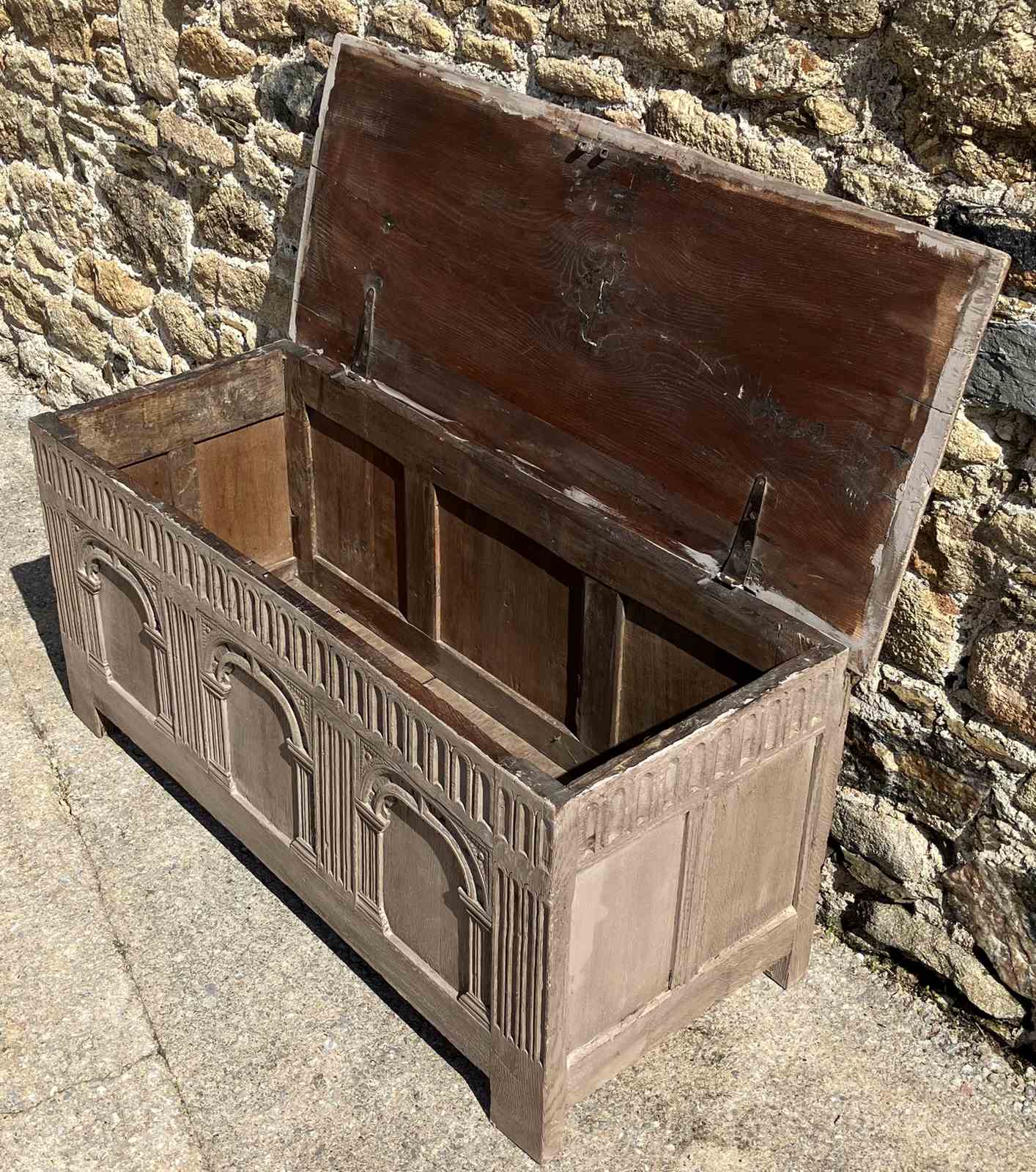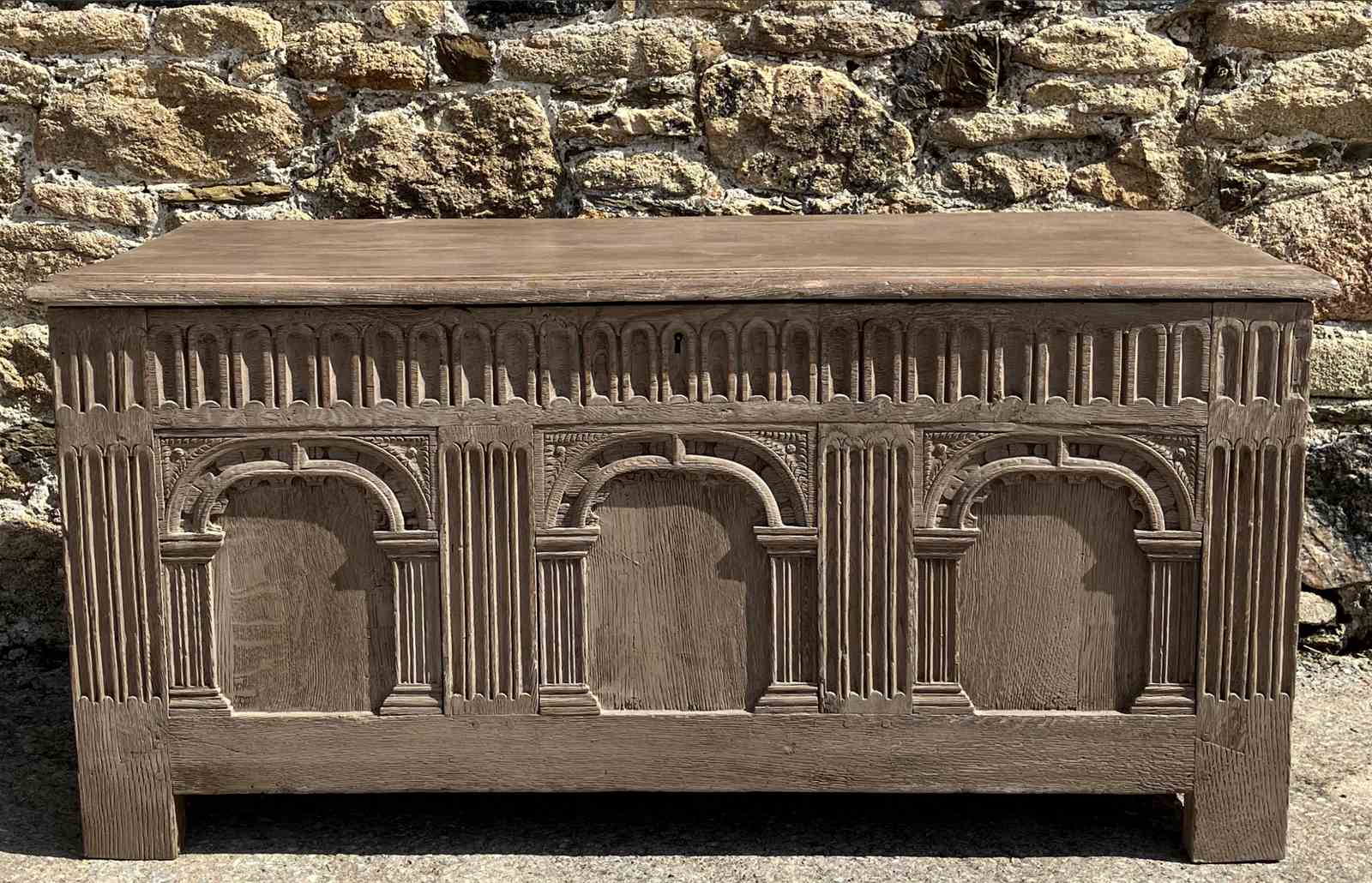 This beautifully carved coffer is full of character with a very rustic feel. The coffer has been sandblasted to enhance the texture of the wood, then lightly colour-washed and waxed. It’s very sturdy and in good vintage condition, with more recent hinges and an old repair to the top.