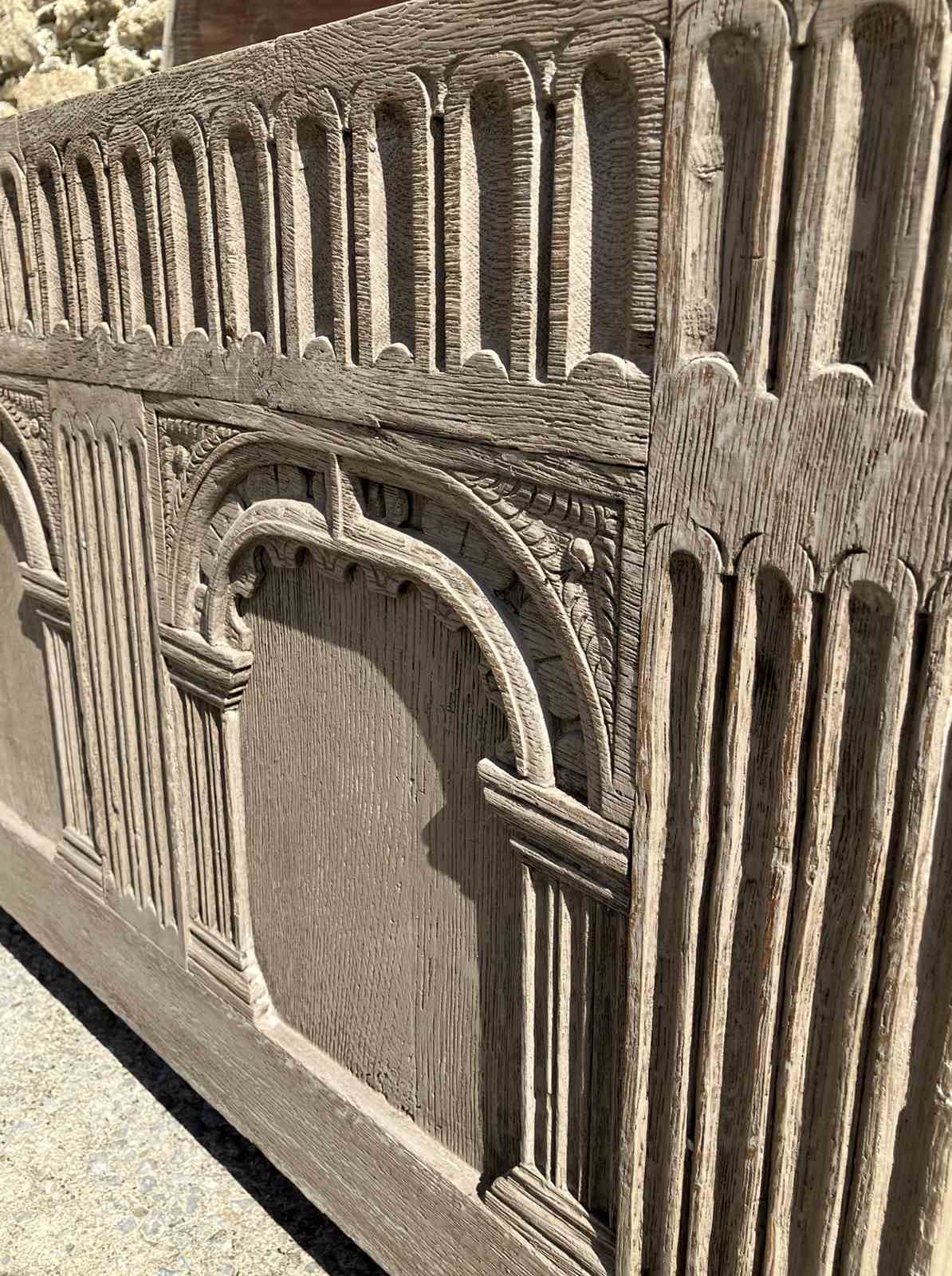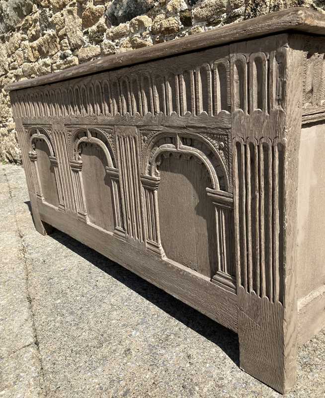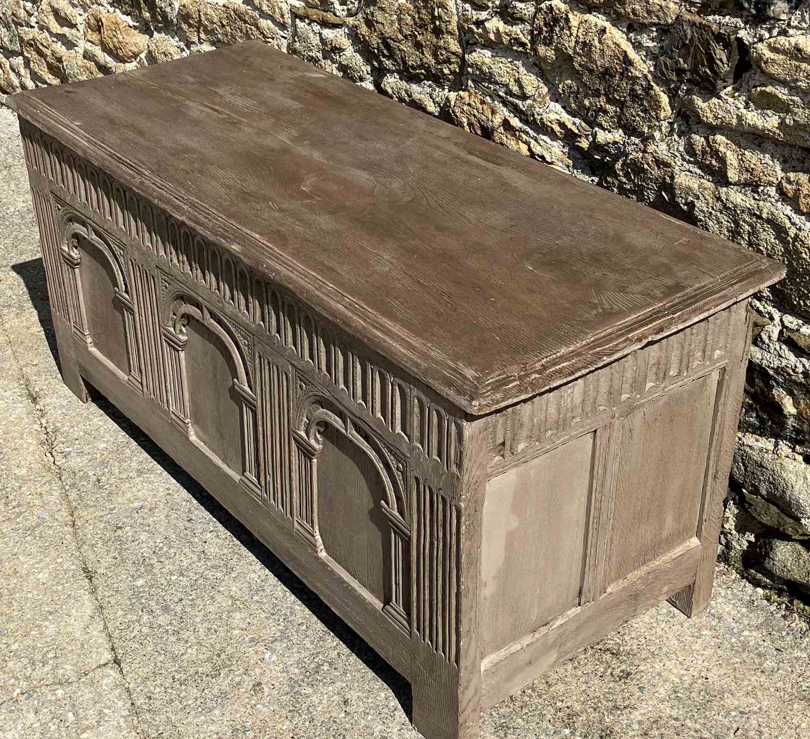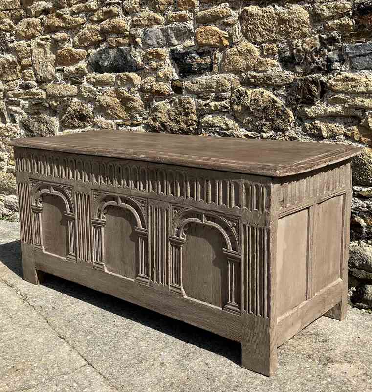 This beautifully carved coffer is full of character with a very rustic feel. The coffer has been sandblasted to enhance the texture of the wood, then lightly colour-washed and waxed. It’s very sturdy and in good vintage condition, with more recent hinges and an old repair to the top.