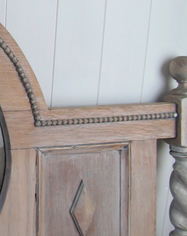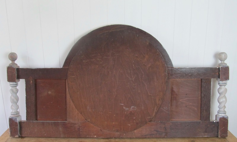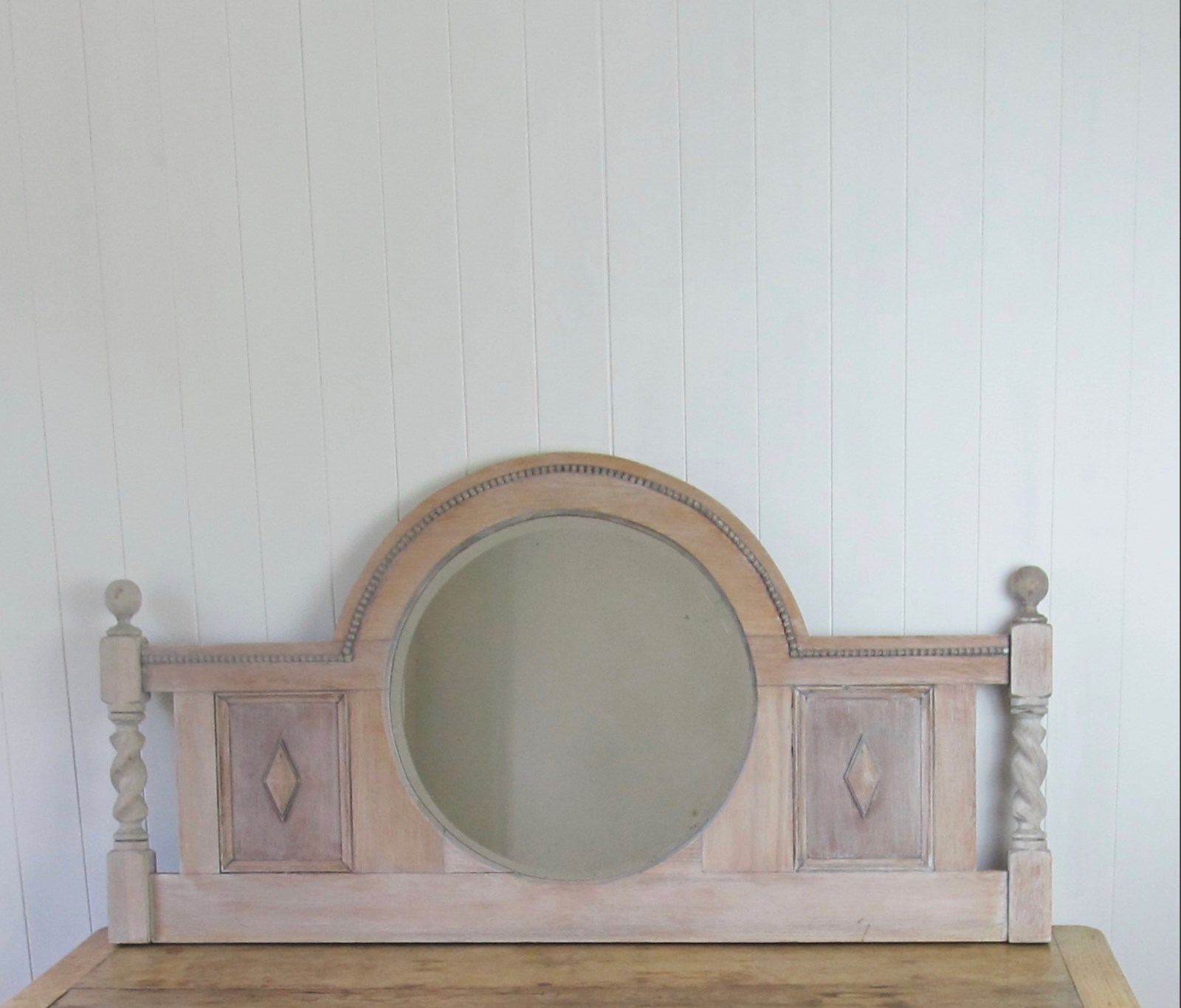 This attractive Edwardian overmantel with circular mirror section has some interesting detailing: beading around the mirror, side panels with diamond insets and barley twist side columns with ball finials.