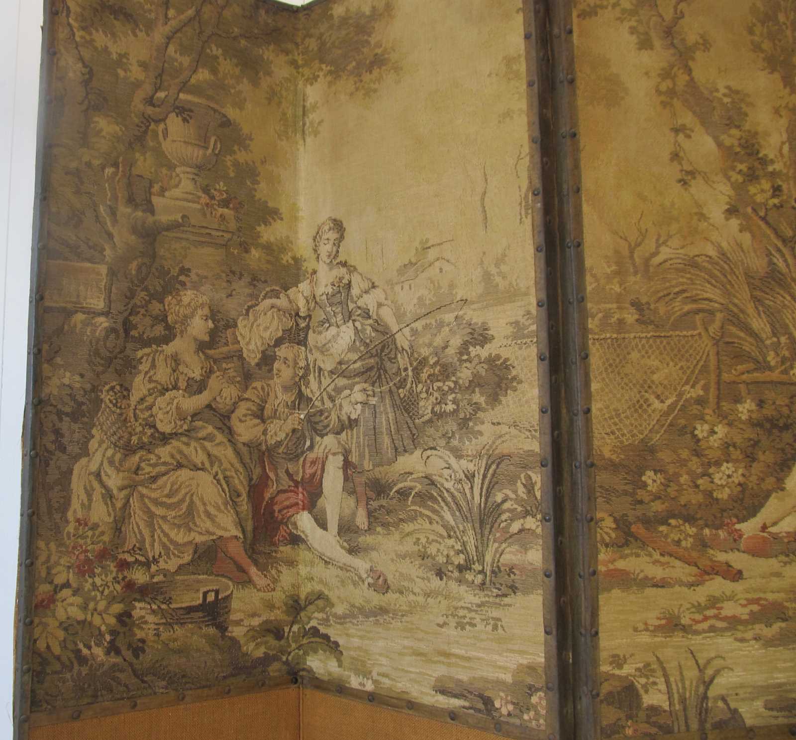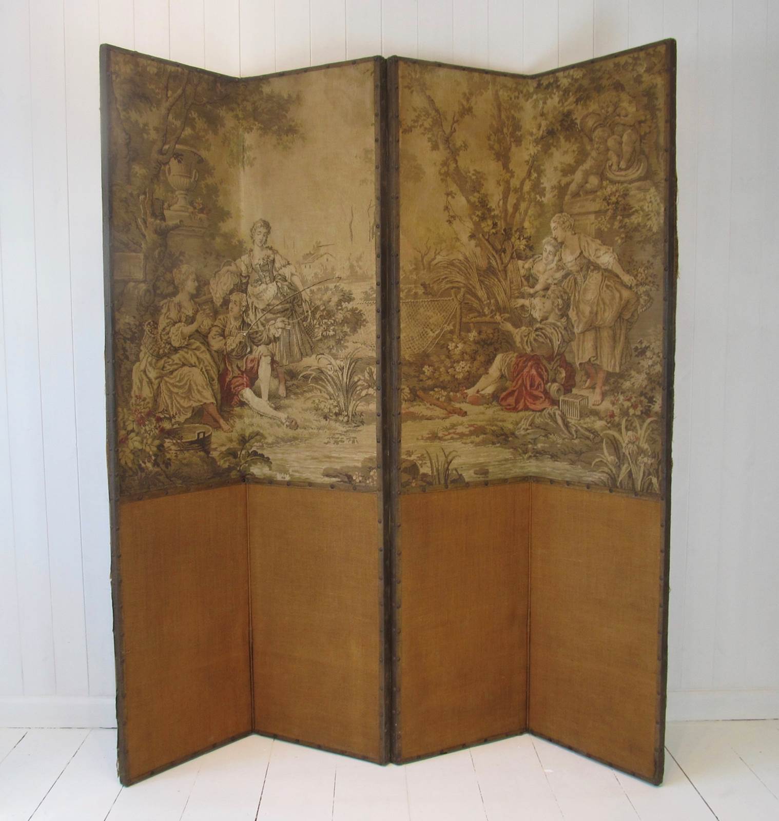 Decorative 19th century four-panel folding screen, with tapestry upper sections and hessian lower sections. The scene in the tapestry depicts 18th century figures in a pastoral scene with foliage, classical urns and statues.