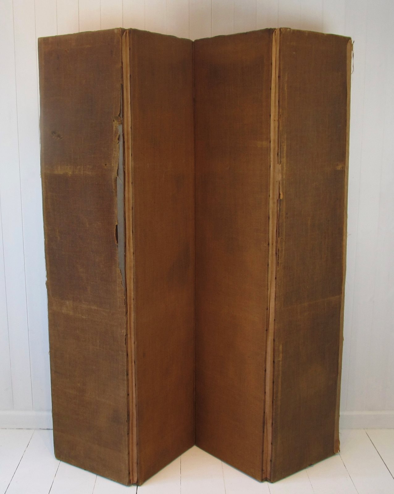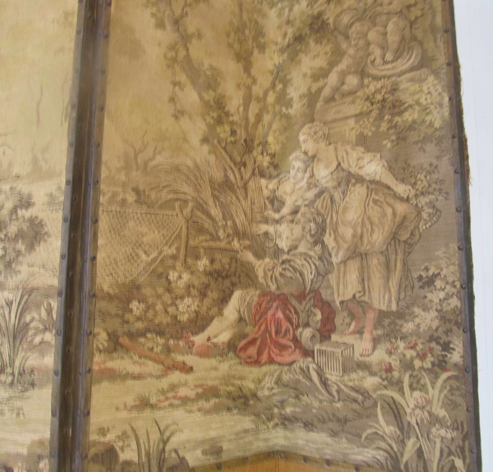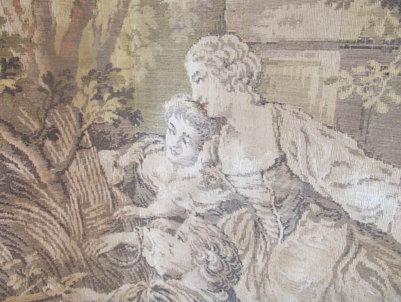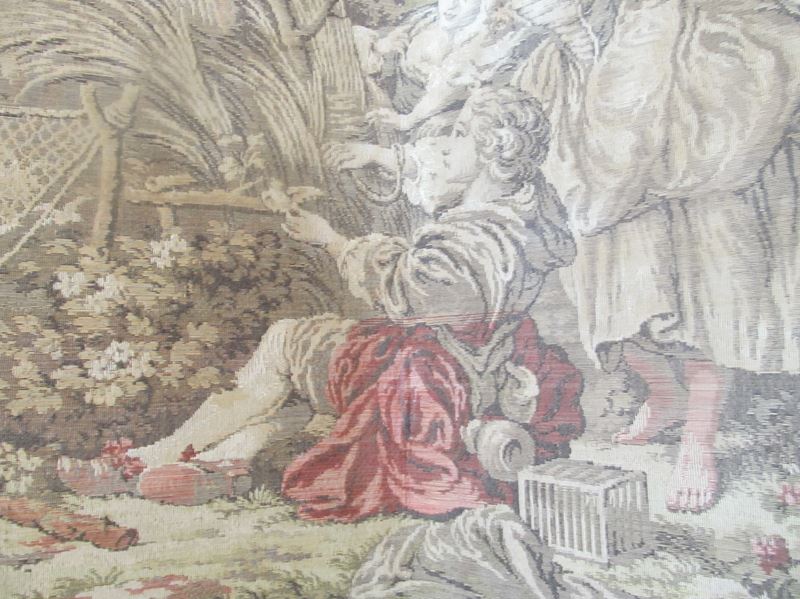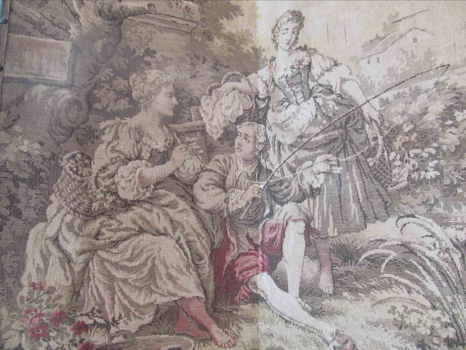 The tapestry is on one side only, with the reverse in hessian. This is in its original, unrestored condition, and the tapestry is faded to soft, muted green and sepia colours with some brighter reds on the clothing of the figures, which gives it a lovely aged feel. An ideal room divider or prop.