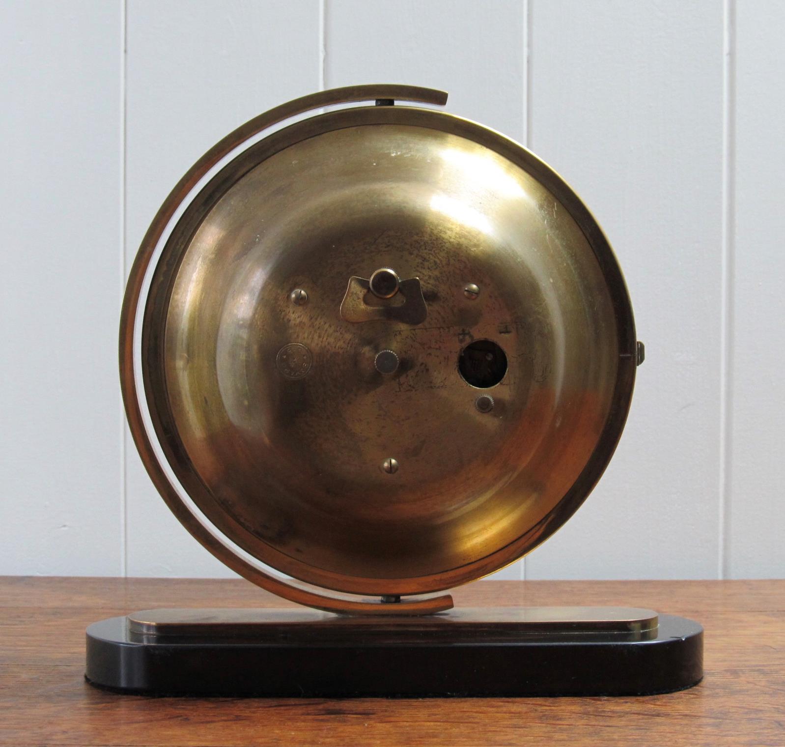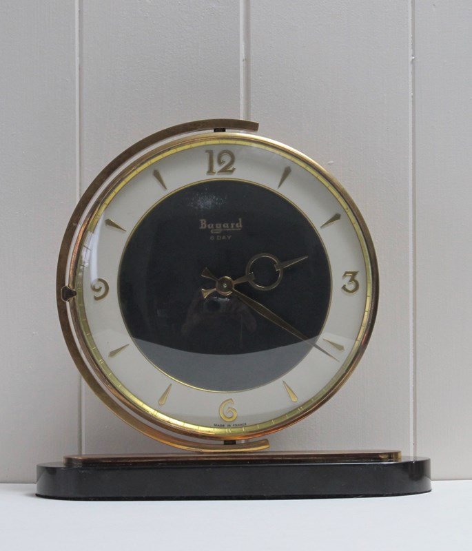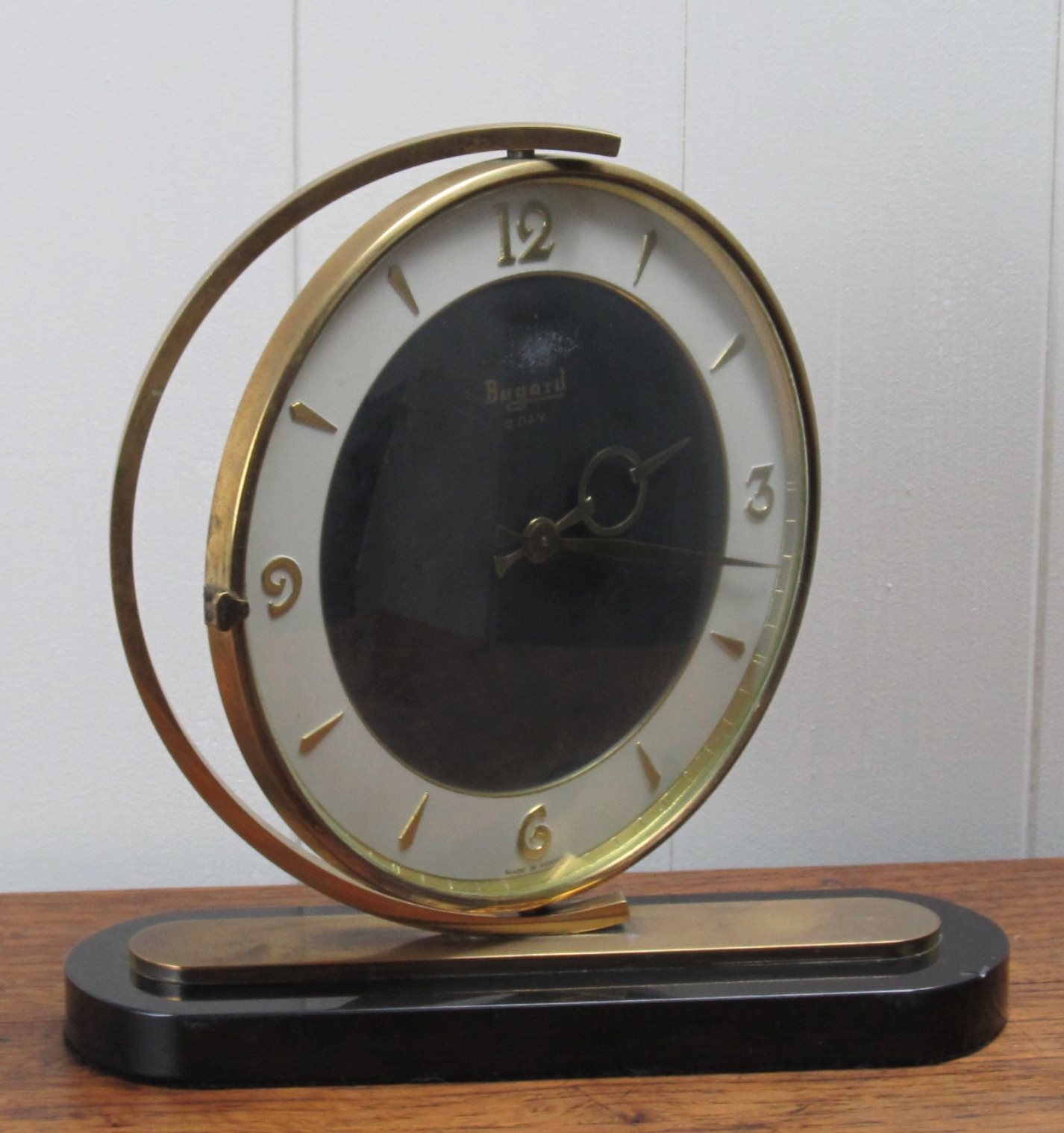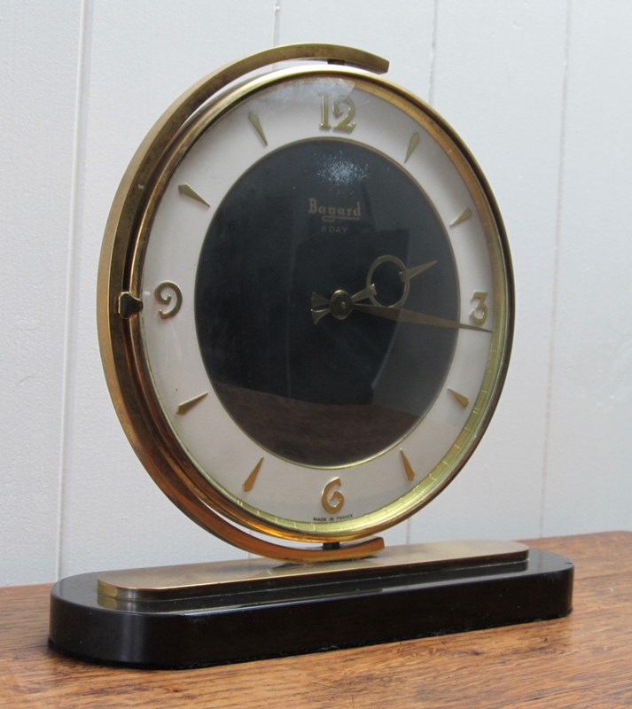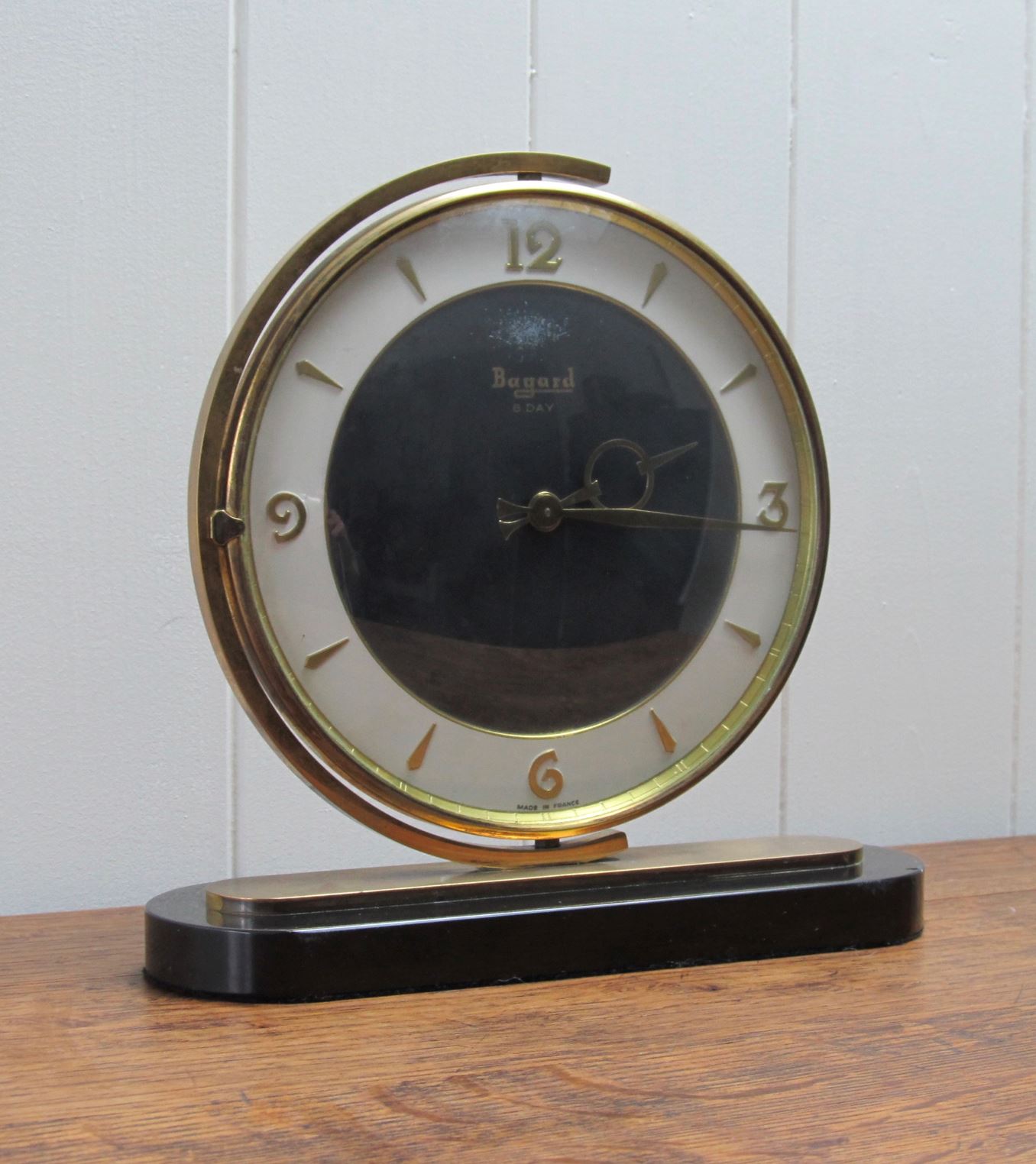 This elegant 1930s Bayard 8-day mantel/table clock stands on an elongated oval black marble base with bronze stand. The curved stand supporting the clock face allows the clock face to swivel round through 360 degrees. The inner circle on the clock face is black and the outer circle with the number is in a white finish with brass numbers and detailing. There is a slight nibble to one corner of the curved stone base, and a few scuffs to the glass just above the Bayard mark and below the 12. The clock is in good working order.