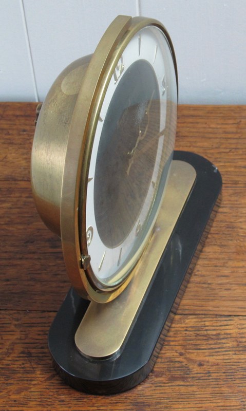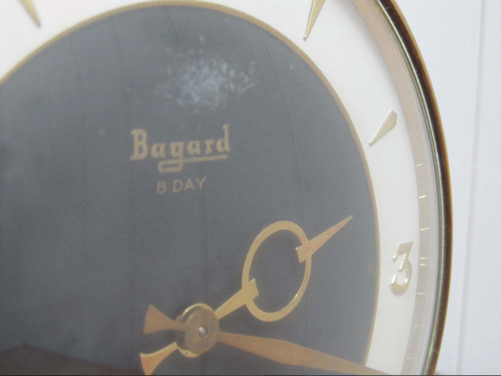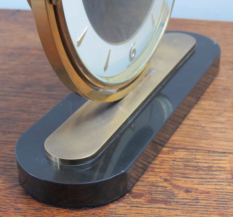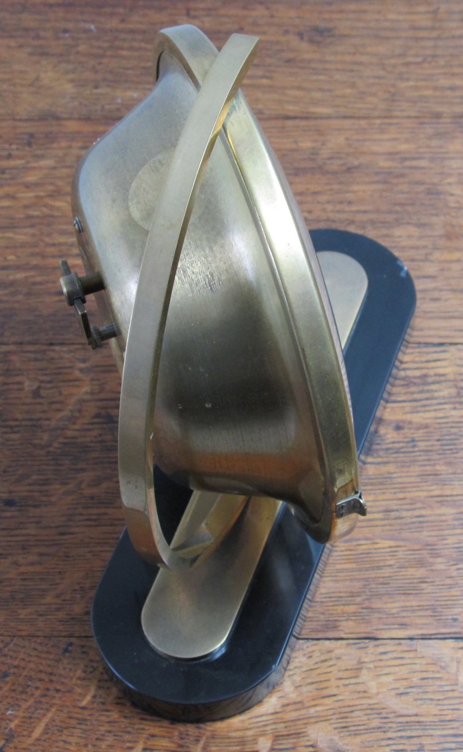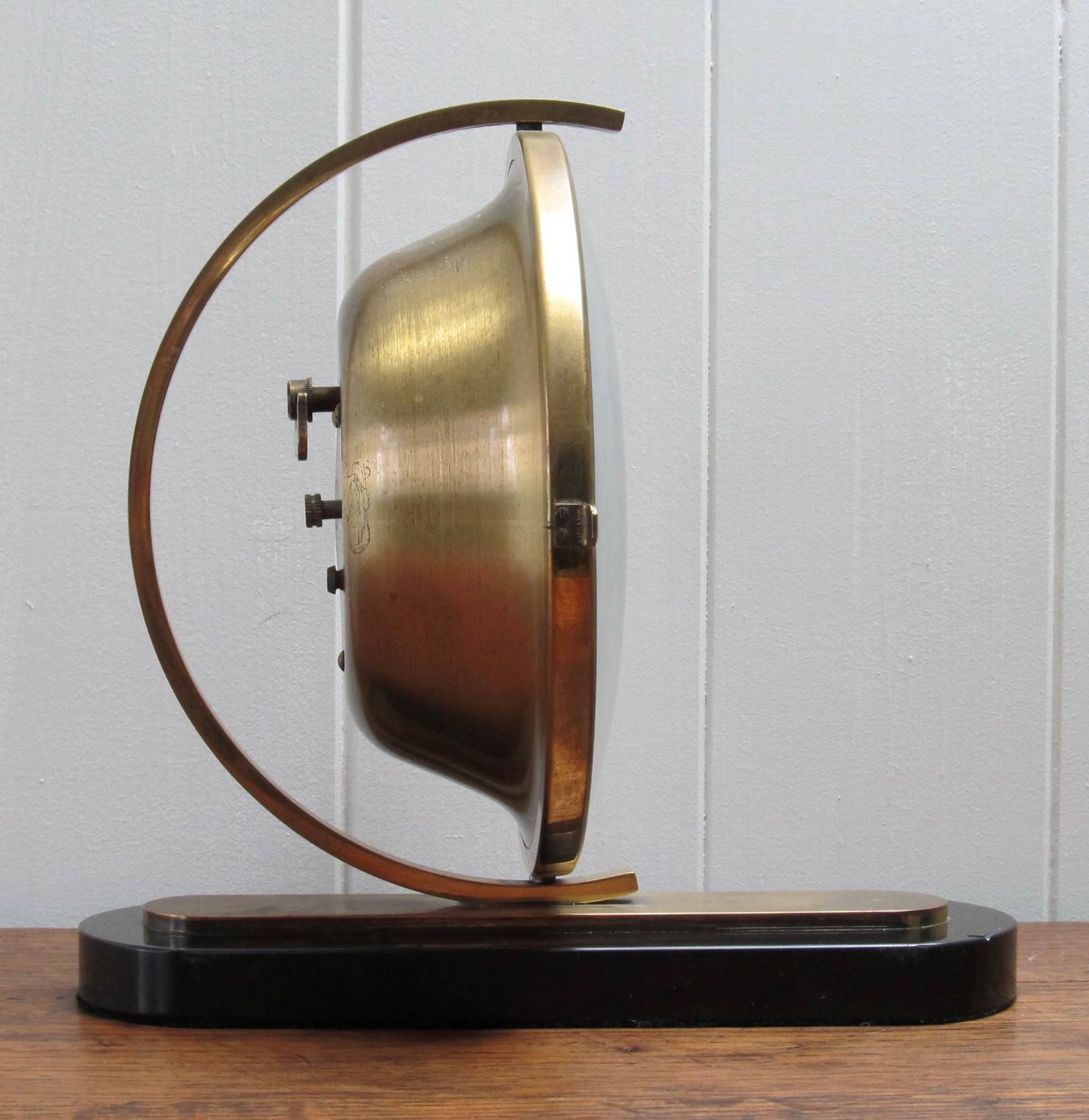 This elegant 1930s Bayard 8-day mantel/table clock stands on an elongated oval black marble base with bronze stand. The curved stand supporting the clock face allows the clock face to swivel round through 360 degrees. The inner circle on the clock face is black and the outer circle with the number is in a white finish with brass numbers and detailing. There is a slight nibble to one corner of the curved stone base, and a few scuffs to the glass just above the Bayard mark and below the 12. The clock is in good working order.