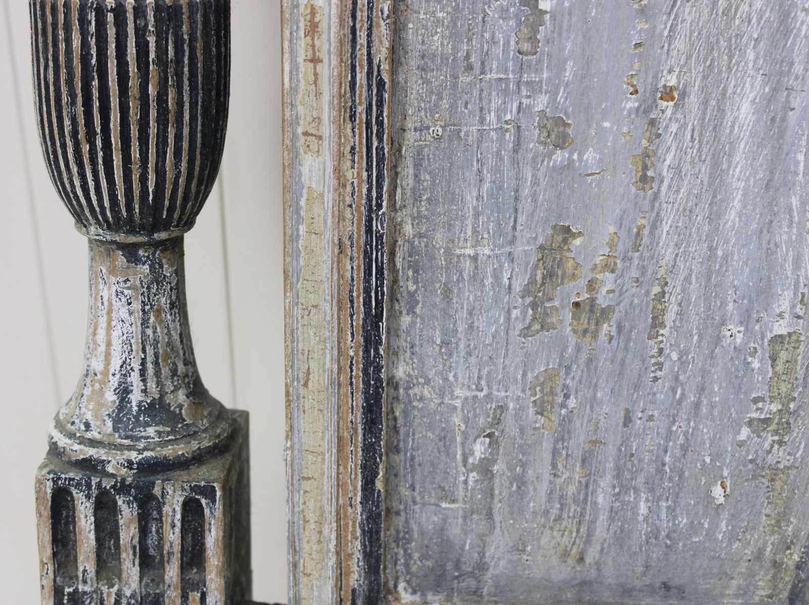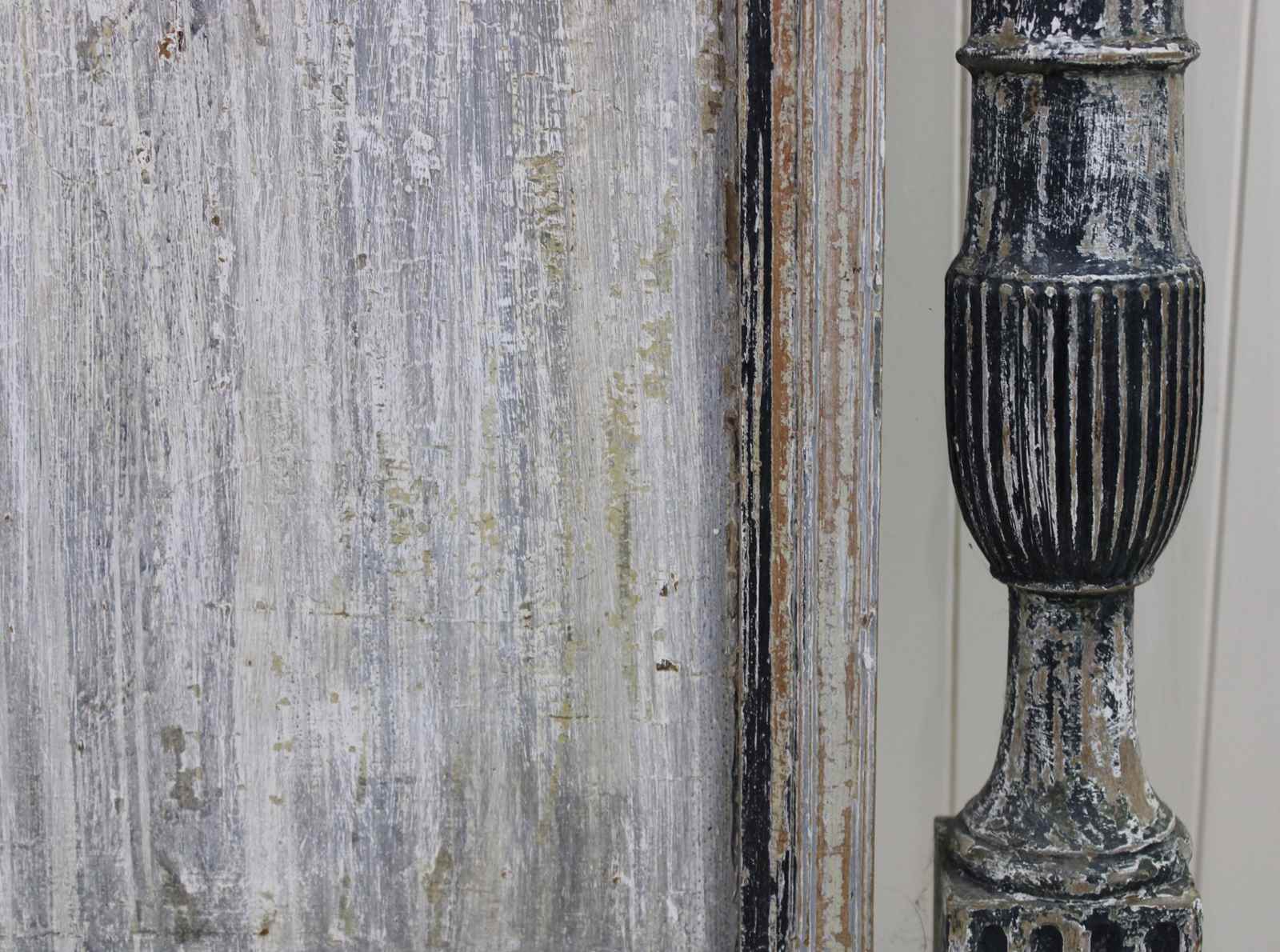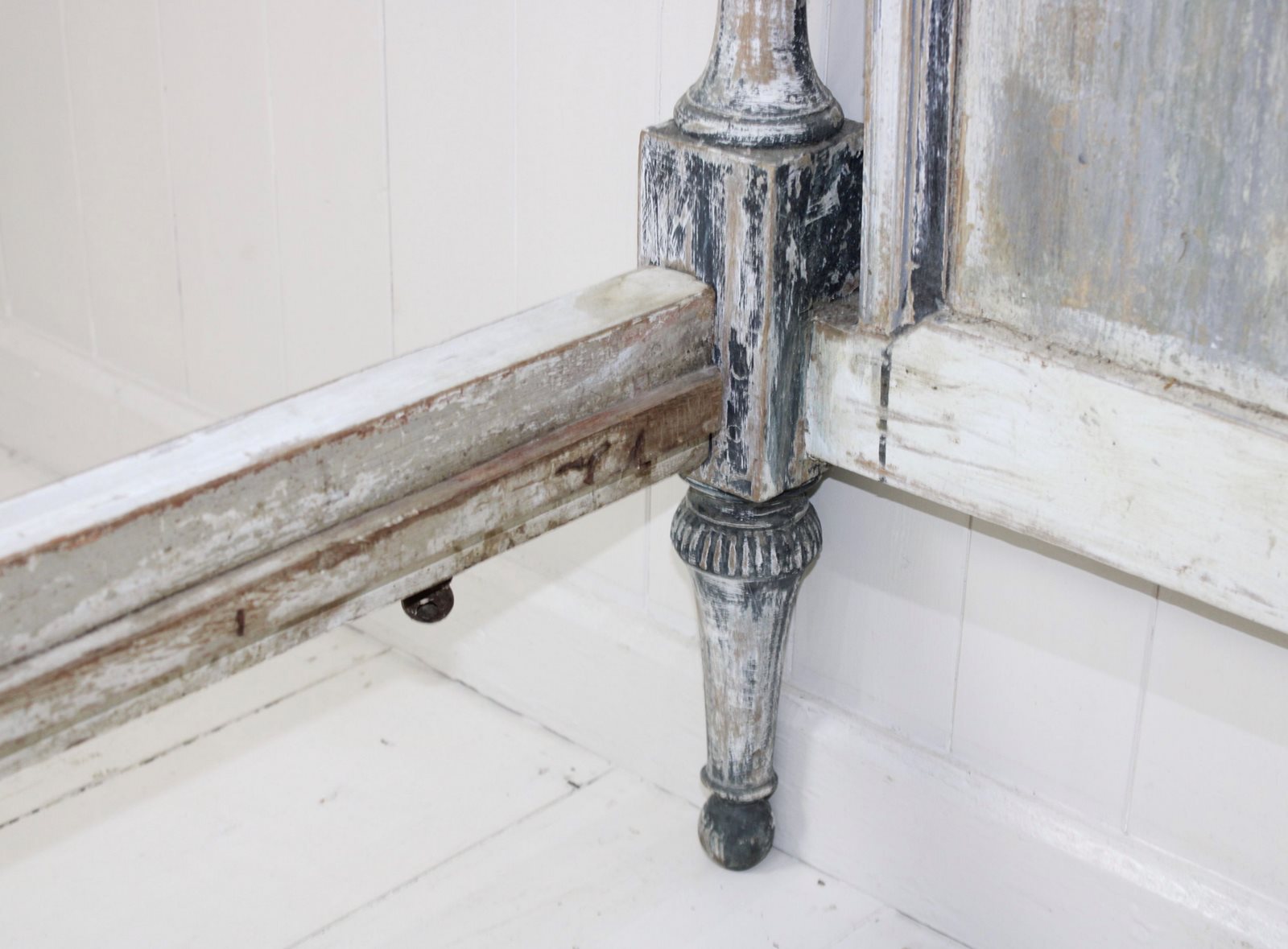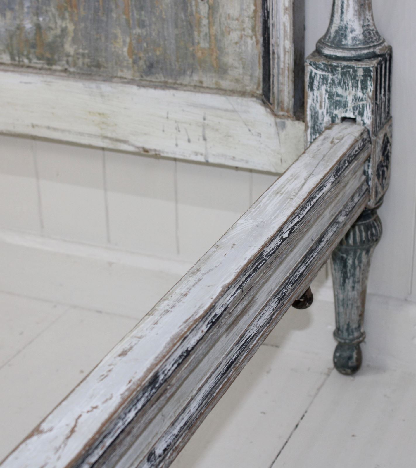 This bed frame is a rare find because of the extraordinary depth of colour and texture to the old layers of paint. This gives it the feel of a piece of art, rather than furniture. It has a rich patina of blues, greys and teal.