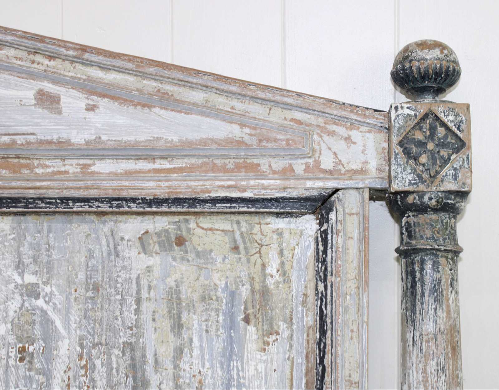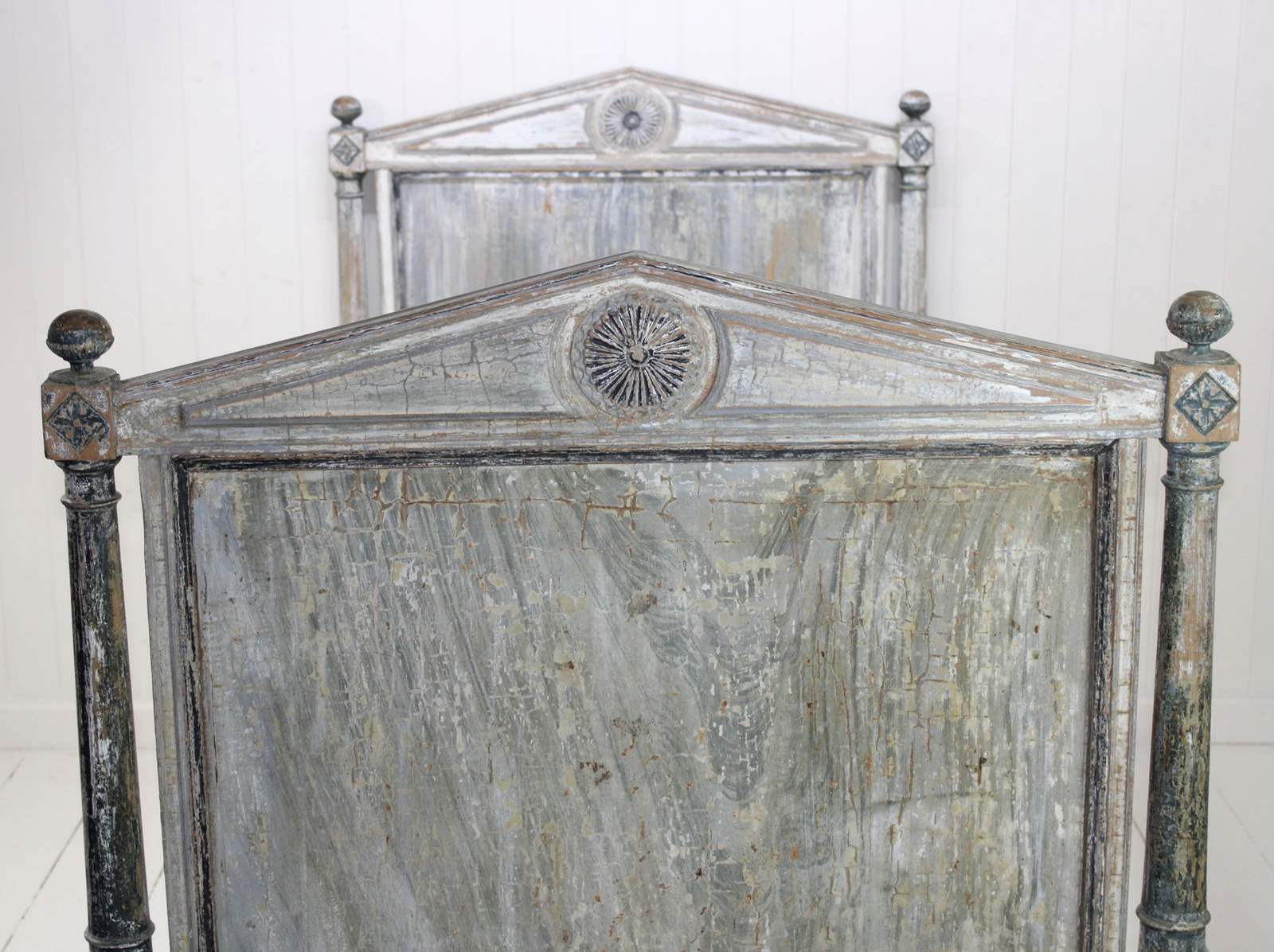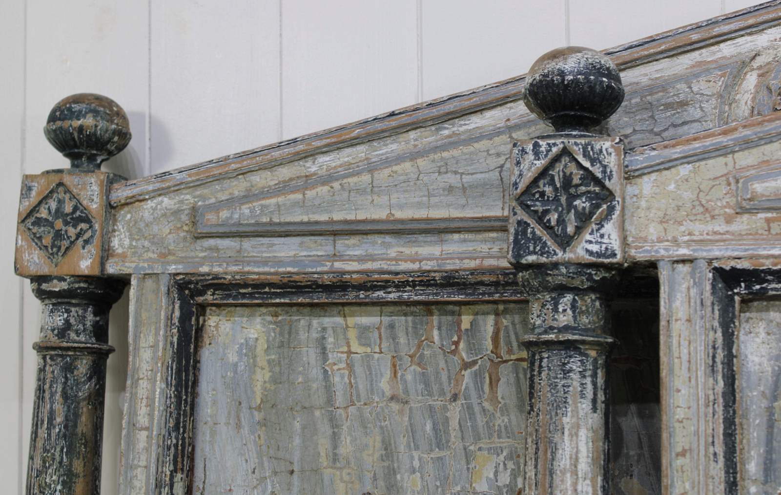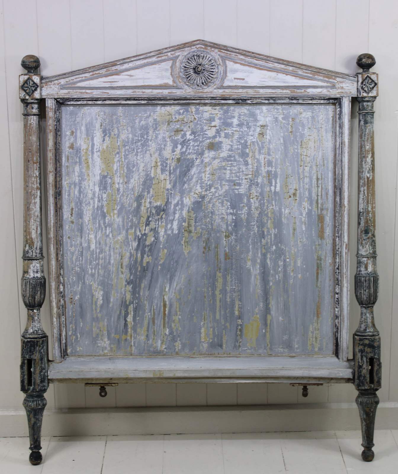 This bed frame is a rare find because of the extraordinary depth of colour and texture to the old layers of paint. This gives it the feel of a piece of art, rather than furniture. It has a rich patina of blues, greys and teal.
