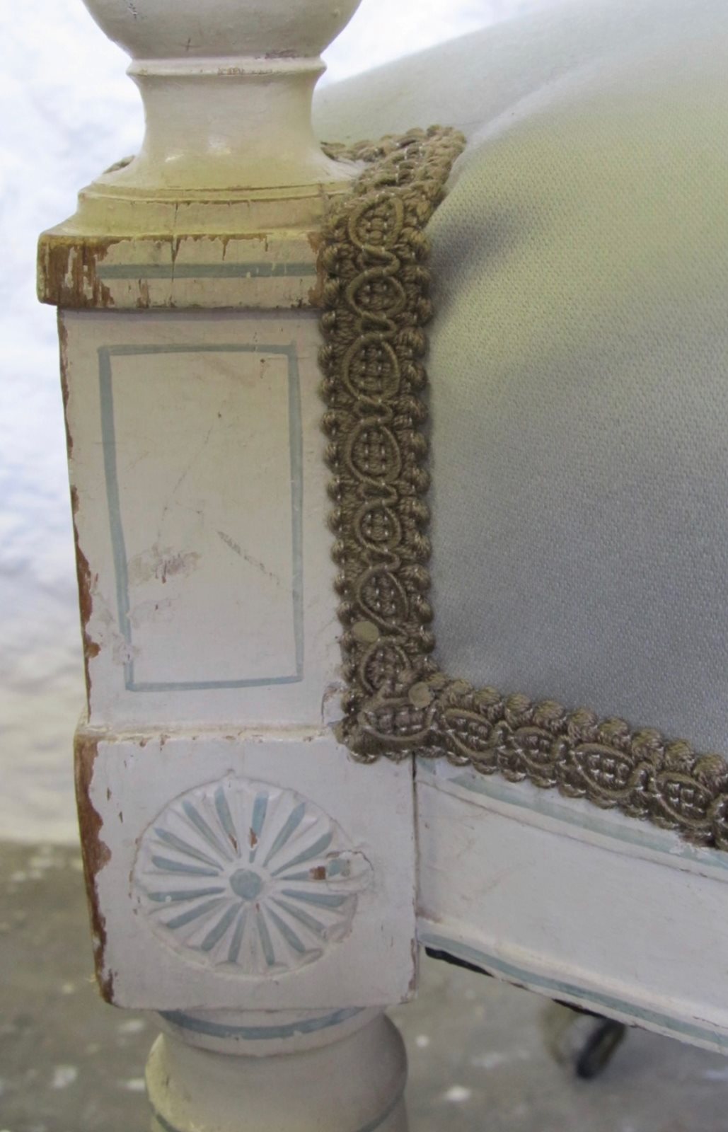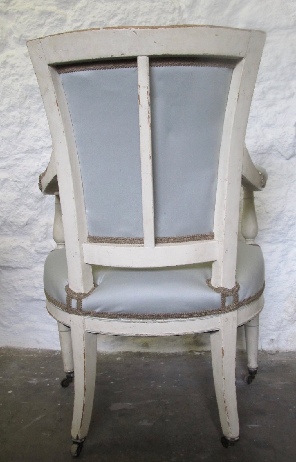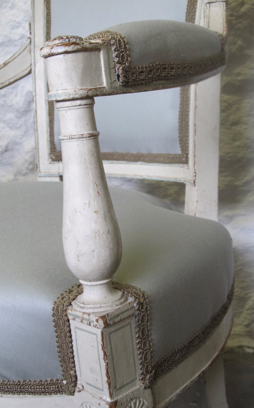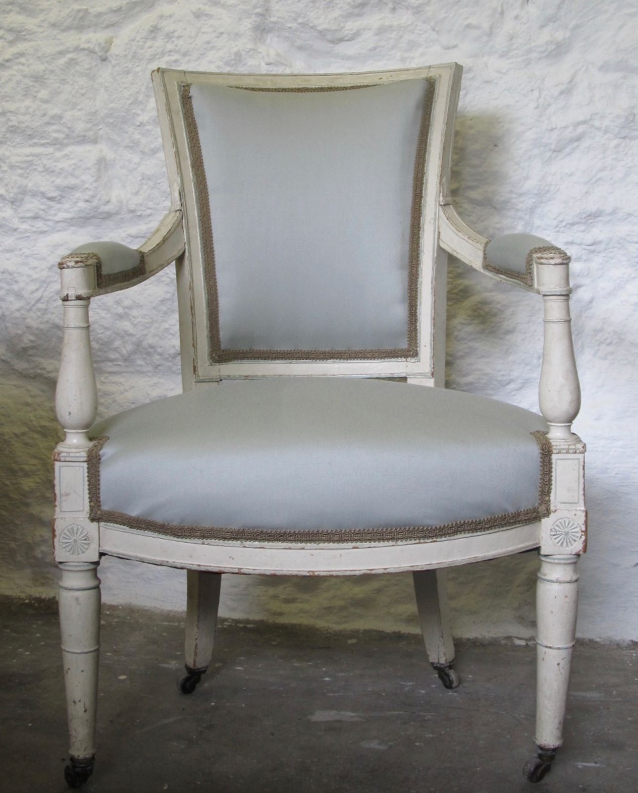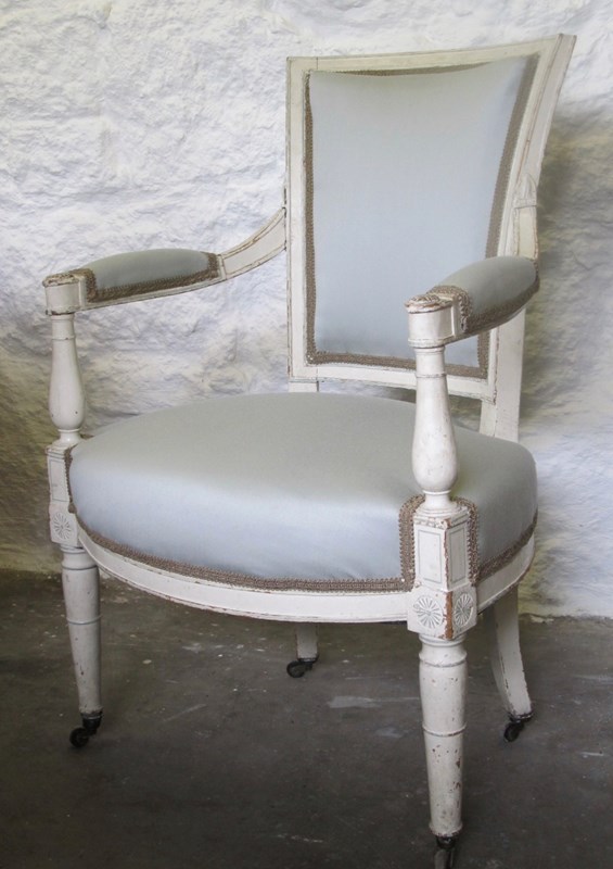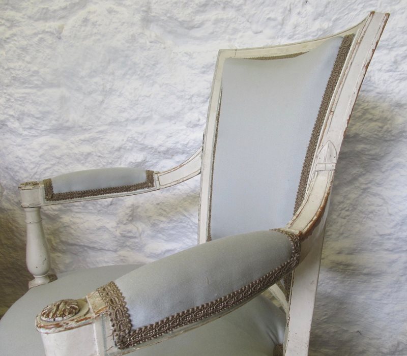 A French ca. 1890 light and elegant painted Directoire style chair with more recent (eau-de-nil colour) upholstery in good condition and braid trim.