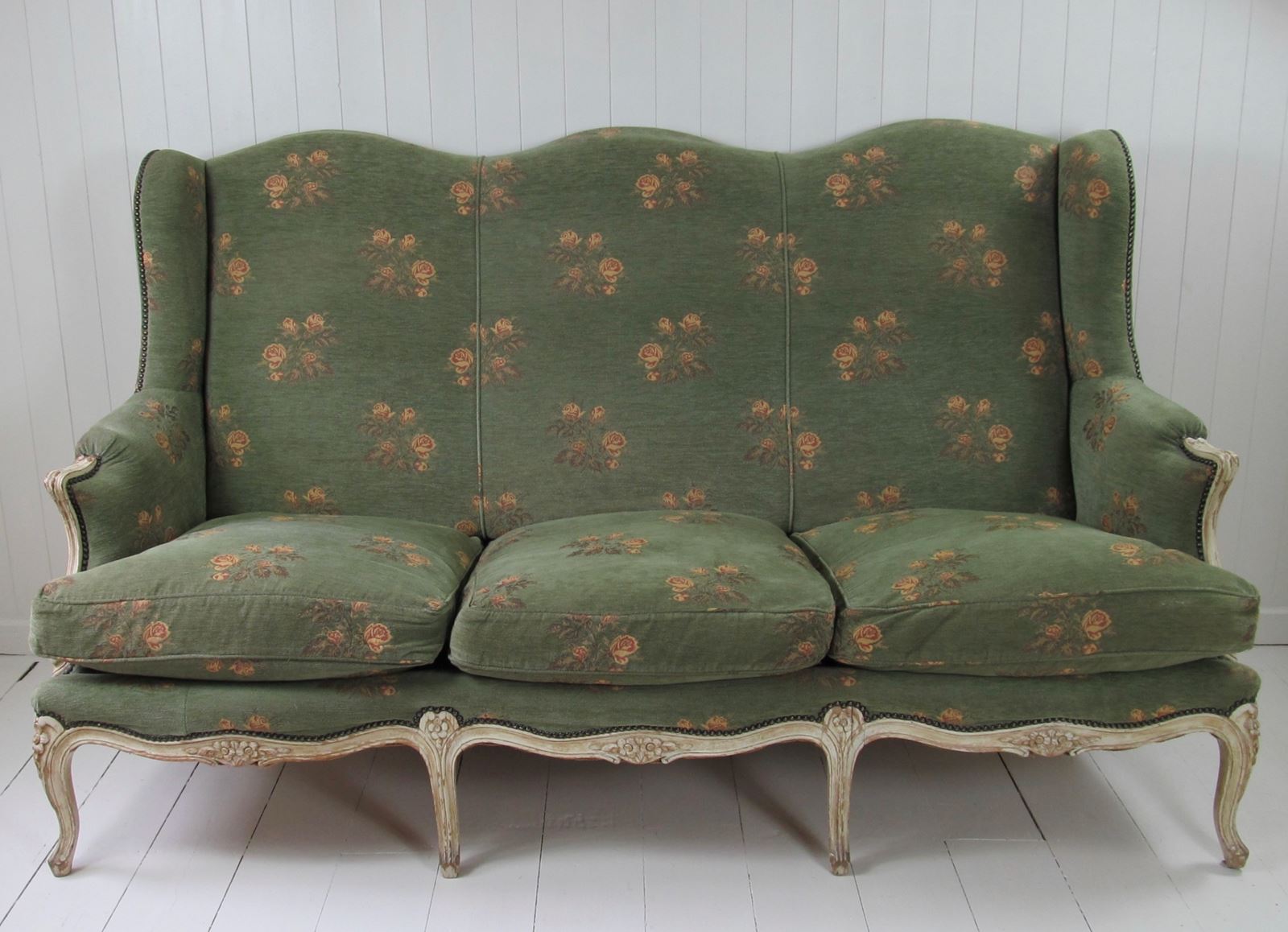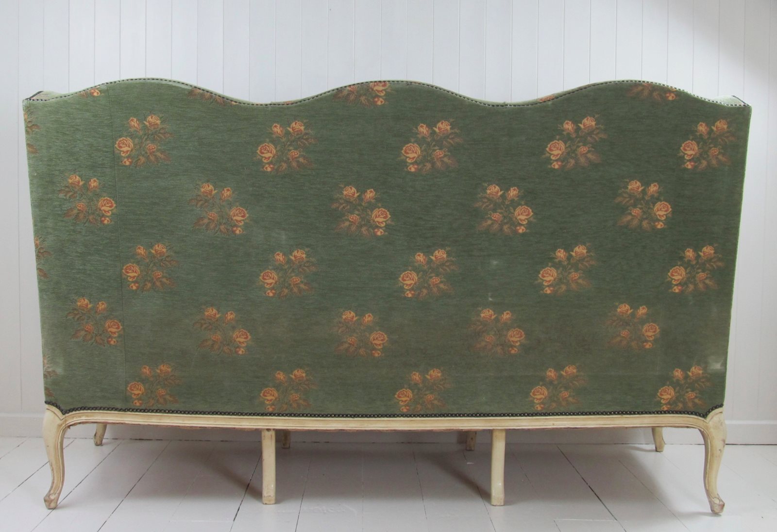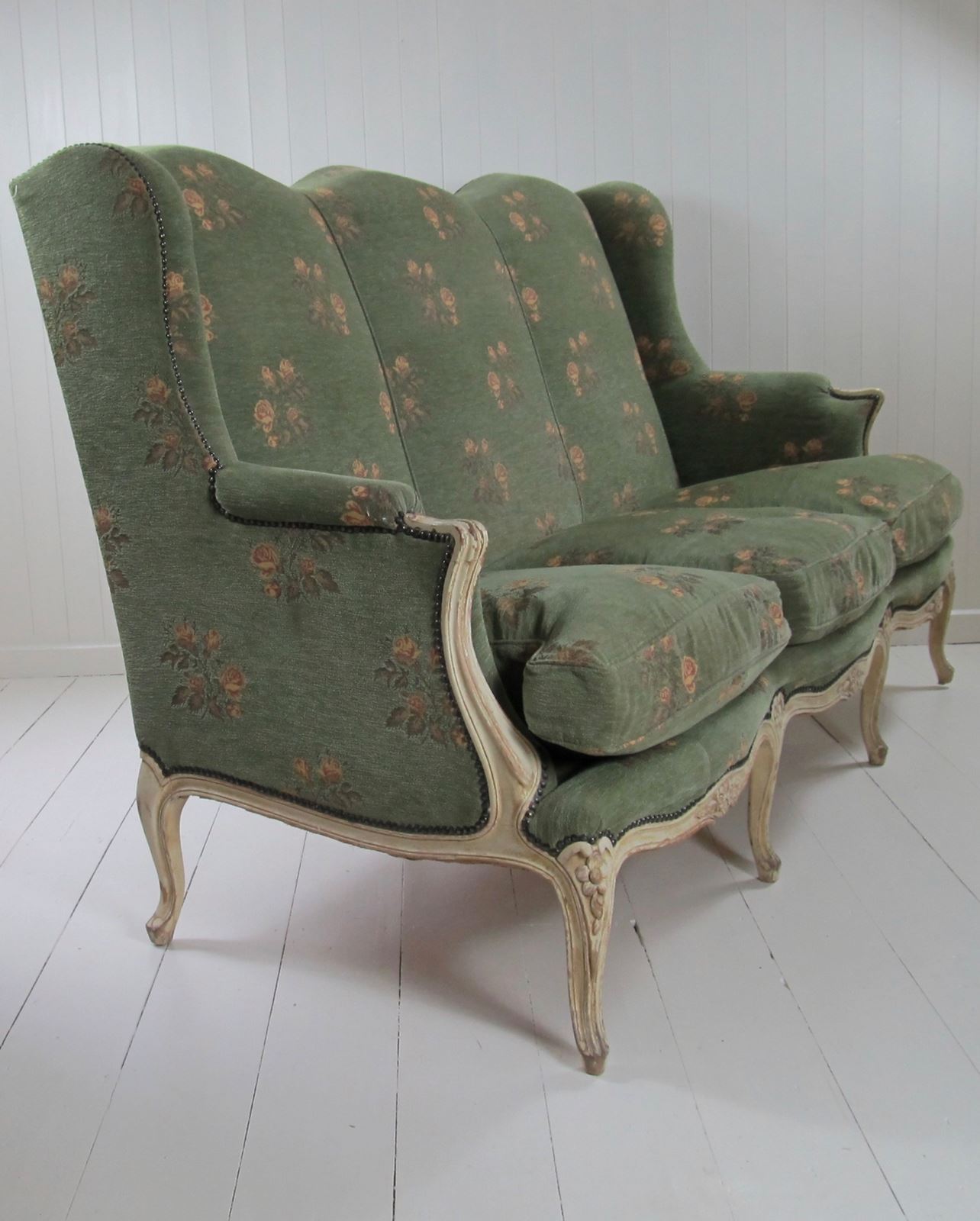 A large wingback French Louis XVI style sofa with beautiful serpentine back. This three-seater sofa has feather-filled seat cushions, and is extremely comfortable. The painted frame features carved floral motif detailing, and these, as well as the arm shape, are very much in the style of the renowned Maison Jansen workshop. The frame is sound and in good condition with a few superficial signs of age, as well as the expected wear to the paint finish.