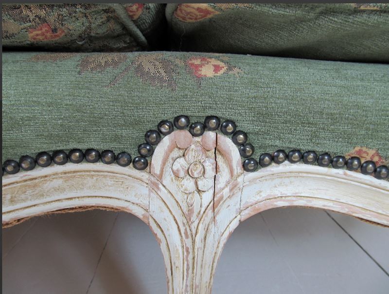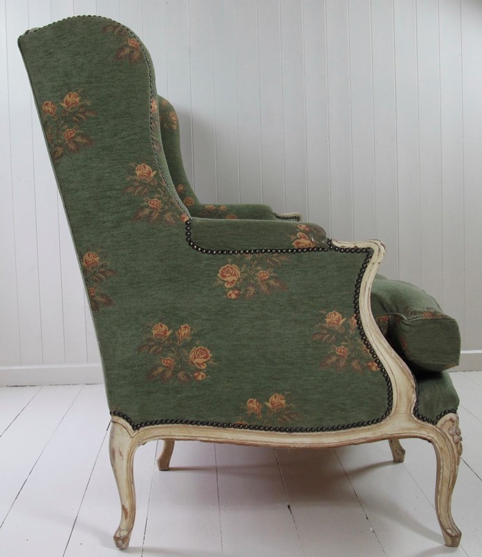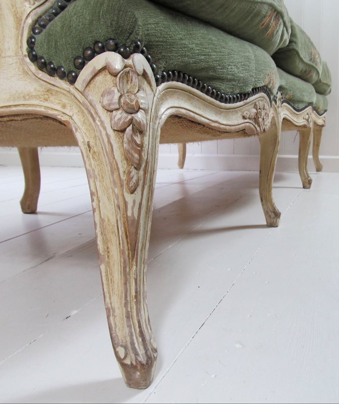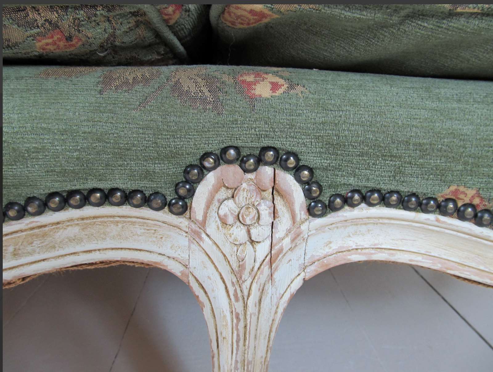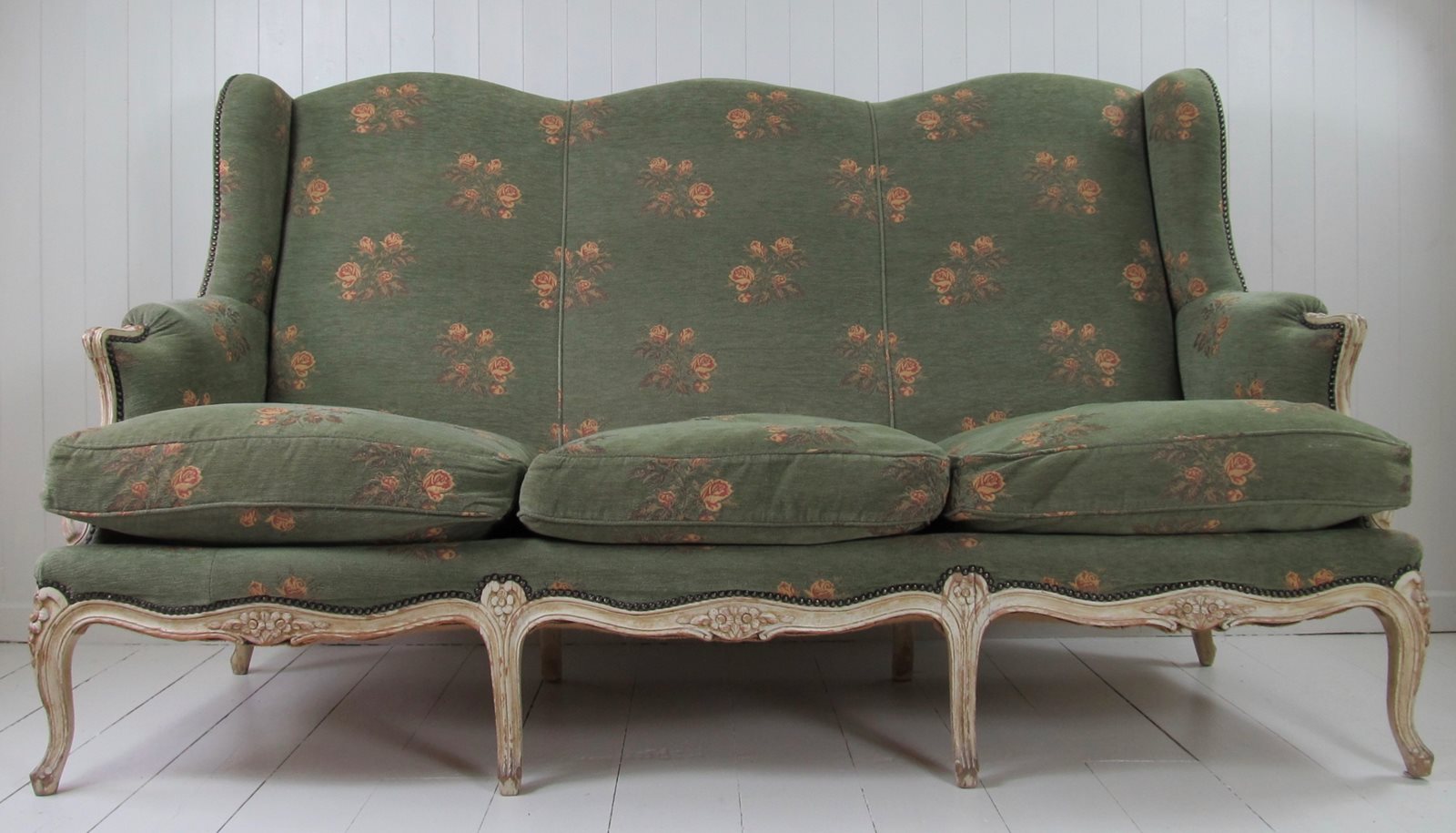 A large wingback French Louis XVI style sofa with beautiful serpentine back. This three-seater sofa has feather-filled seat cushions, and is extremely comfortable. The painted frame features carved floral motif detailing, and these, as well as the arm shape, are very much in the style of the renowned Maison Jansen workshop. The frame is sound and in good condition with a few superficial signs of age, as well as the expected wear to the paint finish.