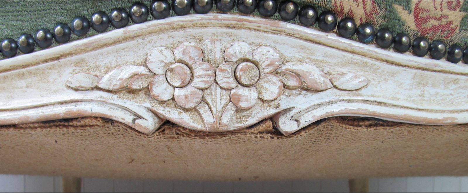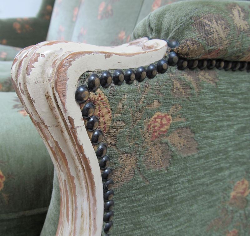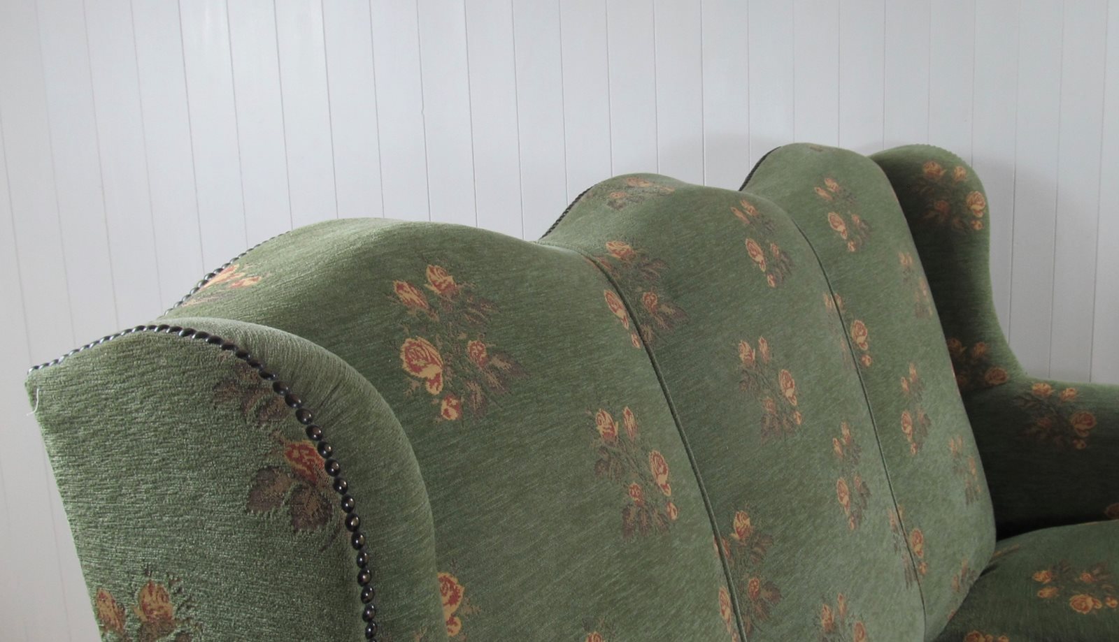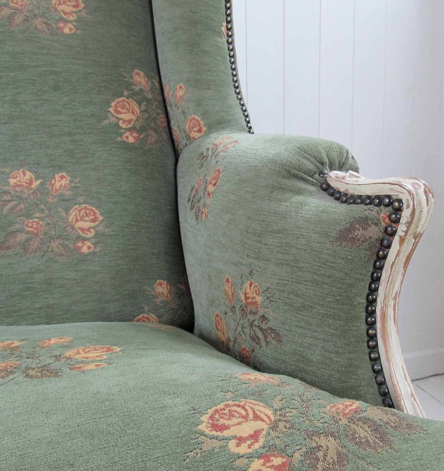 It’s been well upholstered with extensive stud trim. The upholstery shows signs of slight wear in some places, but is in a very good state overall.