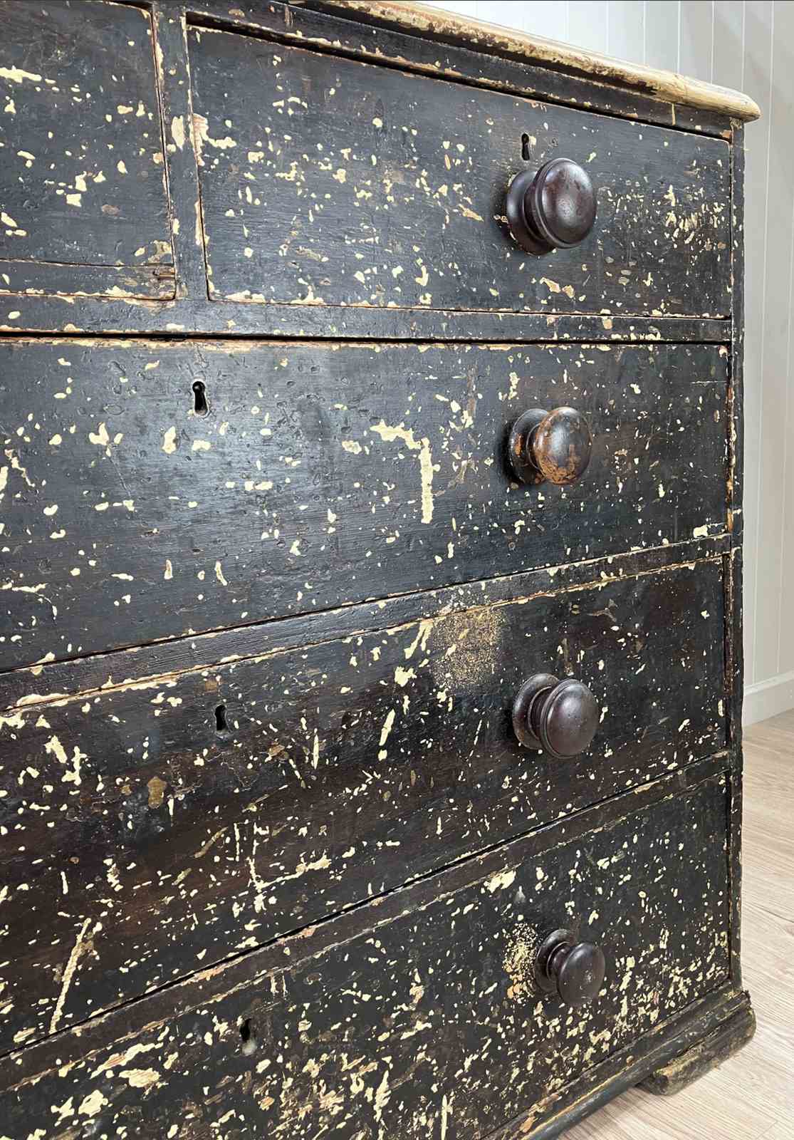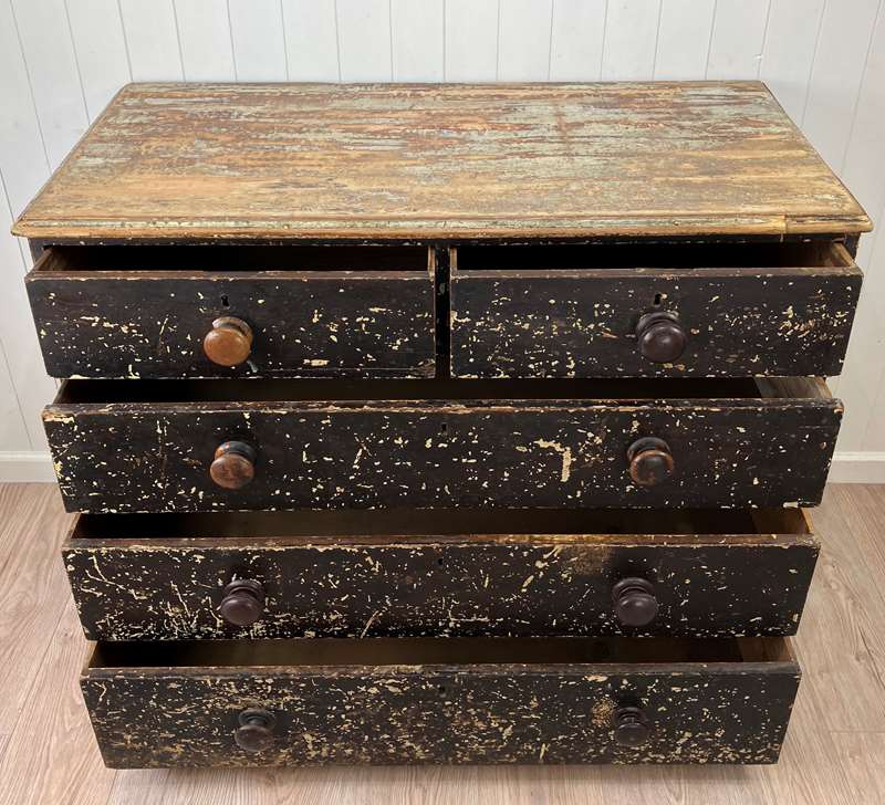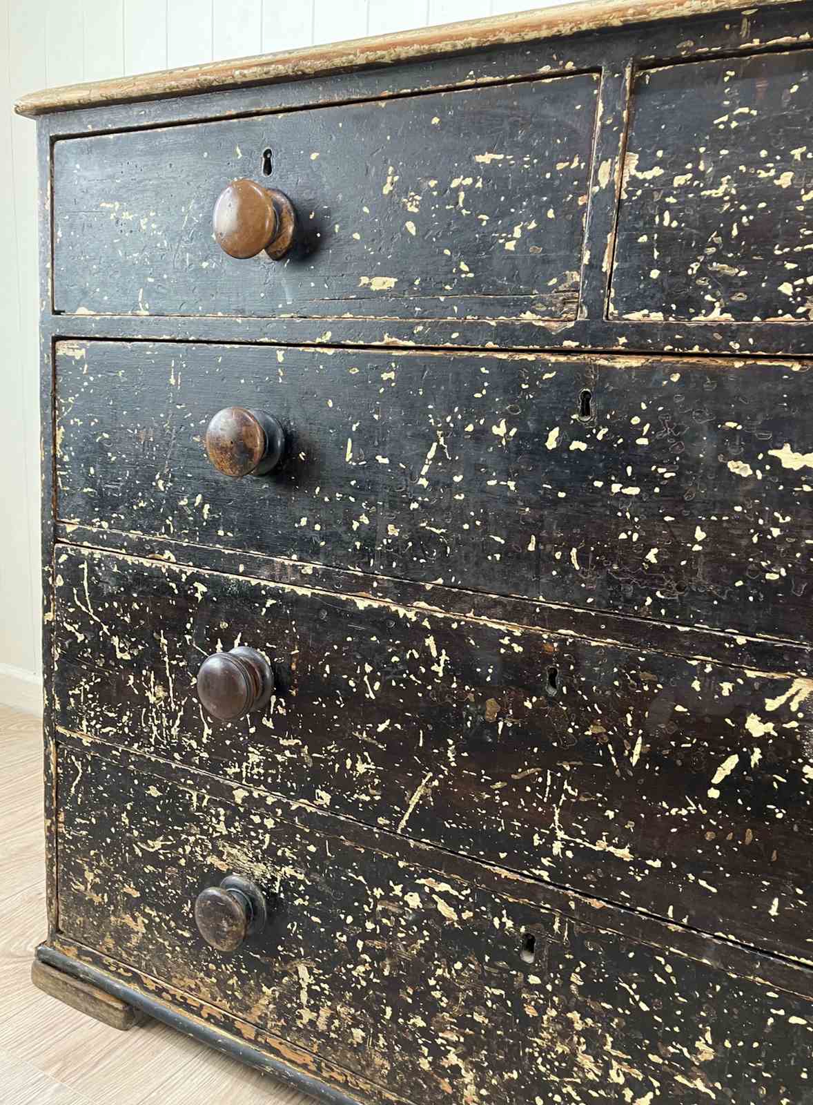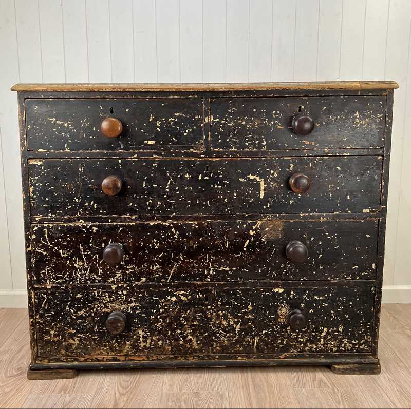 This is a striking chest of drawers with layers of very old paint giving it tremendous texture on both the base and the top. The original old wooden handles in variegated shades add to its character. As well as being eye-catching, it’s also a thoroughly practical piece of furniture with large, deep drawers – two short over three long. The backplate of one of the handles is broken (please see listing images), but the handles are all intact.
