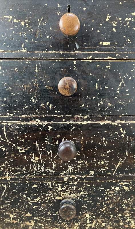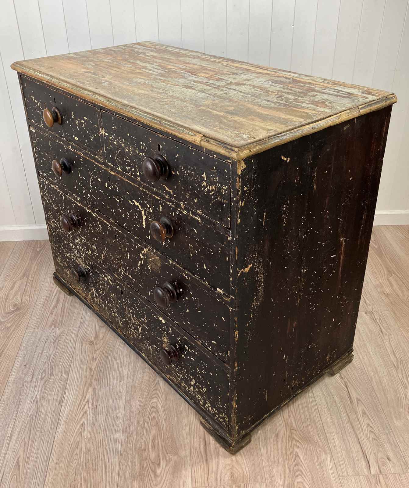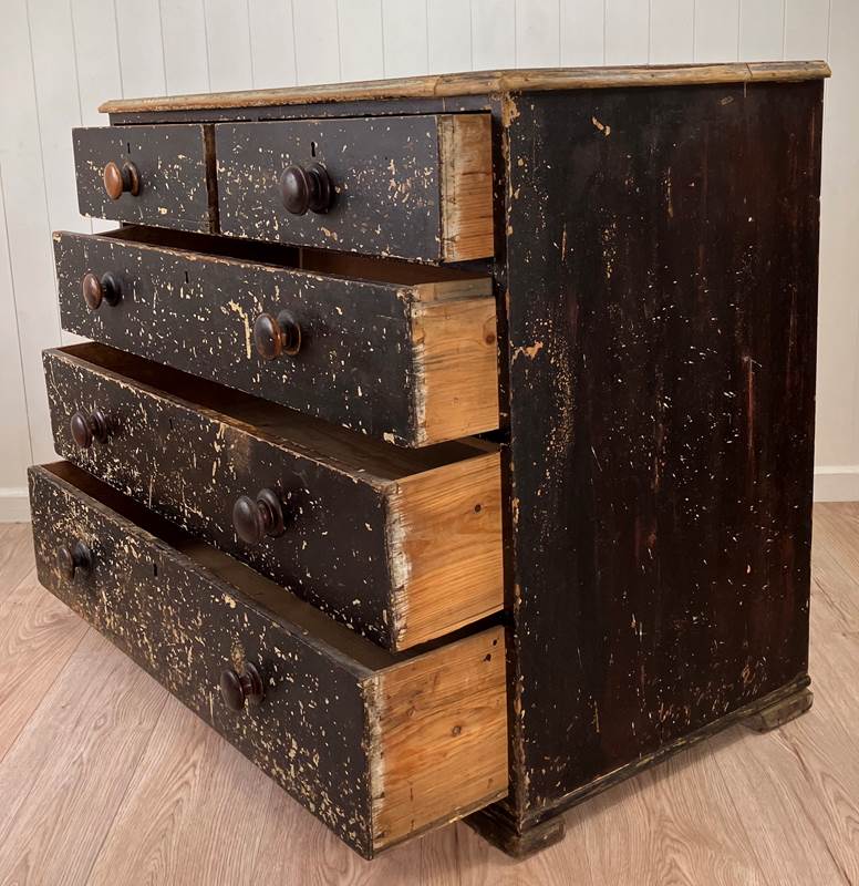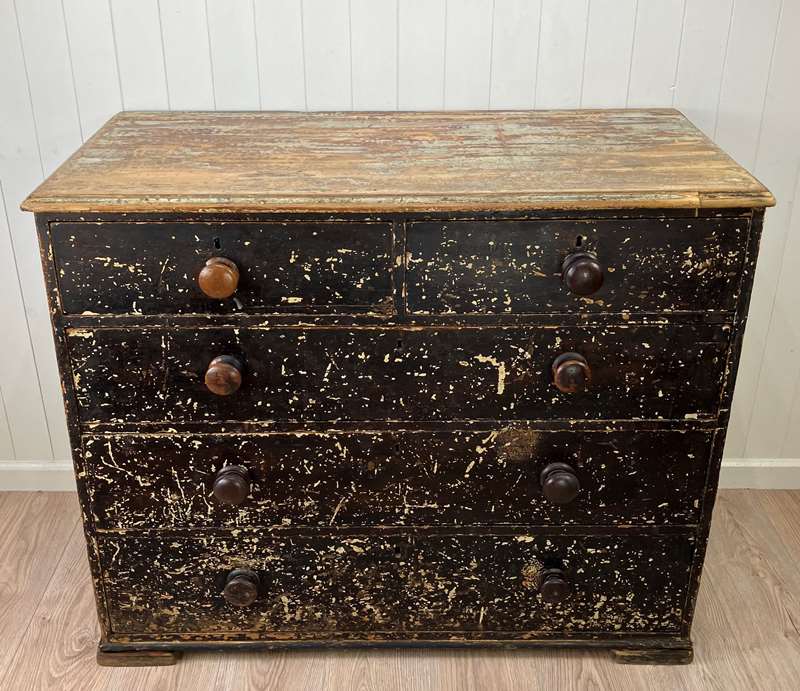This is a striking chest of drawers with layers of very old paint giving it tremendous texture on both the base and the top. The original old wooden handles in variegated shades add to its character. As well as being eye-catching, it’s also a thoroughly practical piece of furniture with large, deep drawers – two short over three long. The backplate of one of the handles is broken (please see listing images), but the handles are all intact.