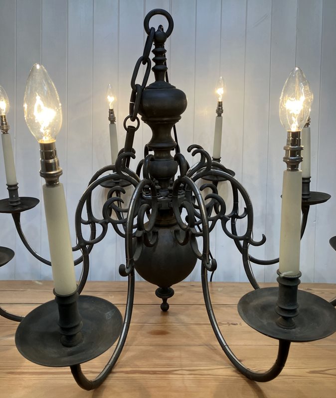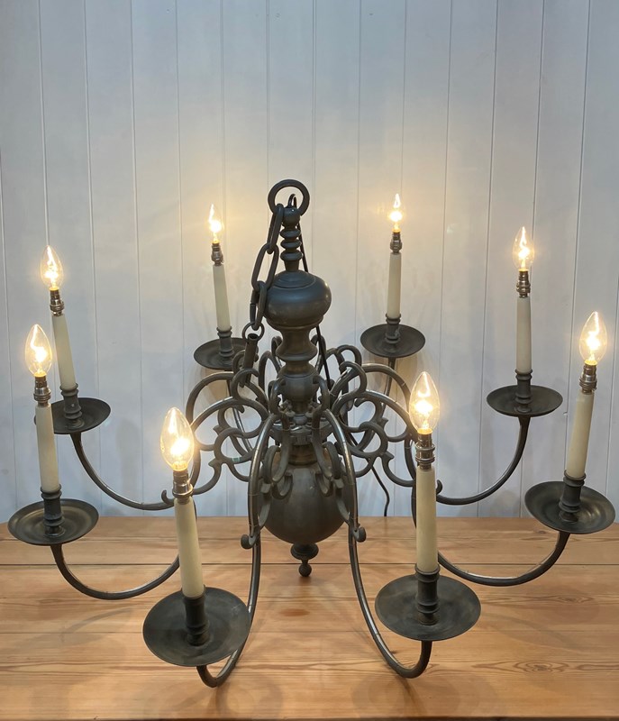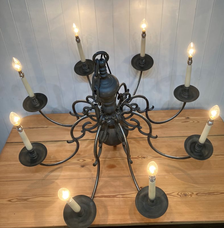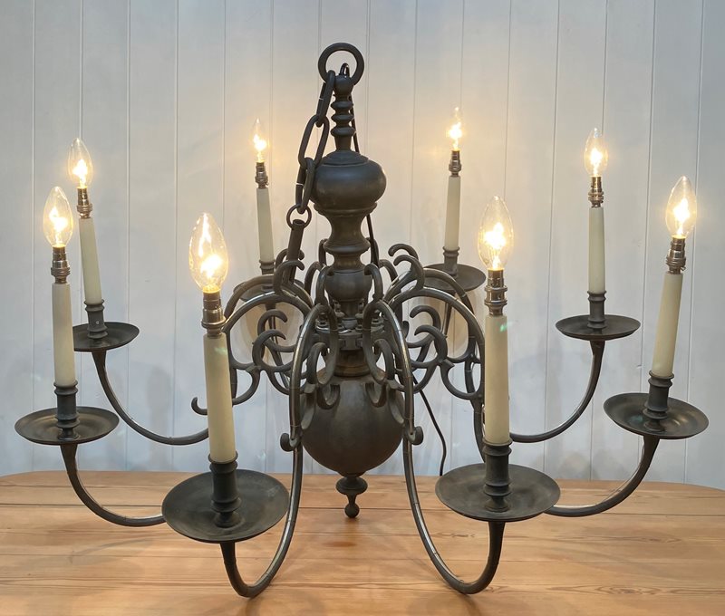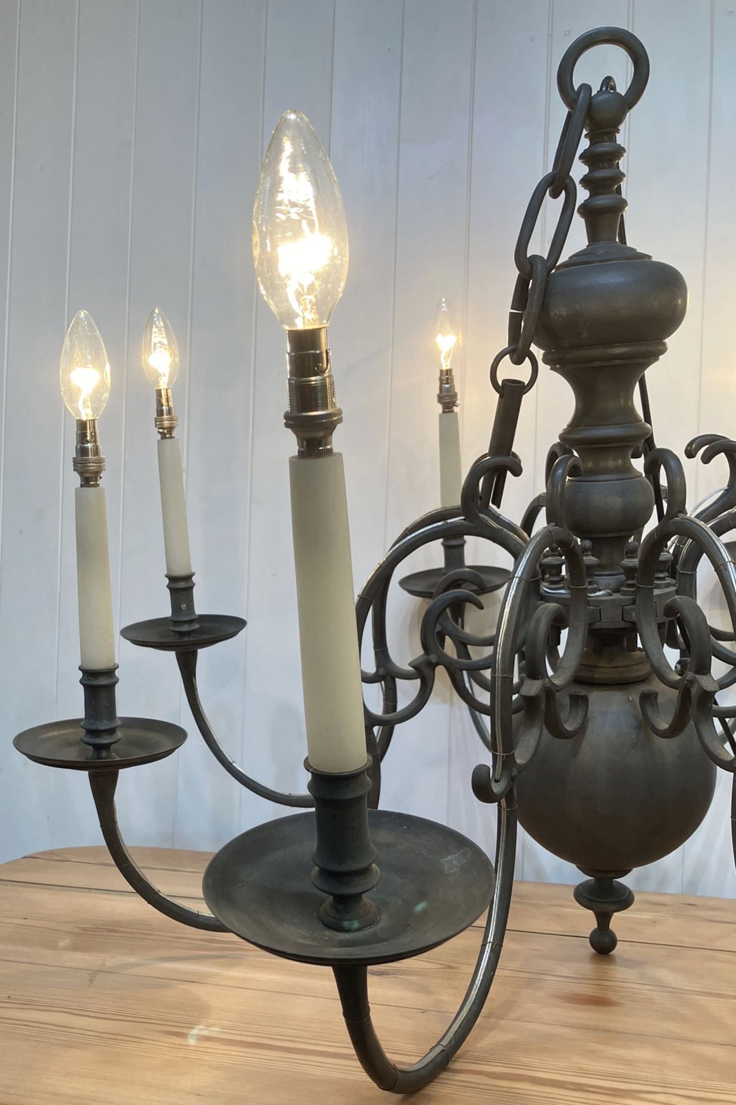 An impressive, large eight-arm Dutch chandelier with attractive matt grey/green patina to the metal, this probably dates from the early 20th century. With its sweeping curved arms and decorative scroll detailing, it’s a very elegant light fitting. The distinctive ball on Dutch chandeliers wasn’t just a decorative element – it also served as a weight at the base of the fitting to make it more stable.
