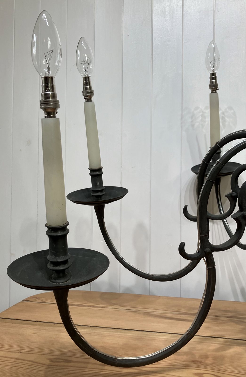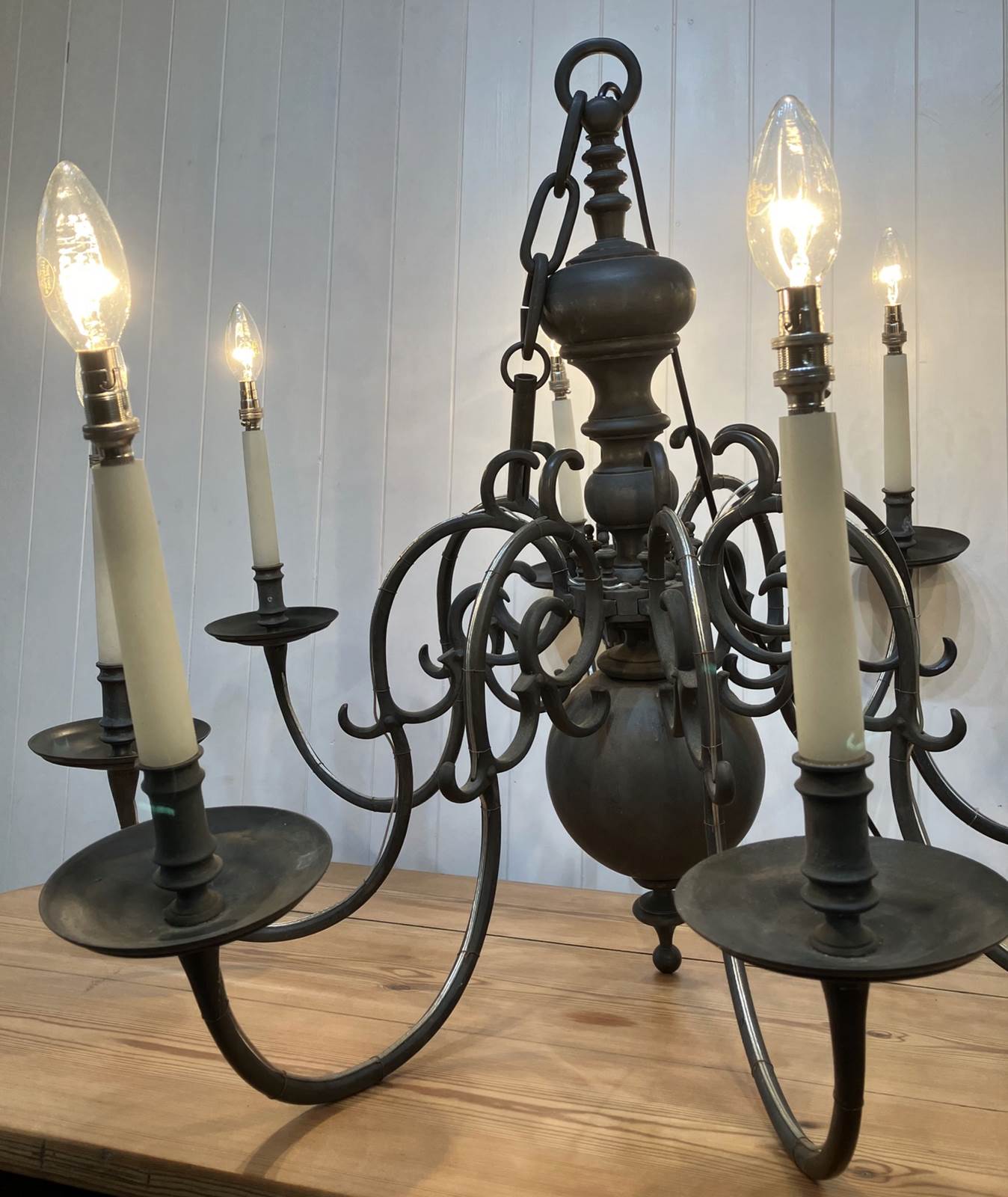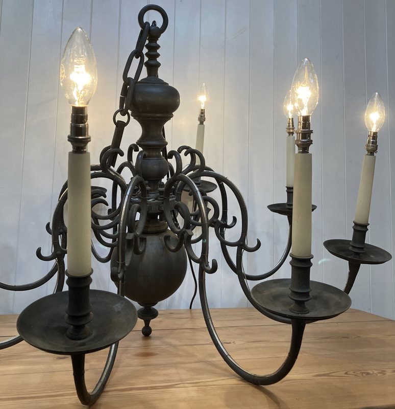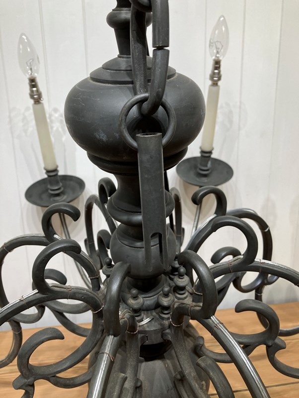 An impressive, large eight-arm Dutch chandelier with attractive matt grey/green patina to the metal, this probably dates from the early 20th century. With its sweeping curved arms and decorative scroll detailing, it’s a very elegant light fitting. The distinctive ball on Dutch chandeliers wasn’t just a decorative element – it also served as a weight at the base of the fitting to make it more stable.
