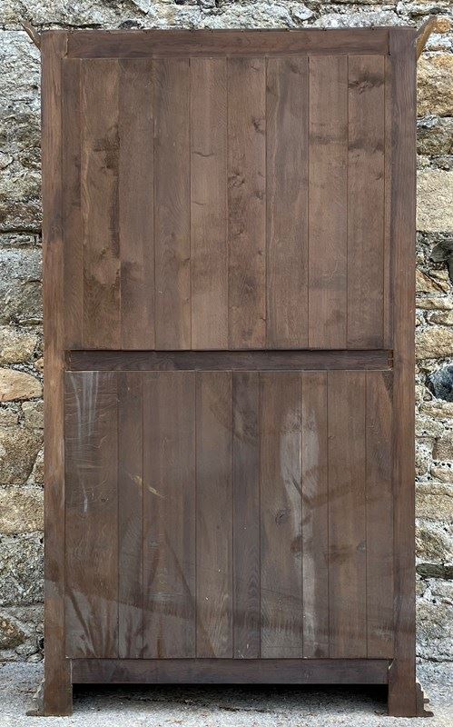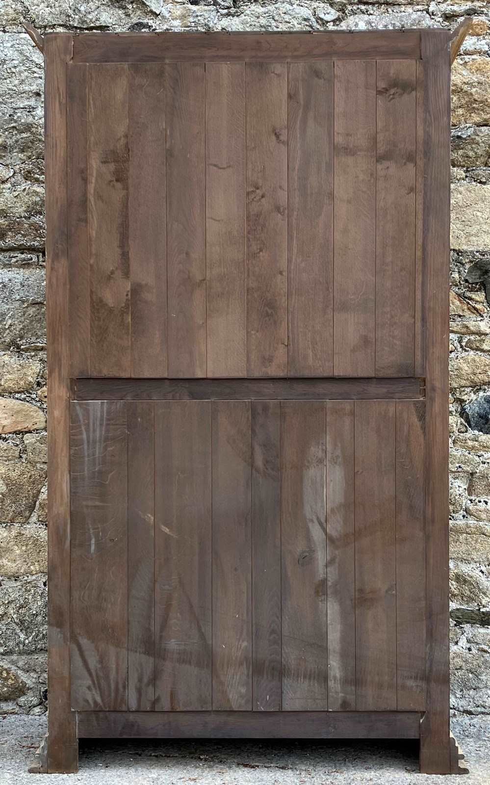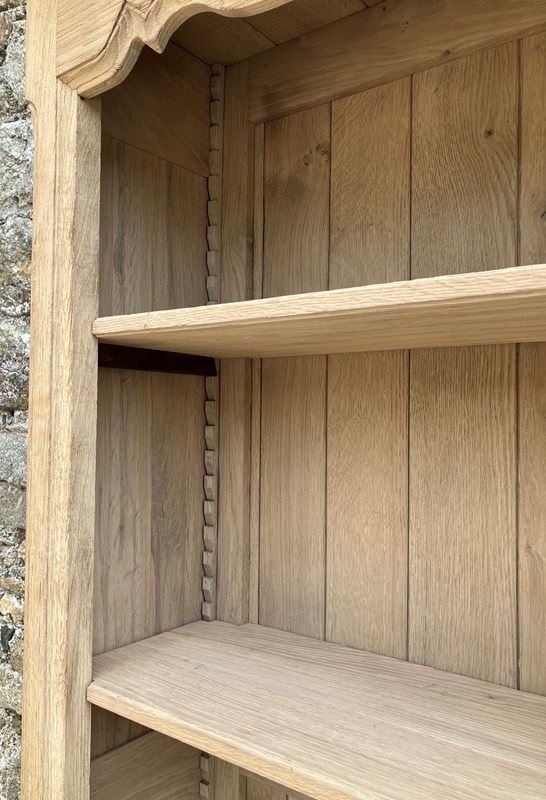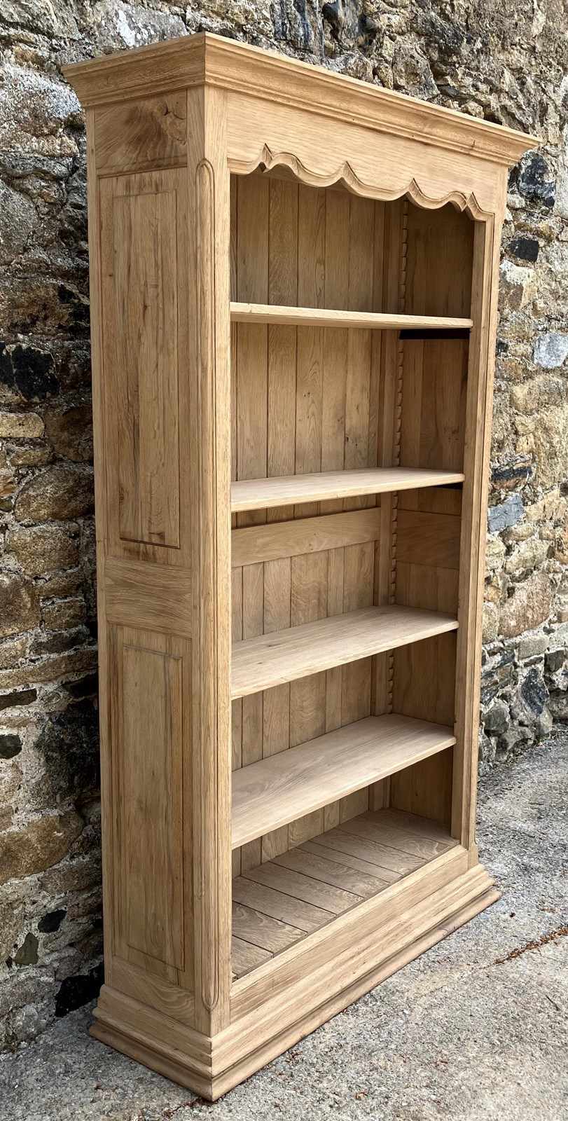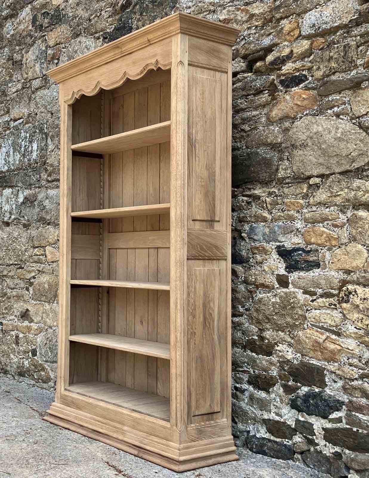 An impressive, large oak bookcase from France. This imposing bookcase has very attractive detailing and four adjustable shelves. The oak has been sandblasted, which really brings out the texture of the wood and gives it a very natural look.